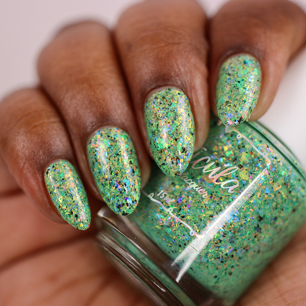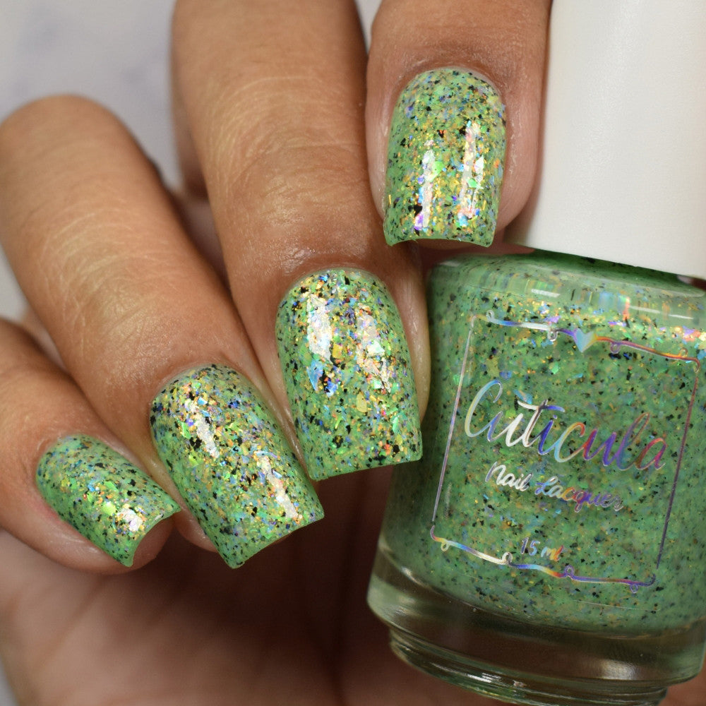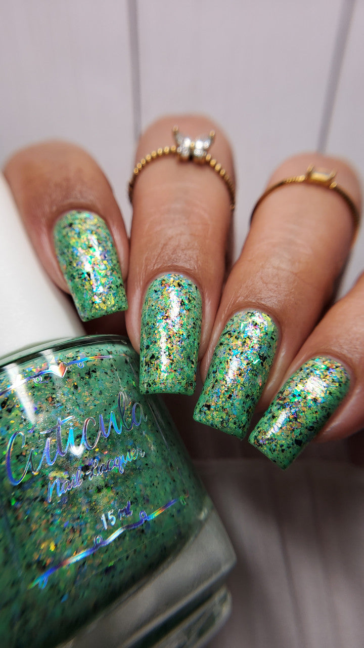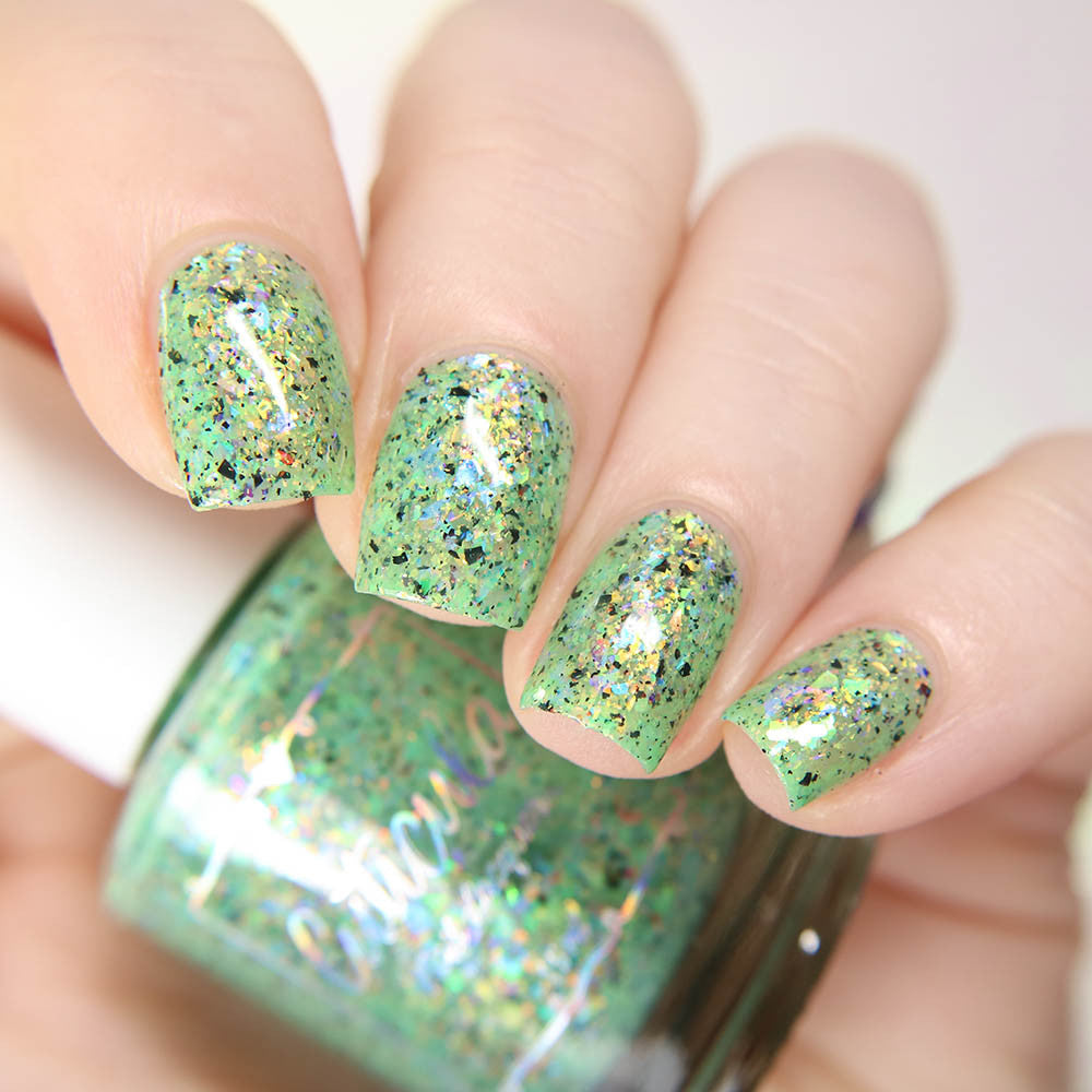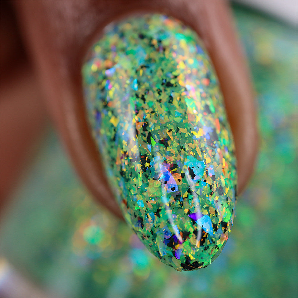 A honeydew crelly base full of rainbow shifting glass flakes, and black flakes.