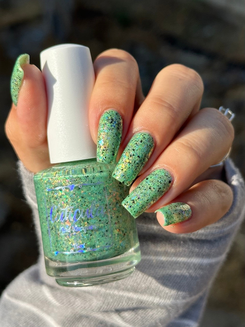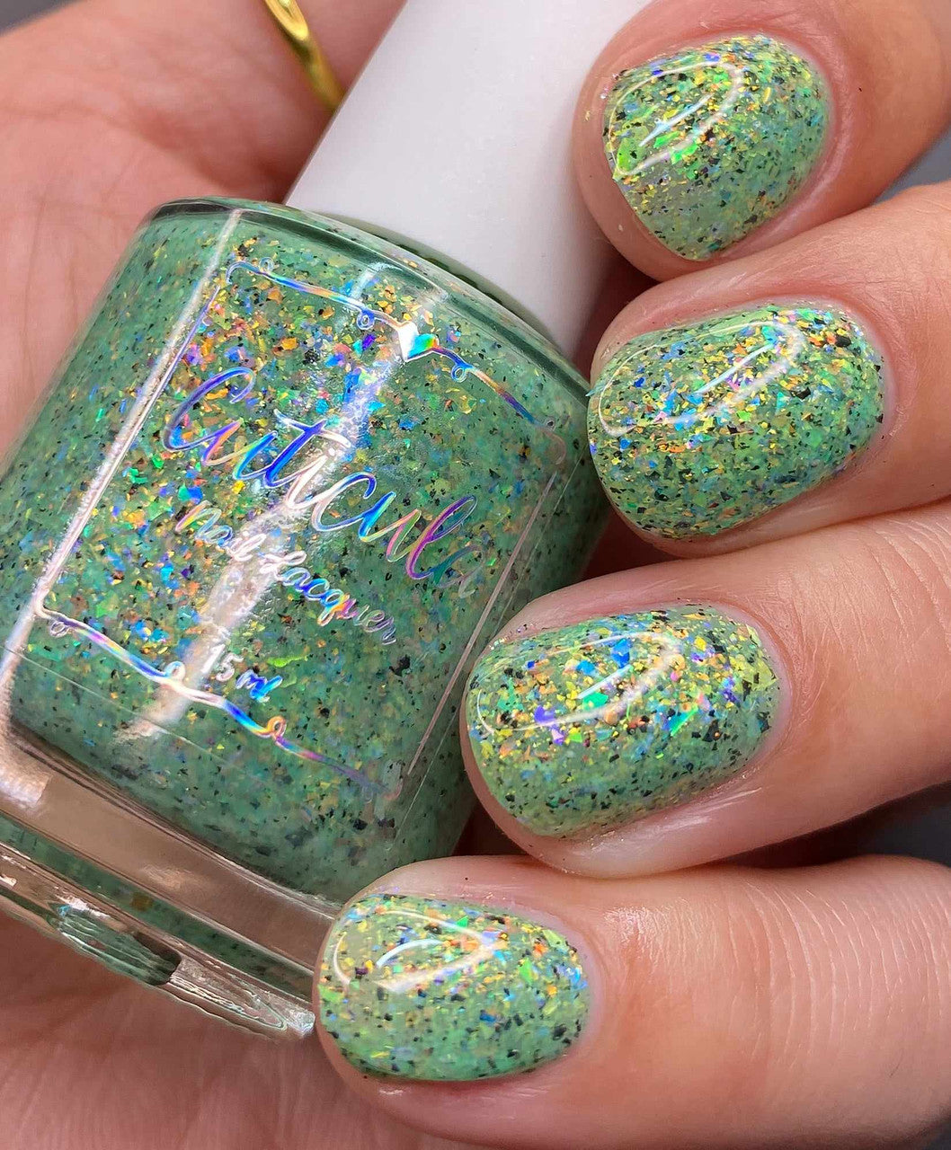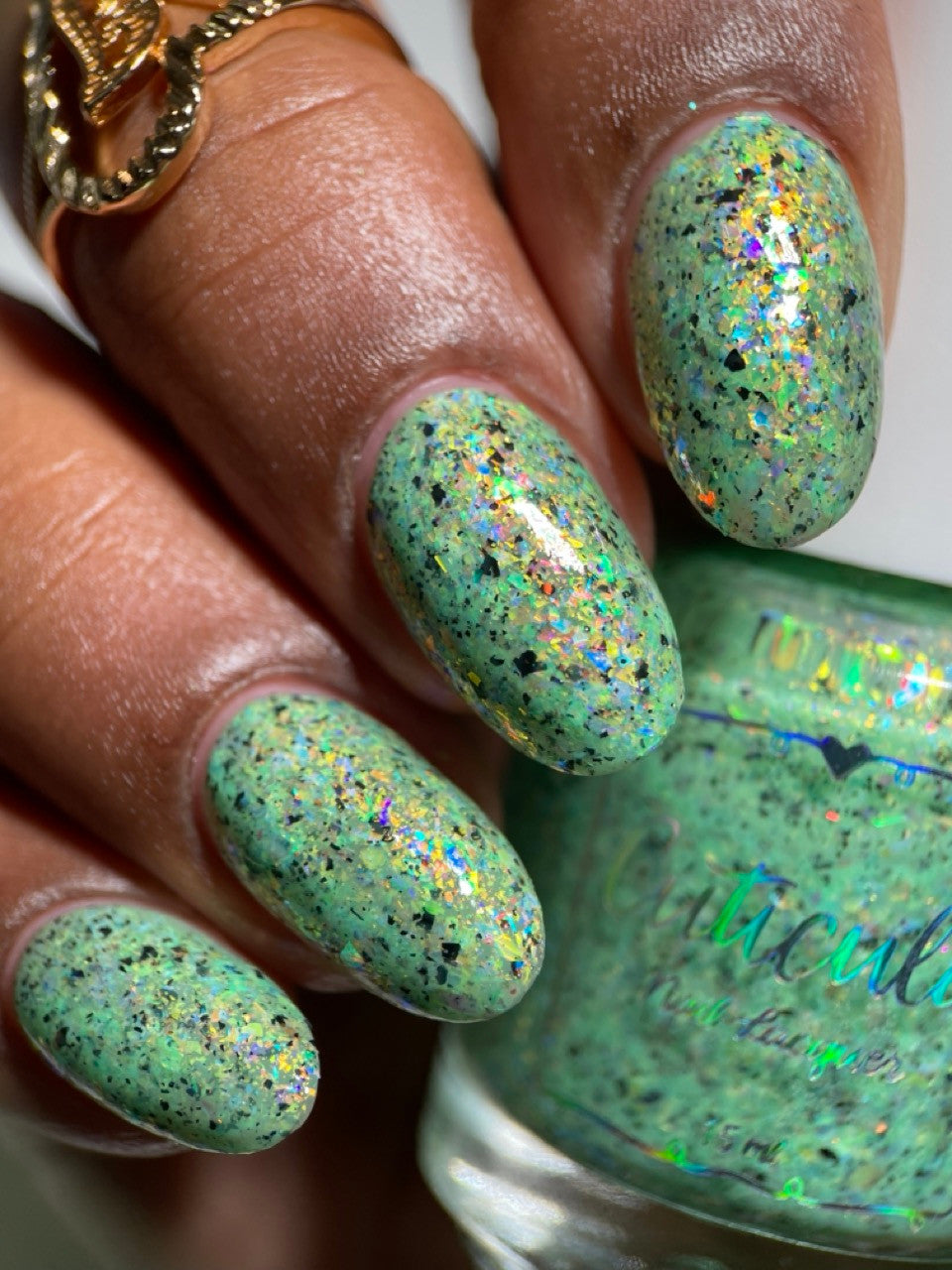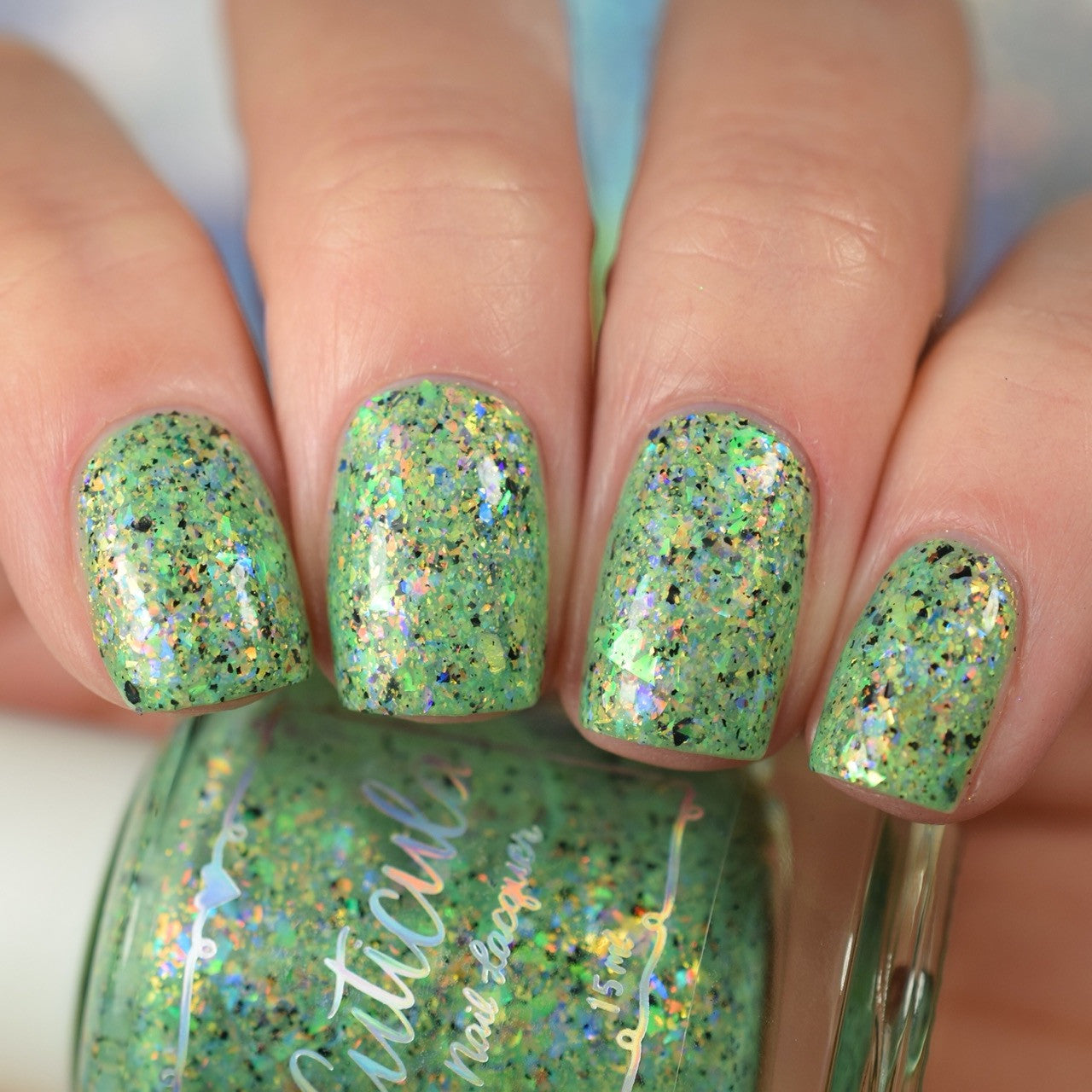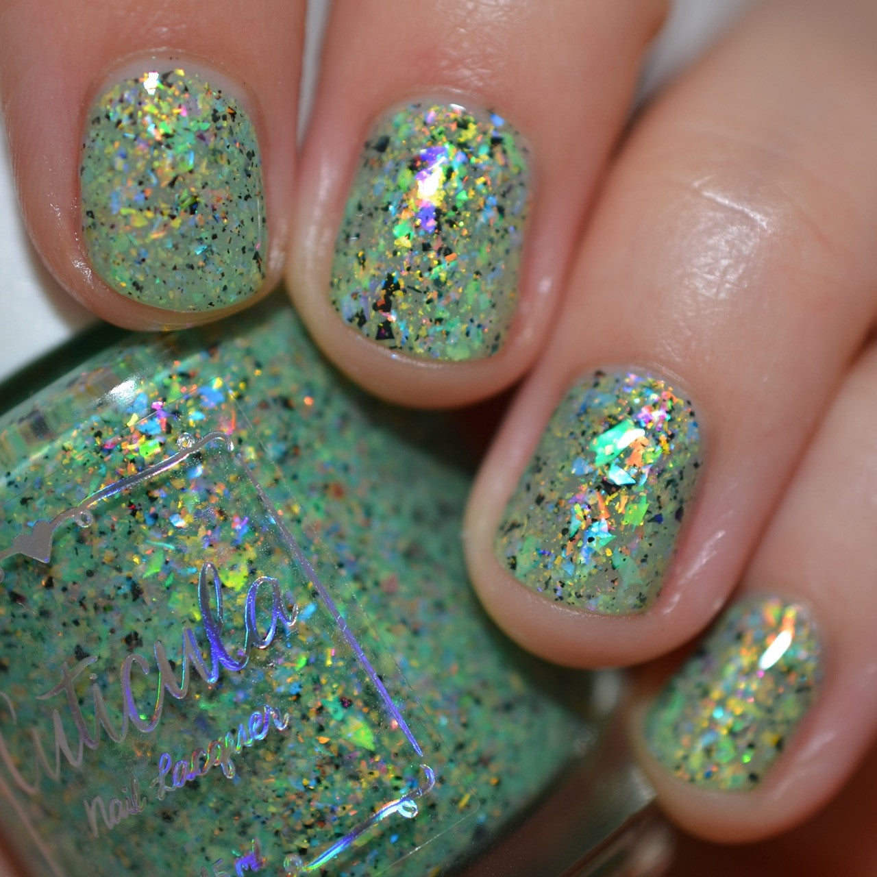 A honeydew crelly base full of rainbow shifting glass flakes, and black flakes.