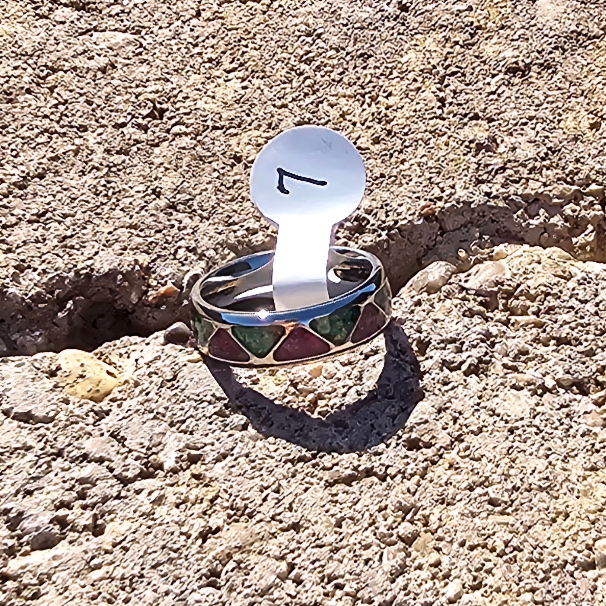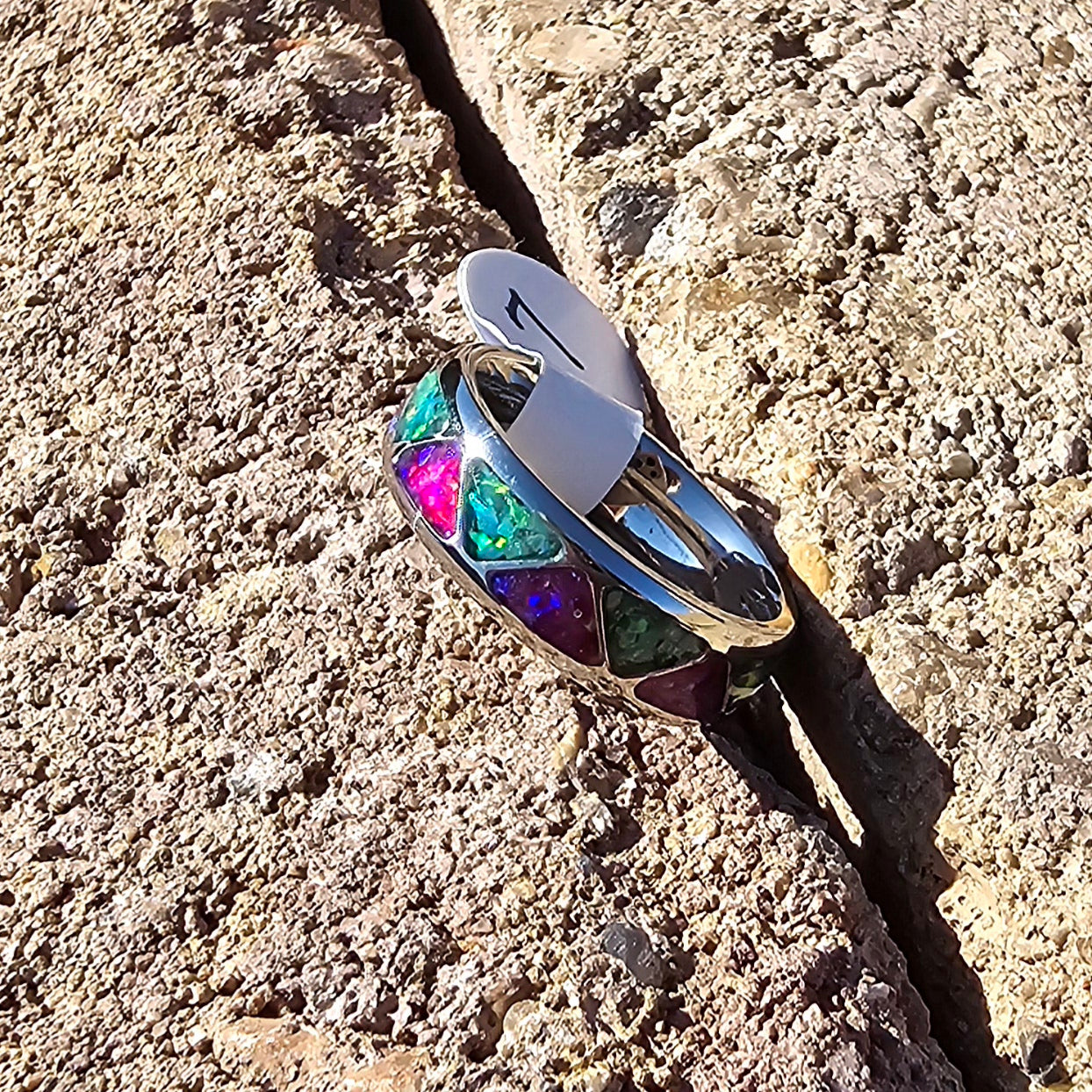6mm stainless steel isosili design, inlayed with green and purple opals, size 7