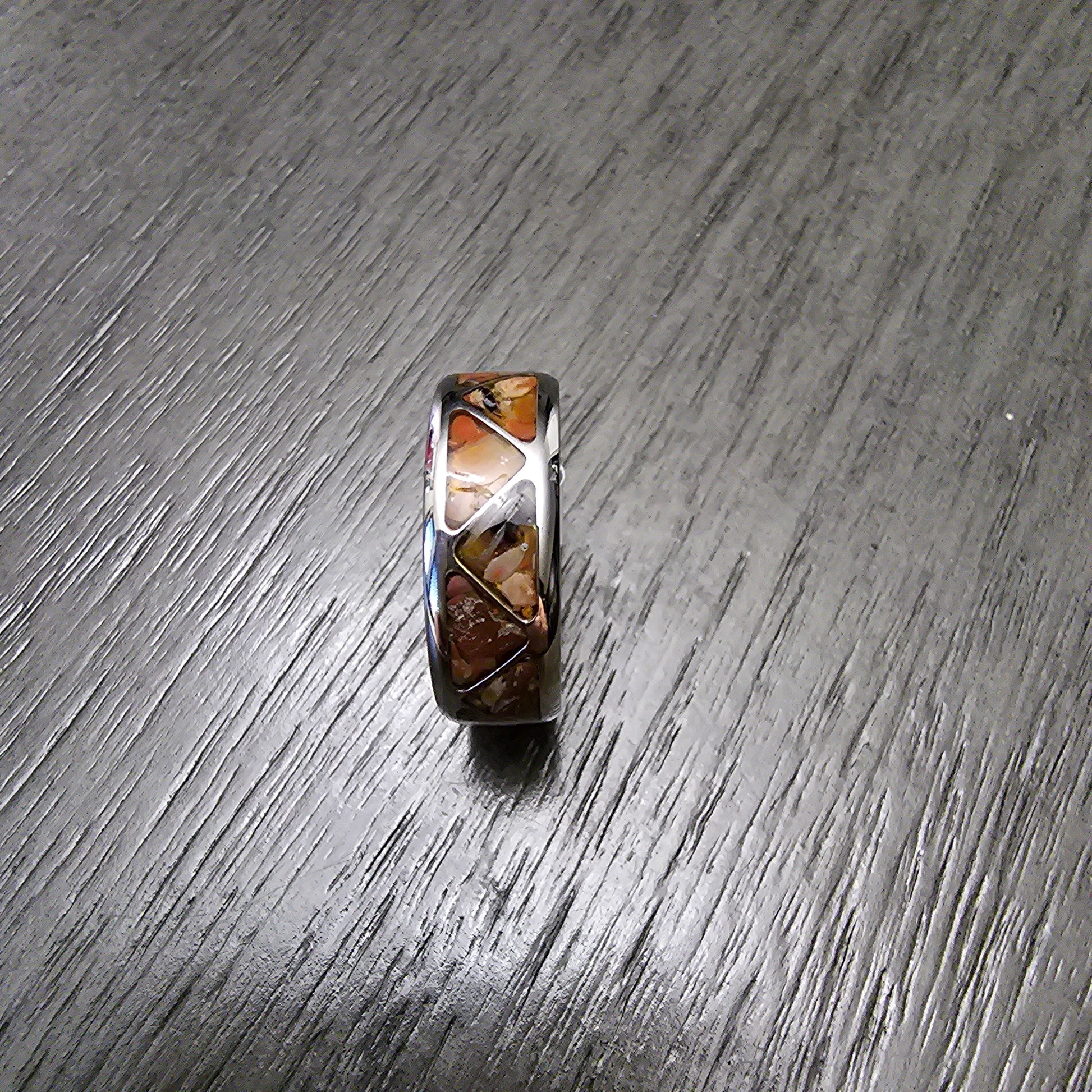 8mm stainless steel isosili design, inlayed with polished Arizona petrified wood, size 10.5