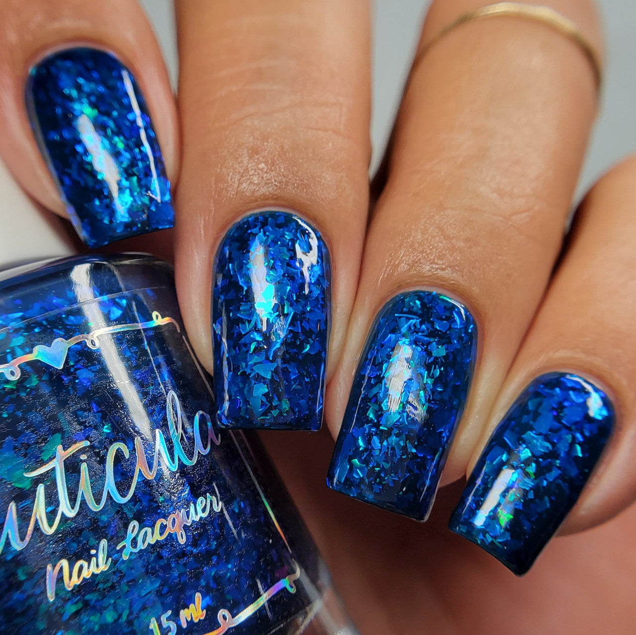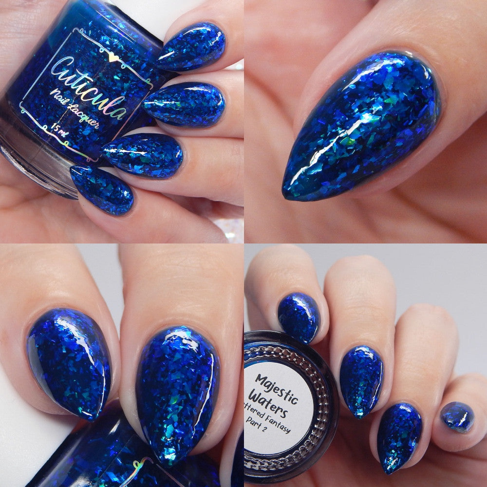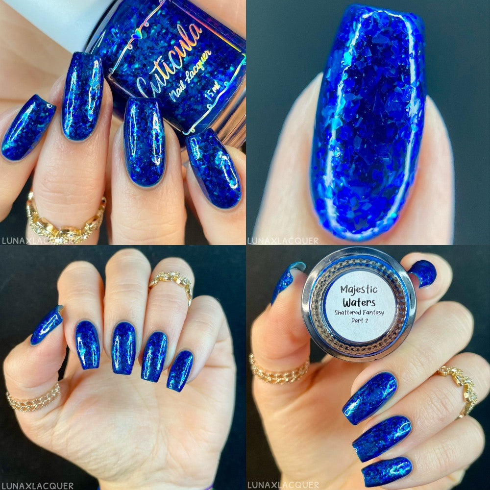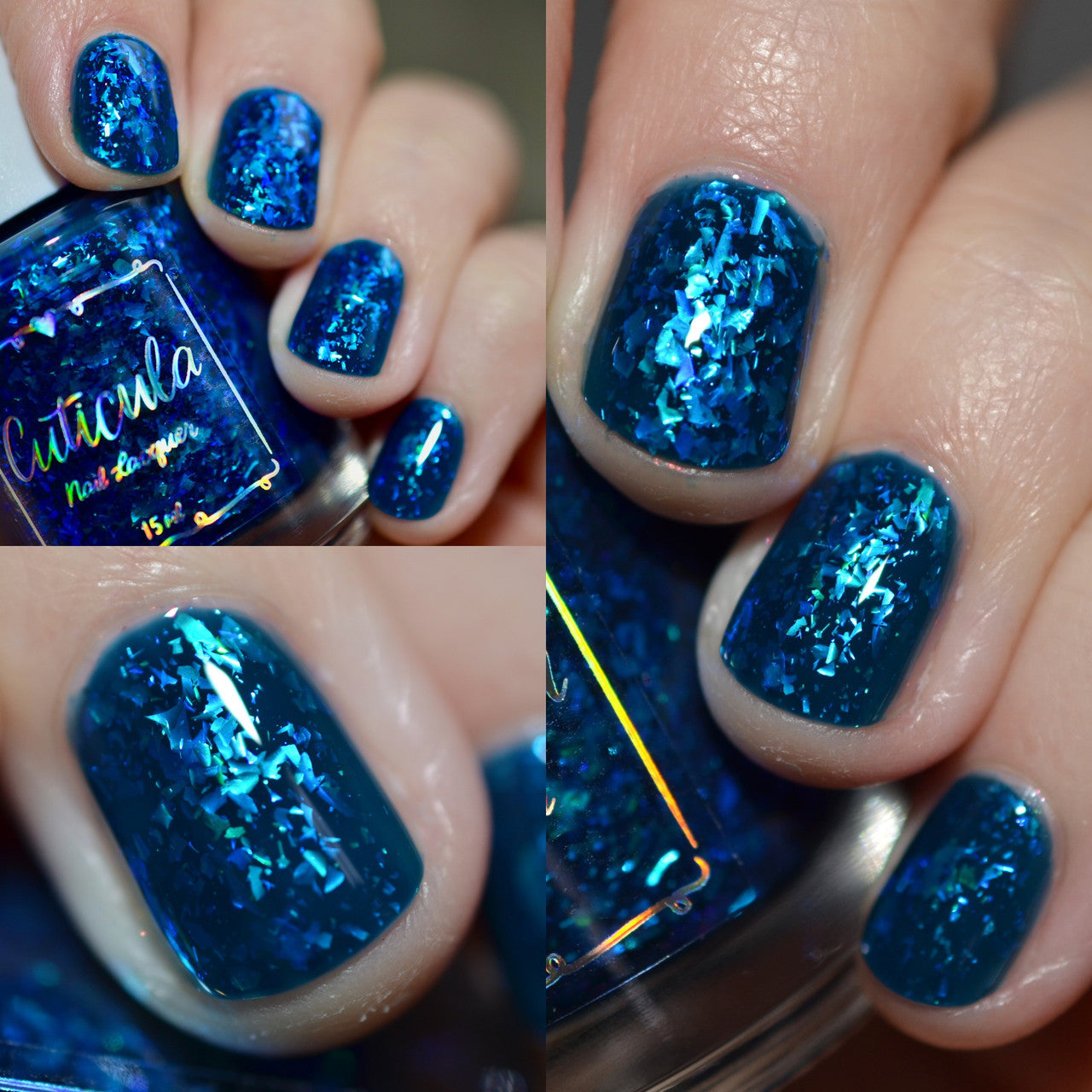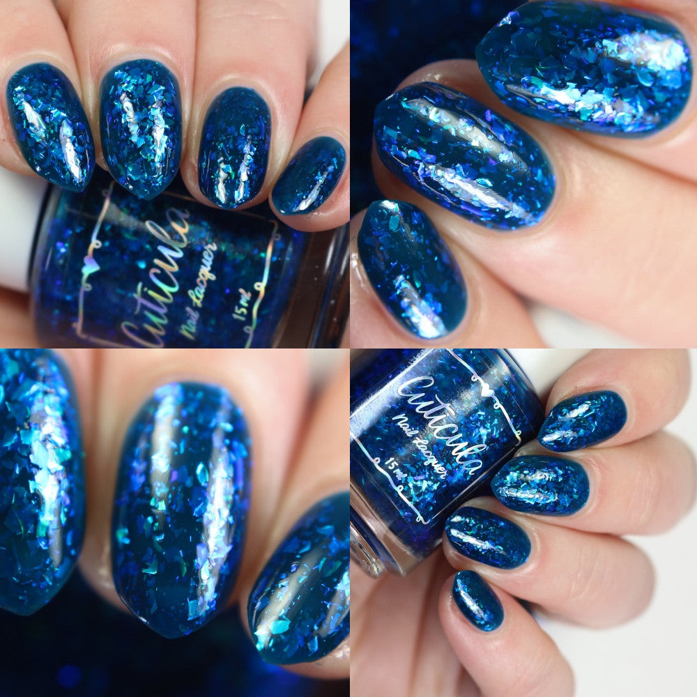 'Majestic Waters' a blue jelly base with blue/purple/green shifting glass flakes. Perfectly opaque in 3 coats.