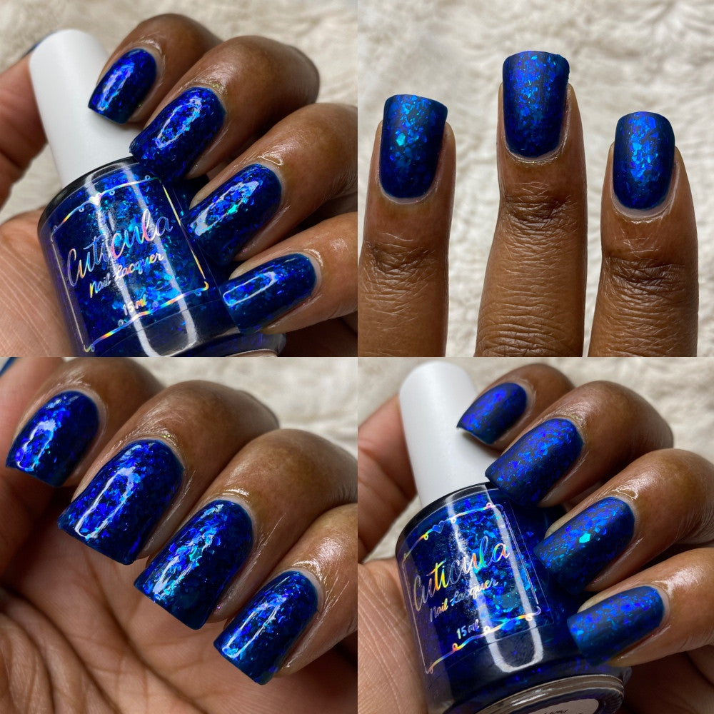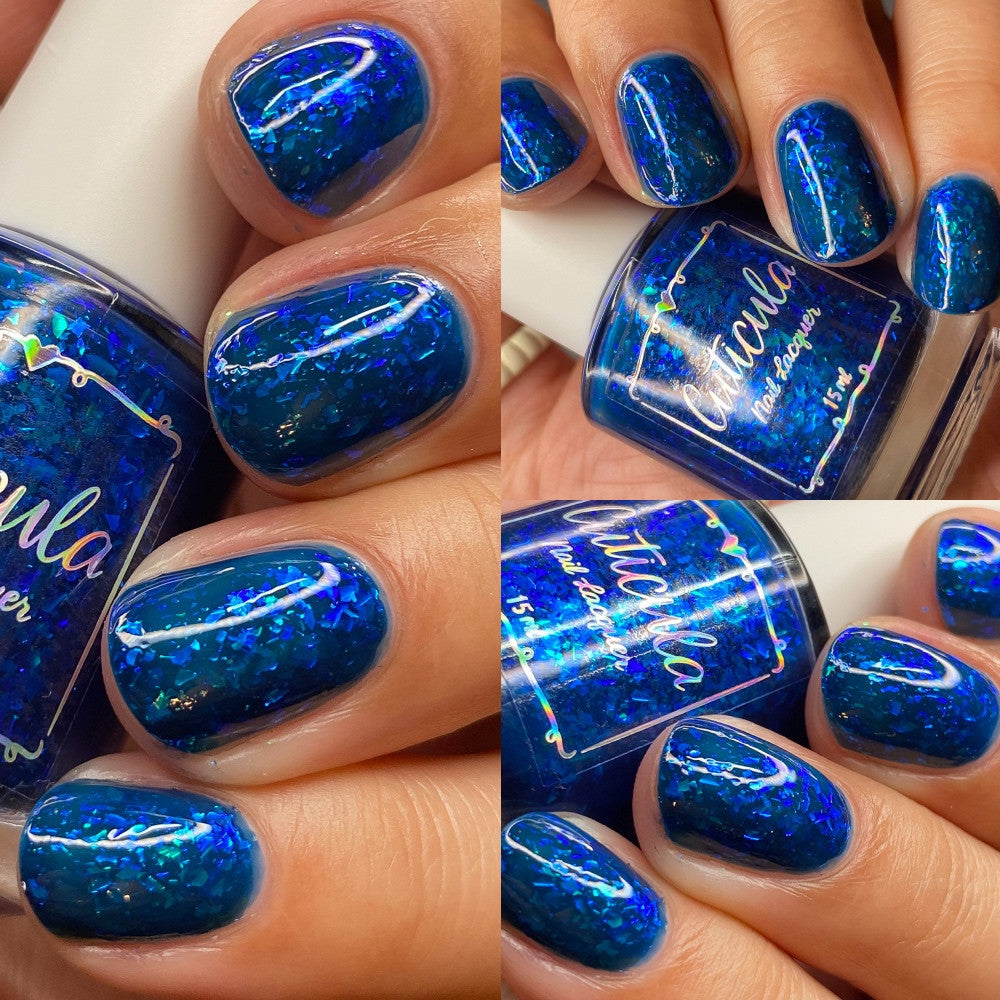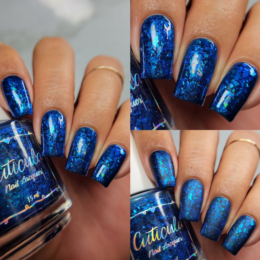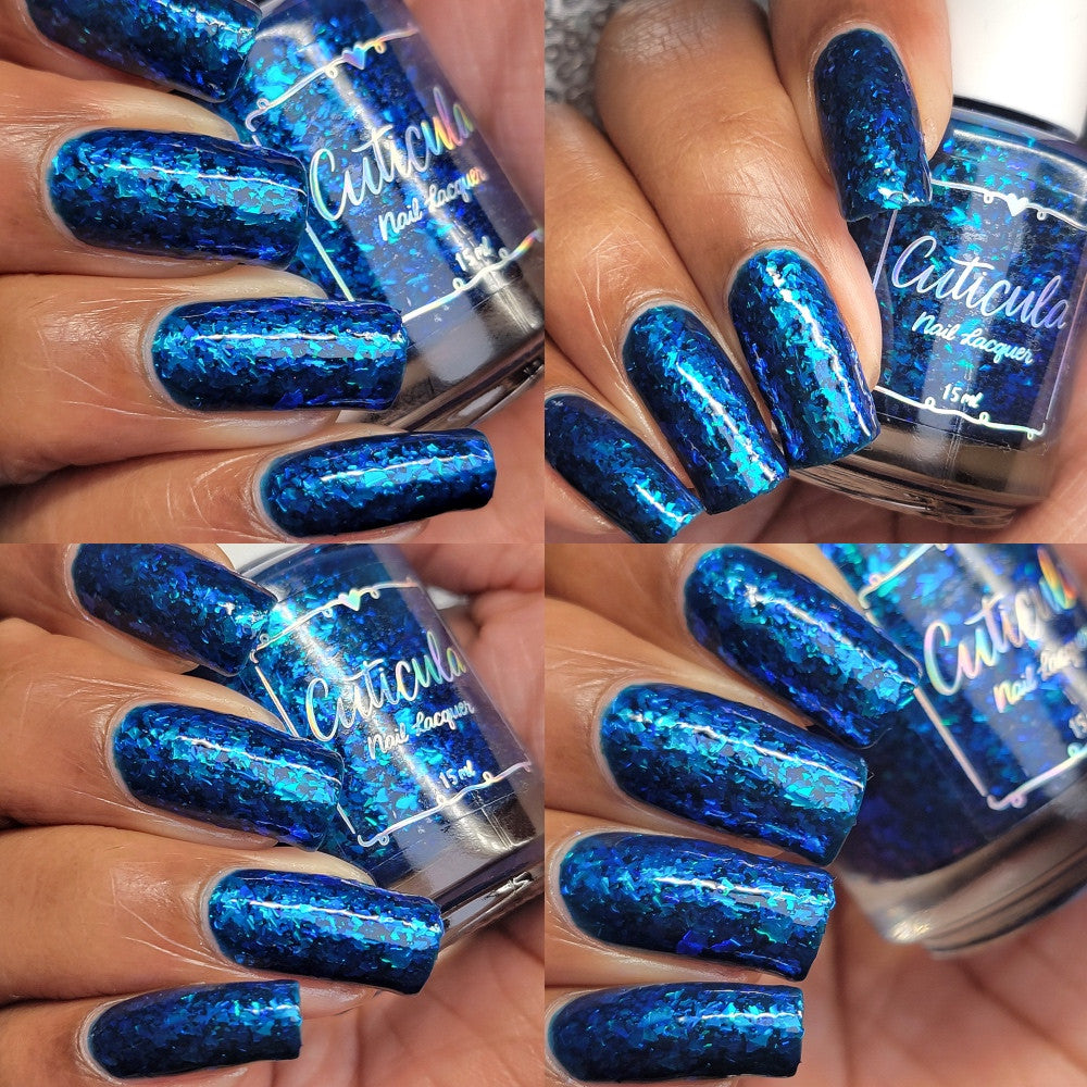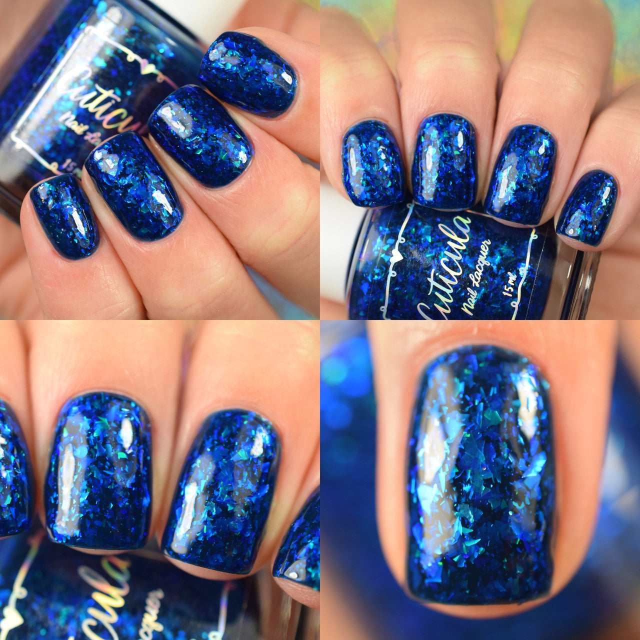 'Majestic Waters' a blue jelly base with blue/purple/green shifting glass flakes. Perfectly opaque in 3 coats.