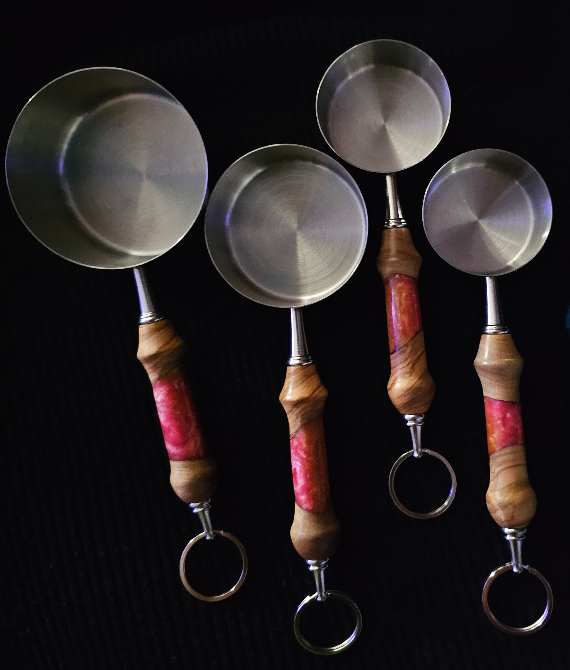 Measuring Cups-Handmade with beautiful Olive wood with Pink and Gold Resin.