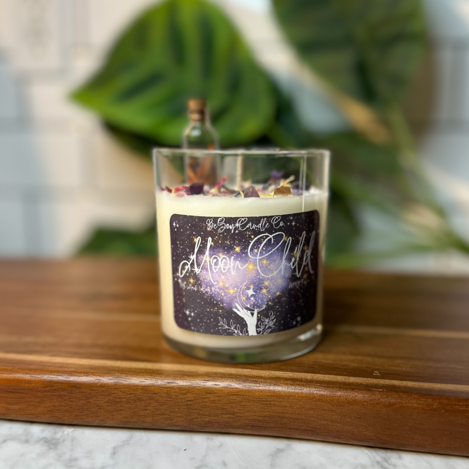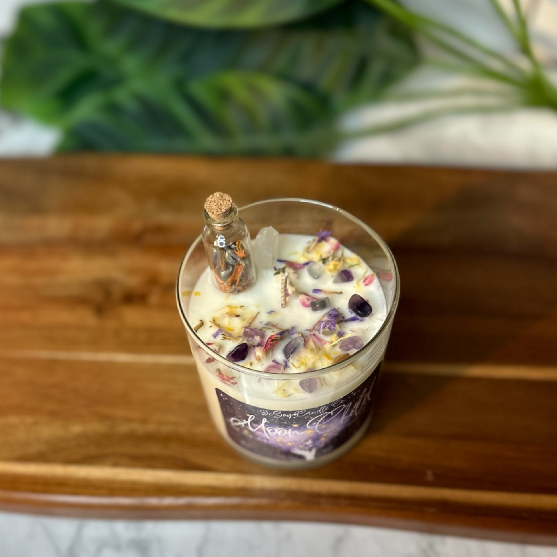 Infused with the enchanting aroma of Nag Champa and adorned with dried flowers and crystals on top, this candle is a tribute to the celestial beauty and spiritual energy of the moon. Nag Champa’s exotic and calming fragrance combines with the natural elements of dried flowers and crystals to create a harmonious sensory experience that soothes the soul and uplifts the spirit.