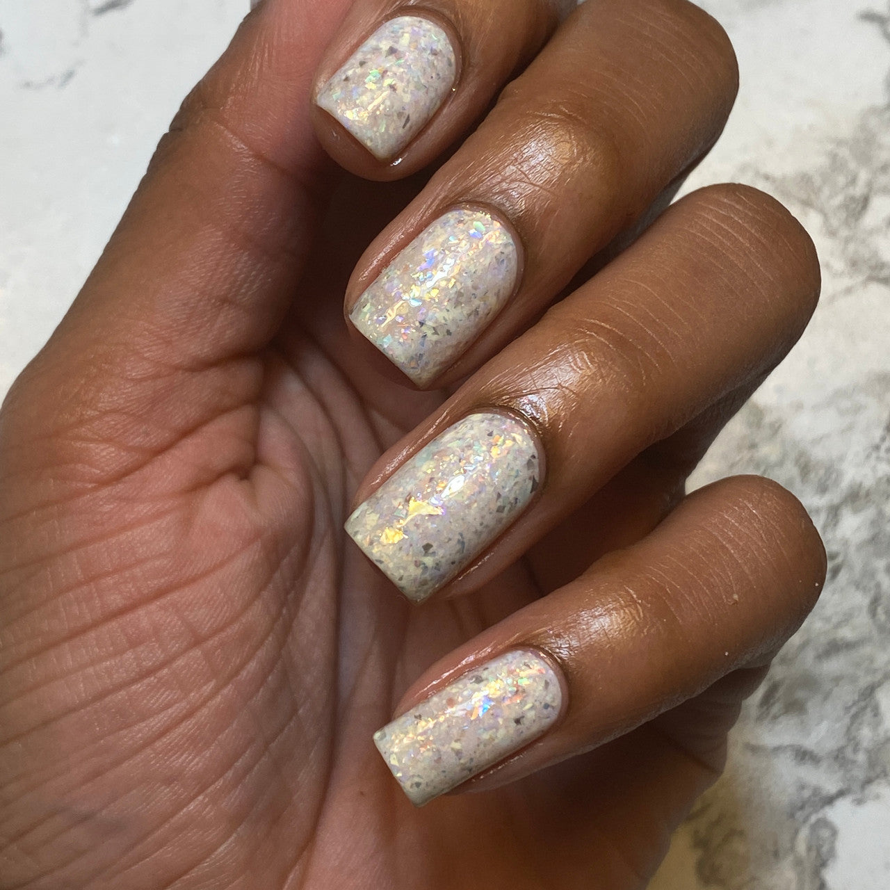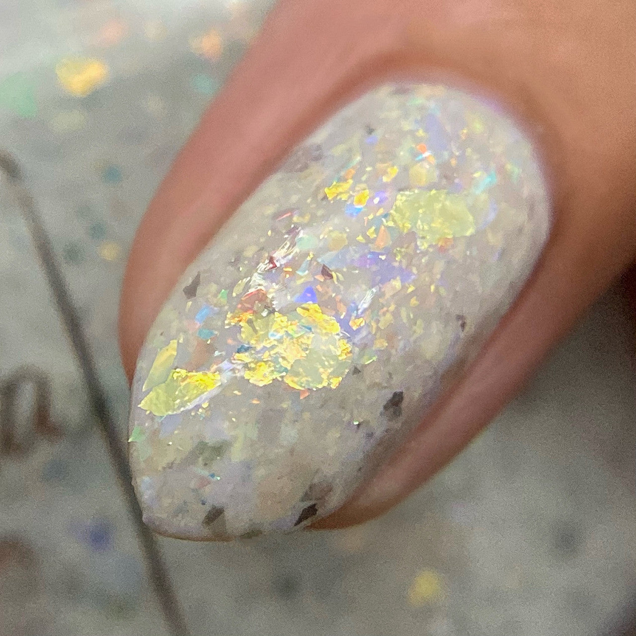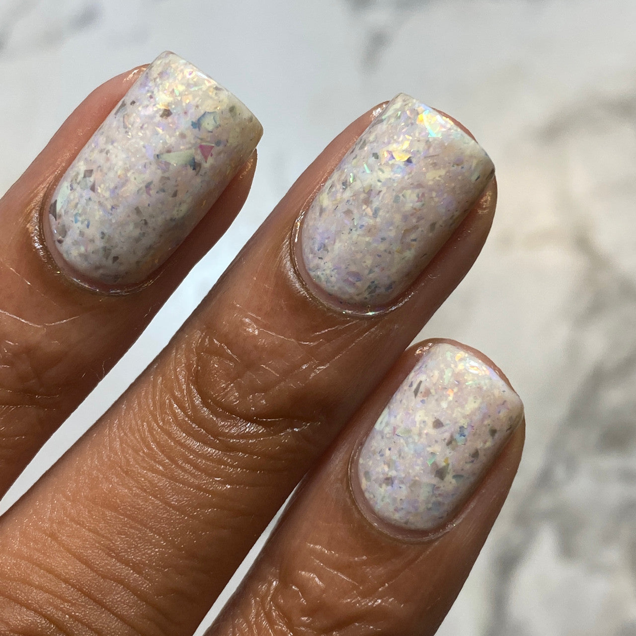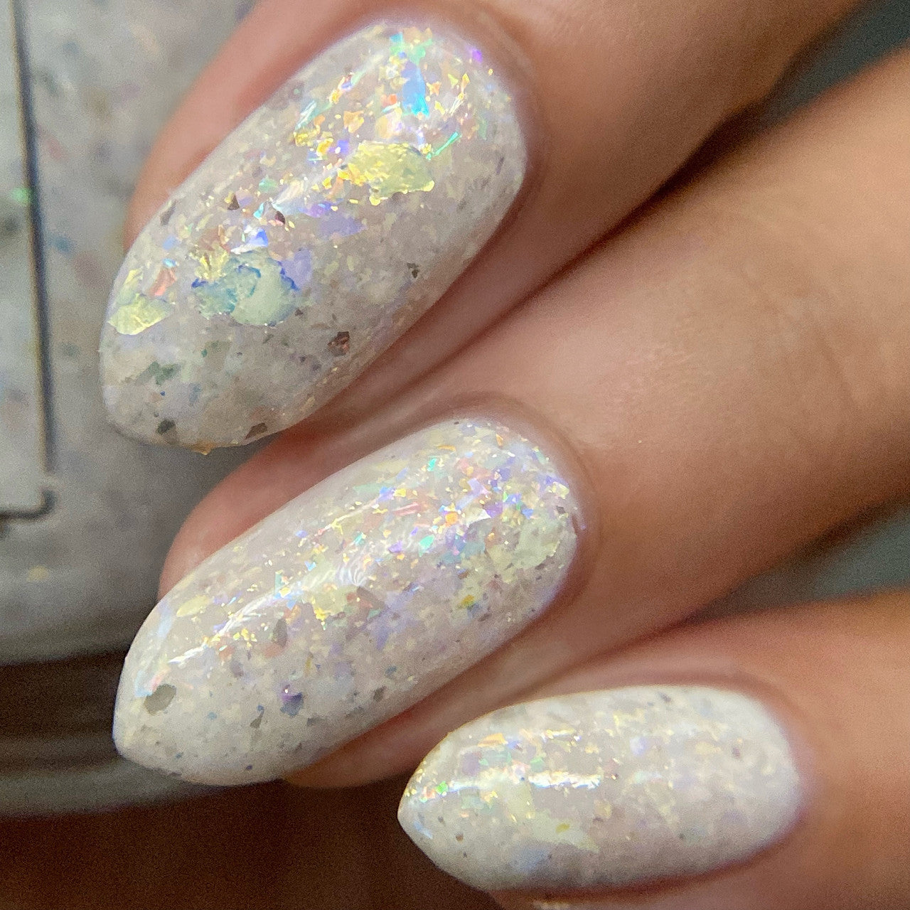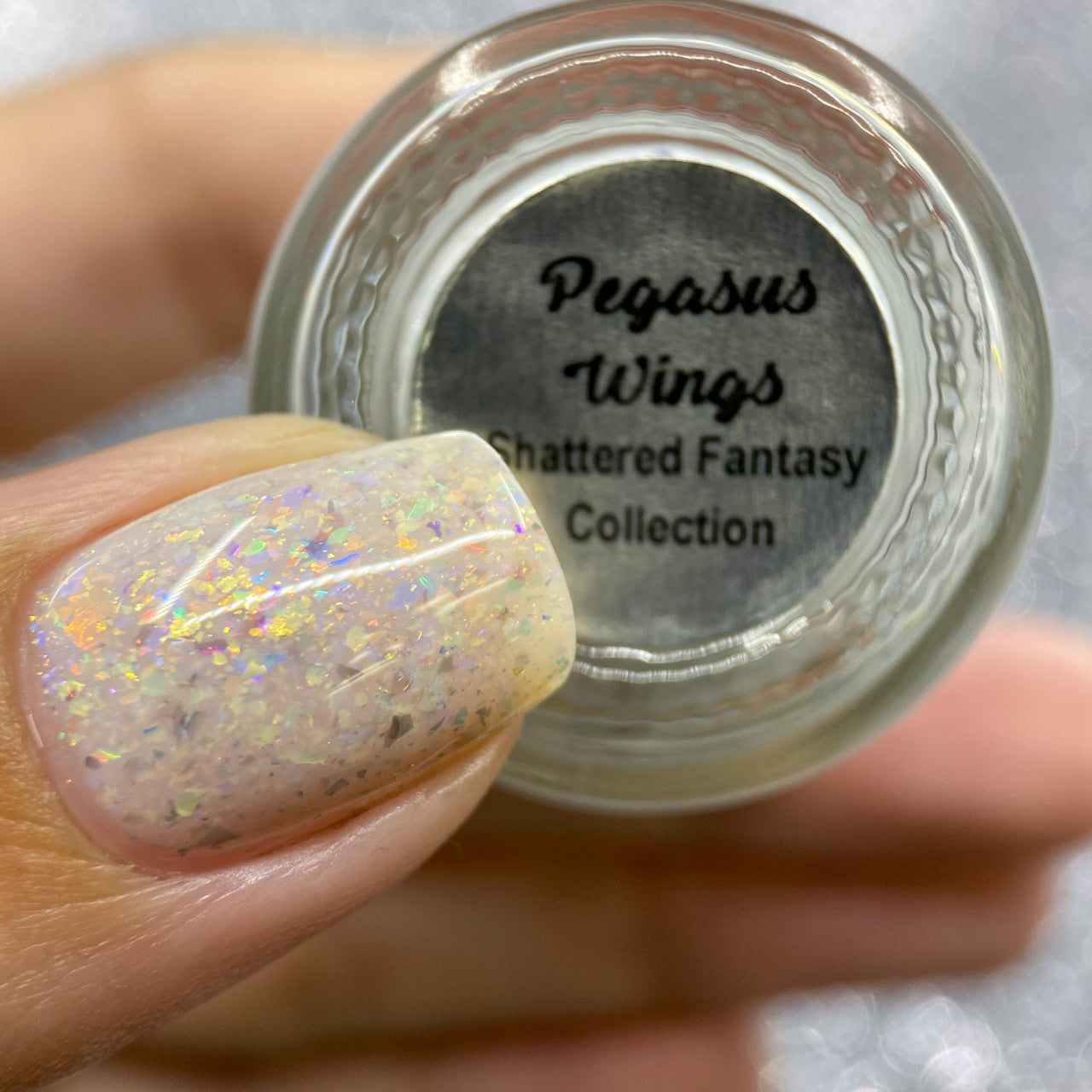 Pegasus Wings: Shattered Fantasy Collection 'Pegasus Wings' a white crelly base with yellow gold, orange/gold, purple/red, blue/purple, green/blue, and blue/purple/green shifting glass like flakes. Please note that all 5 polishes (except the topper) were created to be worn in 3 coats. The third final coat really gives you the best color depth and flake payoff. For best results, start with any of our available base coats and finish off your mani with any of our available top coats. This nail polish is 5 Free Ingredients: Nitrocellulose, Ethyl Acetate, Butyl Acetate, Isopropyl Alcohol, Ethyl Alcohol, Triphenyl Phosphate, Propyl Acetate, n-Butyl Alcohol, Colorants. Swatches @happily_polished @andrussnails @lovelylacquerist @kreativelykoated @_always_polished_ @brown_beautycentral @polishwithrae @themermaidpolish