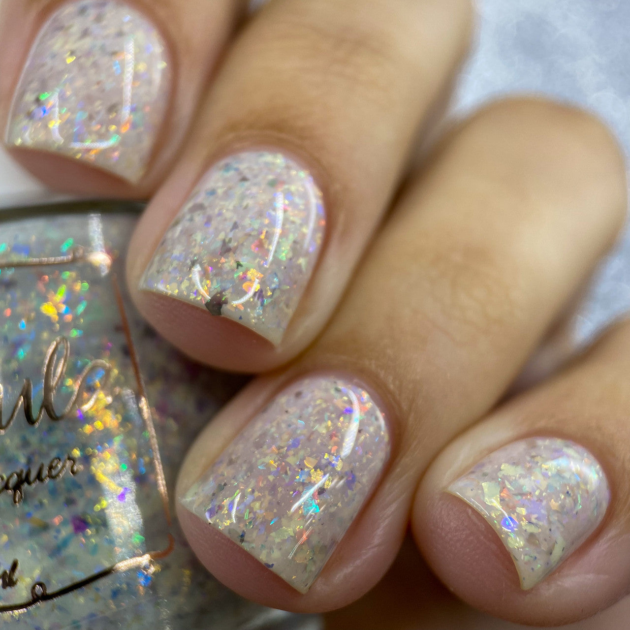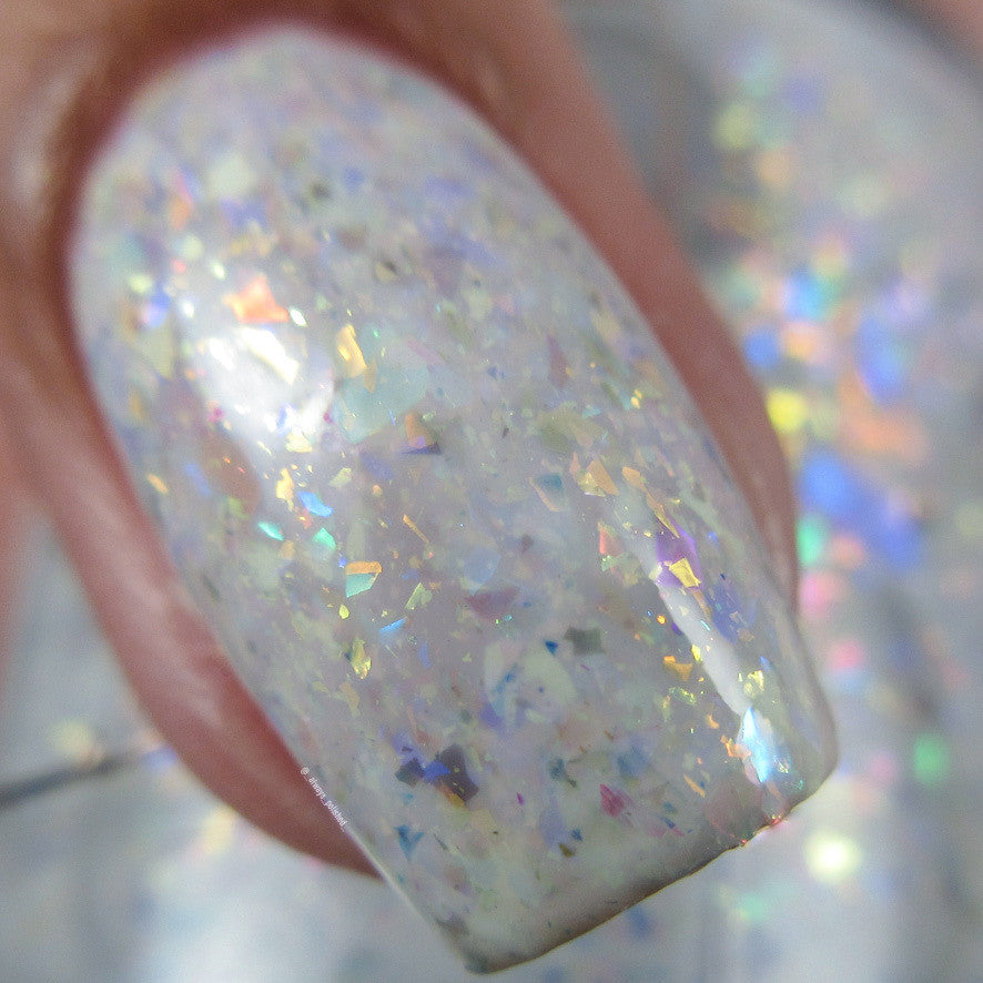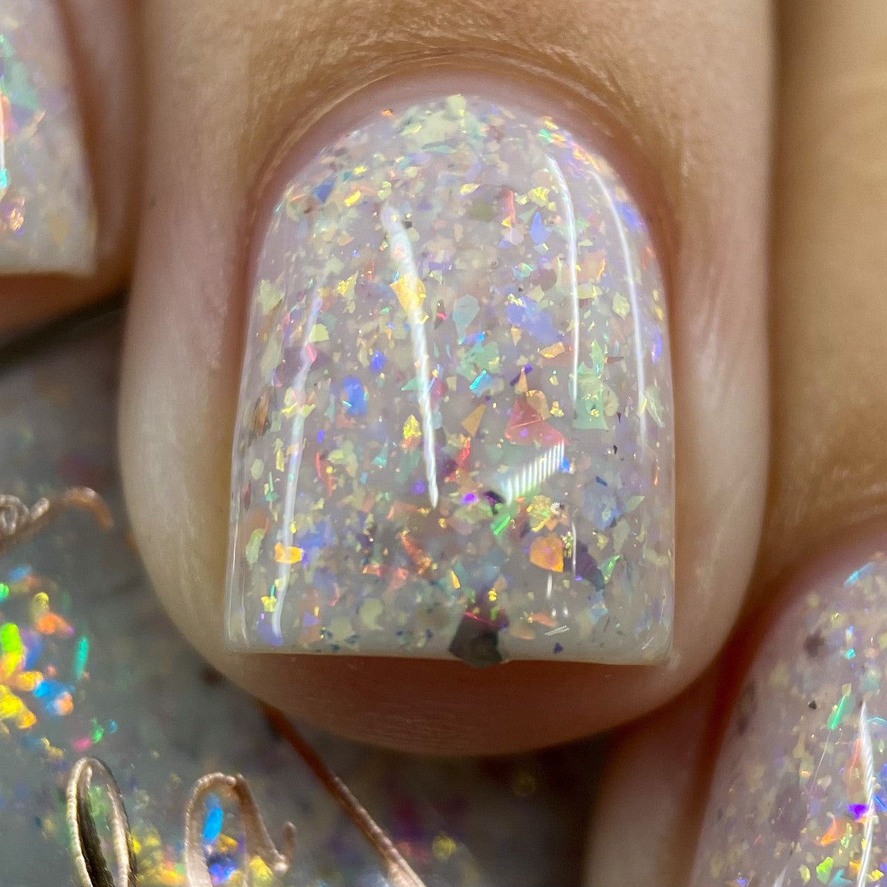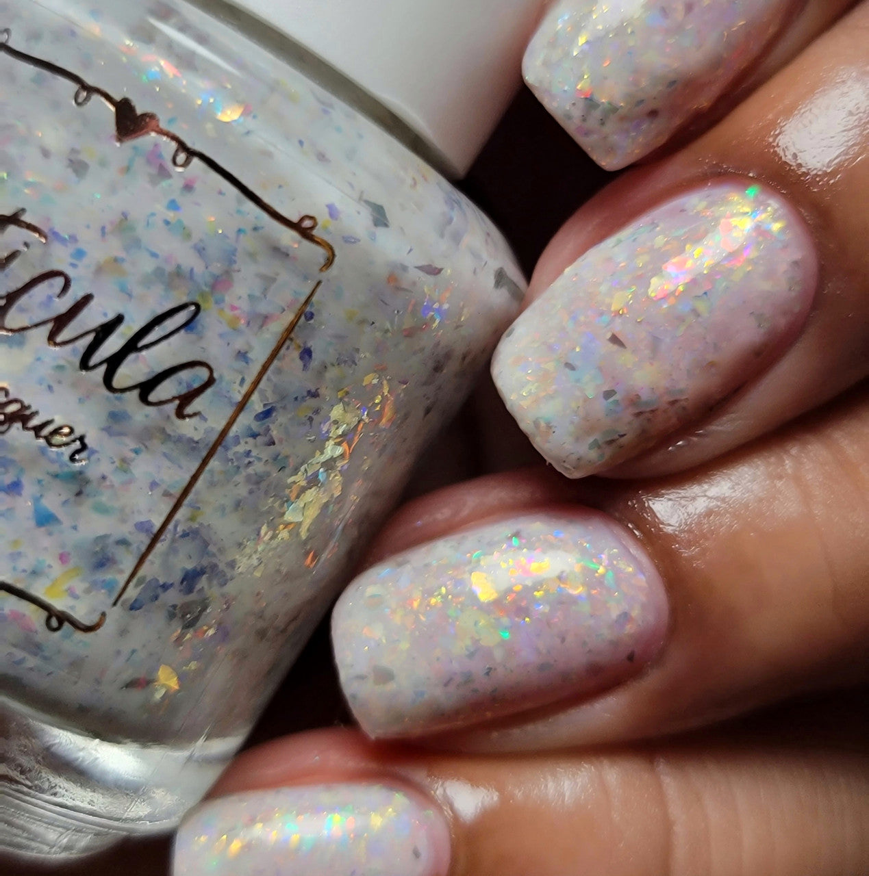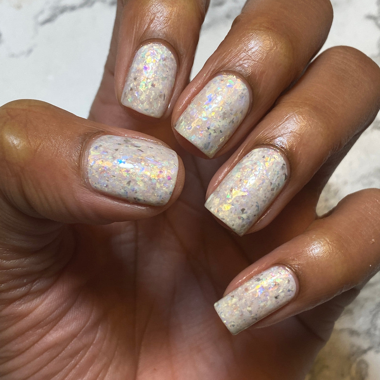 Pegasus Wings: Shattered Fantasy Collection 'Pegasus Wings' a white crelly base with yellow gold, orange/gold, purple/red, blue/purple, green/blue, and blue/purple/green shifting glass like flakes. Please note that all 5 polishes (except the topper) were created to be worn in 3 coats. The third final coat really gives you the best color depth and flake payoff. For best results, start with any of our available base coats and finish off your mani with any of our available top coats. This nail polish is 5 Free Ingredients: Nitrocellulose, Ethyl Acetate, Butyl Acetate, Isopropyl Alcohol, Ethyl Alcohol, Triphenyl Phosphate, Propyl Acetate, n-Butyl Alcohol, Colorants. Swatches @happily_polished @andrussnails @lovelylacquerist @kreativelykoated @_always_polished_ @brown_beautycentral @polishwithrae @themermaidpolish