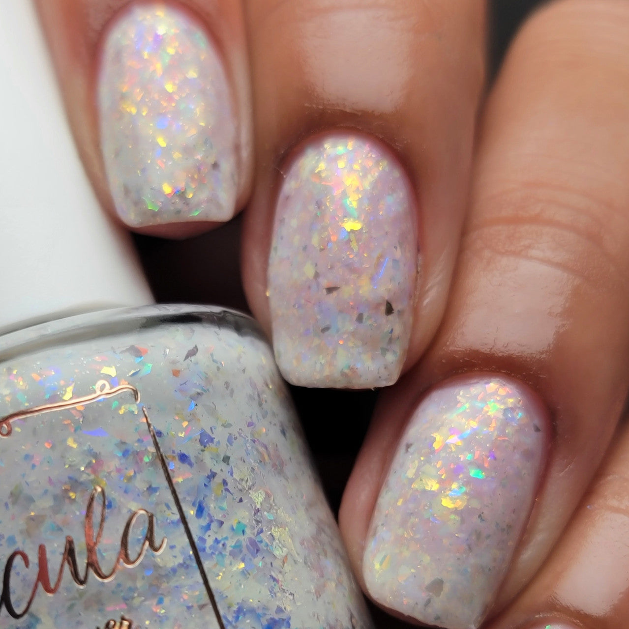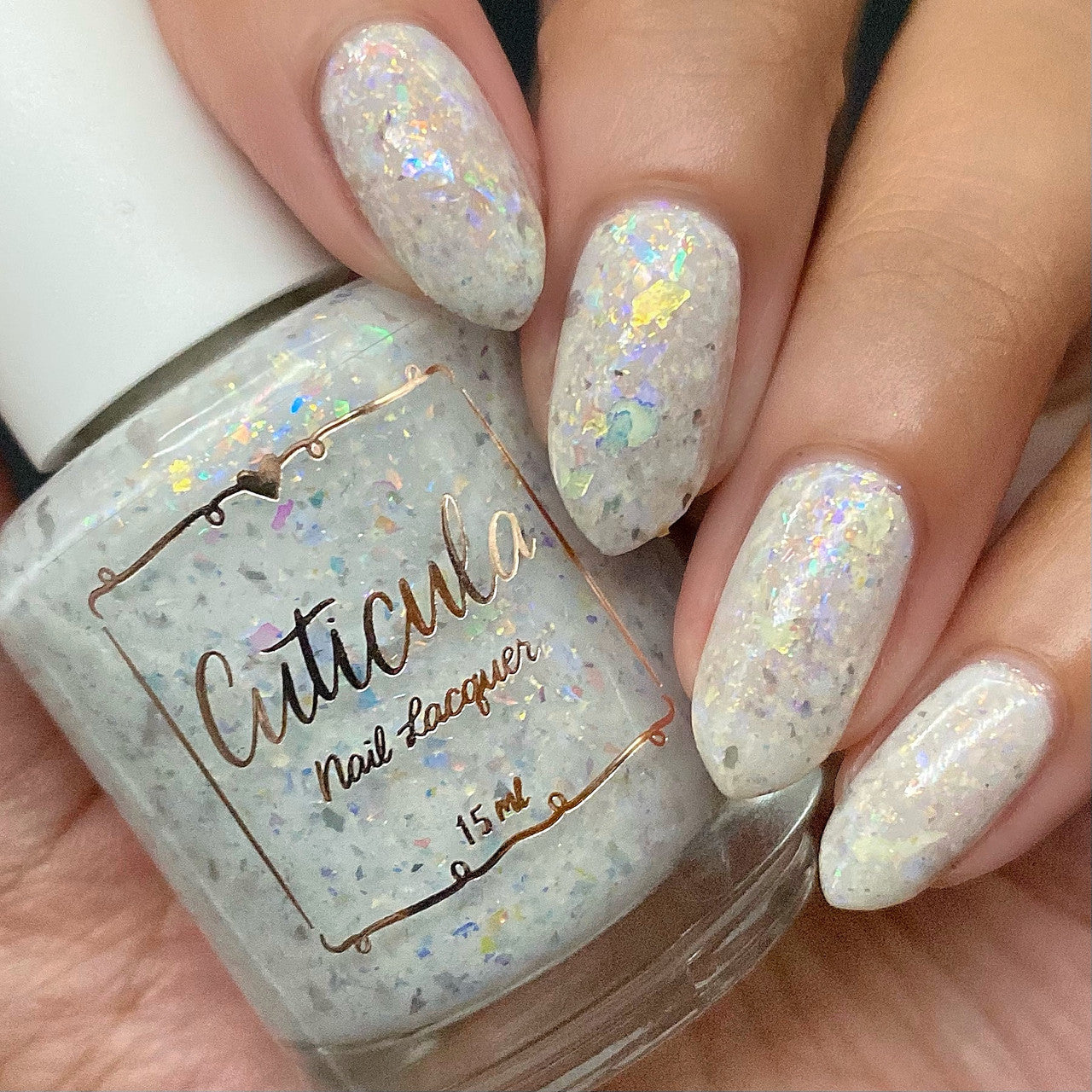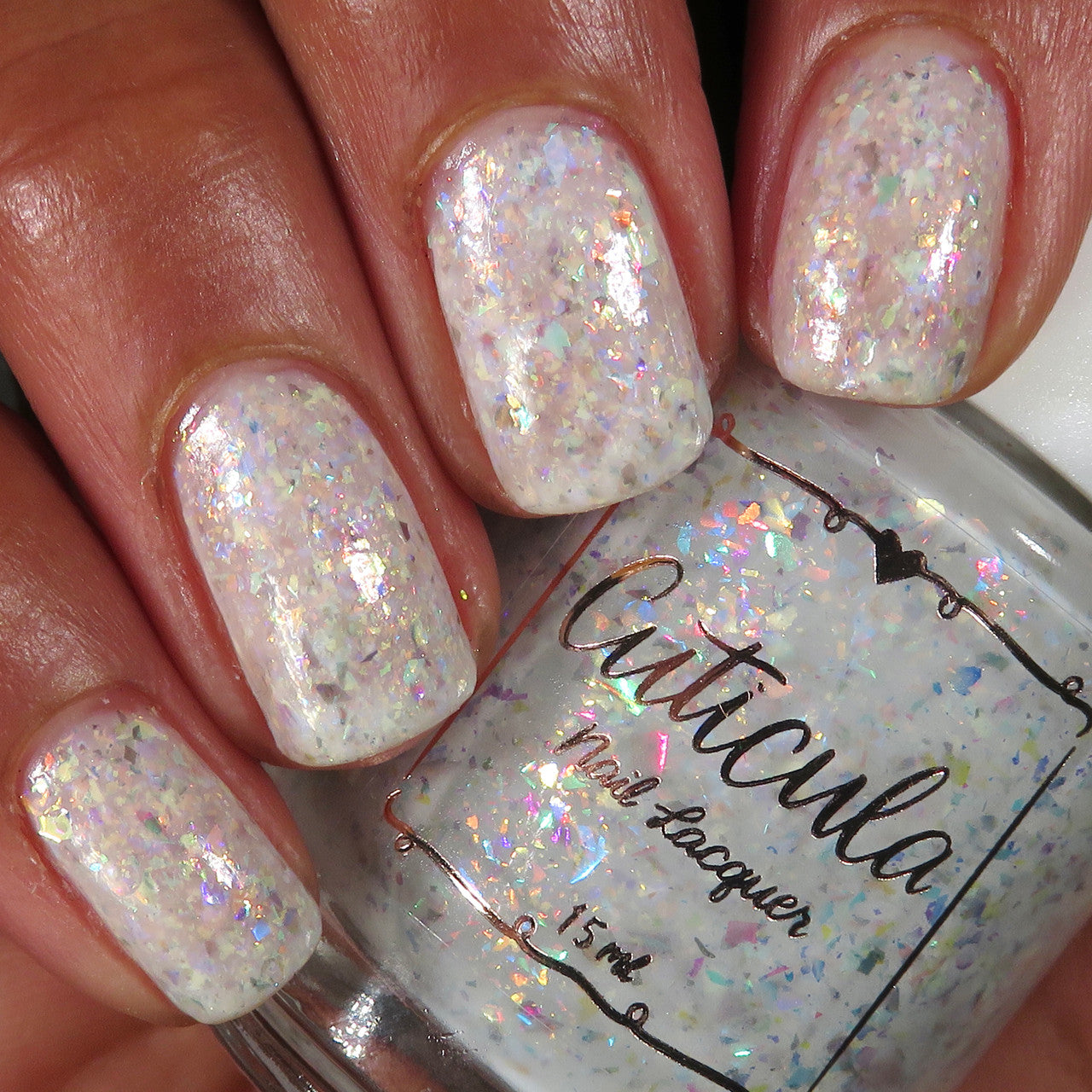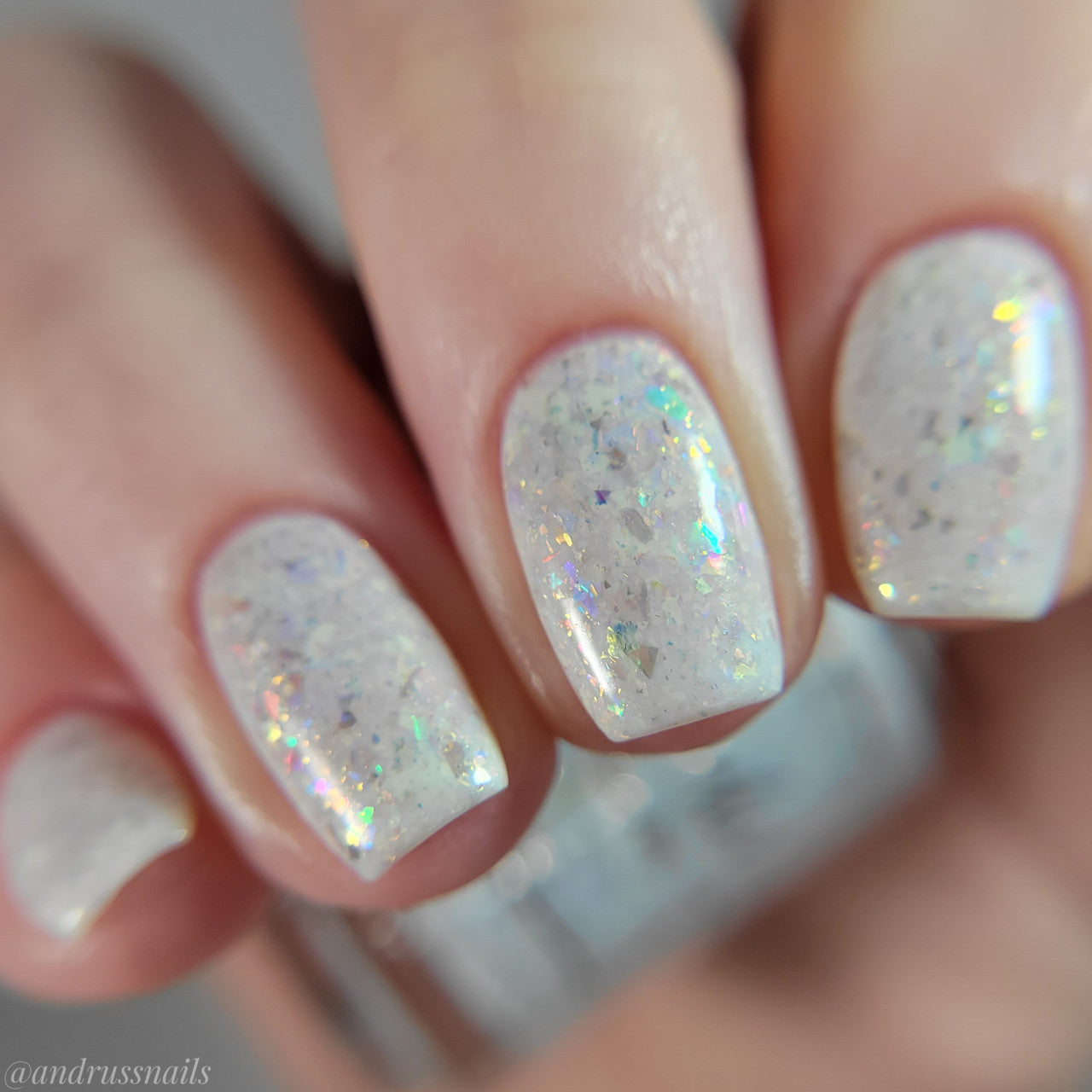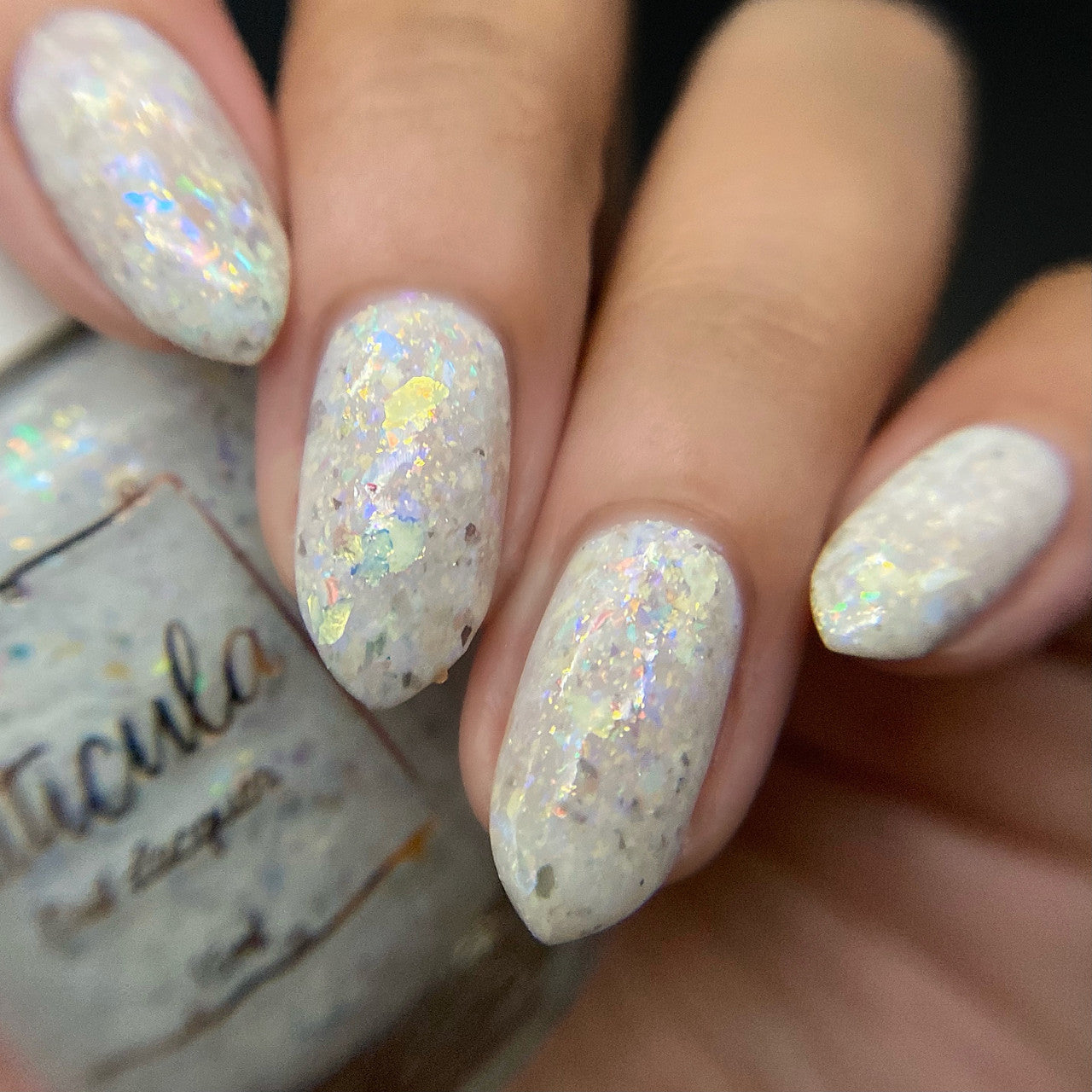 Pegasus Wings: Shattered Fantasy Collection 'Pegasus Wings' a white crelly base with yellow gold, orange/gold, purple/red, blue/purple, green/blue, and blue/purple/green shifting glass like flakes. Please note that all 5 polishes (except the topper) were created to be worn in 3 coats. The third final coat really gives you the best color depth and flake payoff. For best results, start with any of our available base coats and finish off your mani with any of our available top coats. This nail polish is 5 Free Ingredients: Nitrocellulose, Ethyl Acetate, Butyl Acetate, Isopropyl Alcohol, Ethyl Alcohol, Triphenyl Phosphate, Propyl Acetate, n-Butyl Alcohol, Colorants. Swatches @happily_polished @andrussnails @lovelylacquerist @kreativelykoated @_always_polished_ @brown_beautycentral @polishwithrae @themermaidpolish