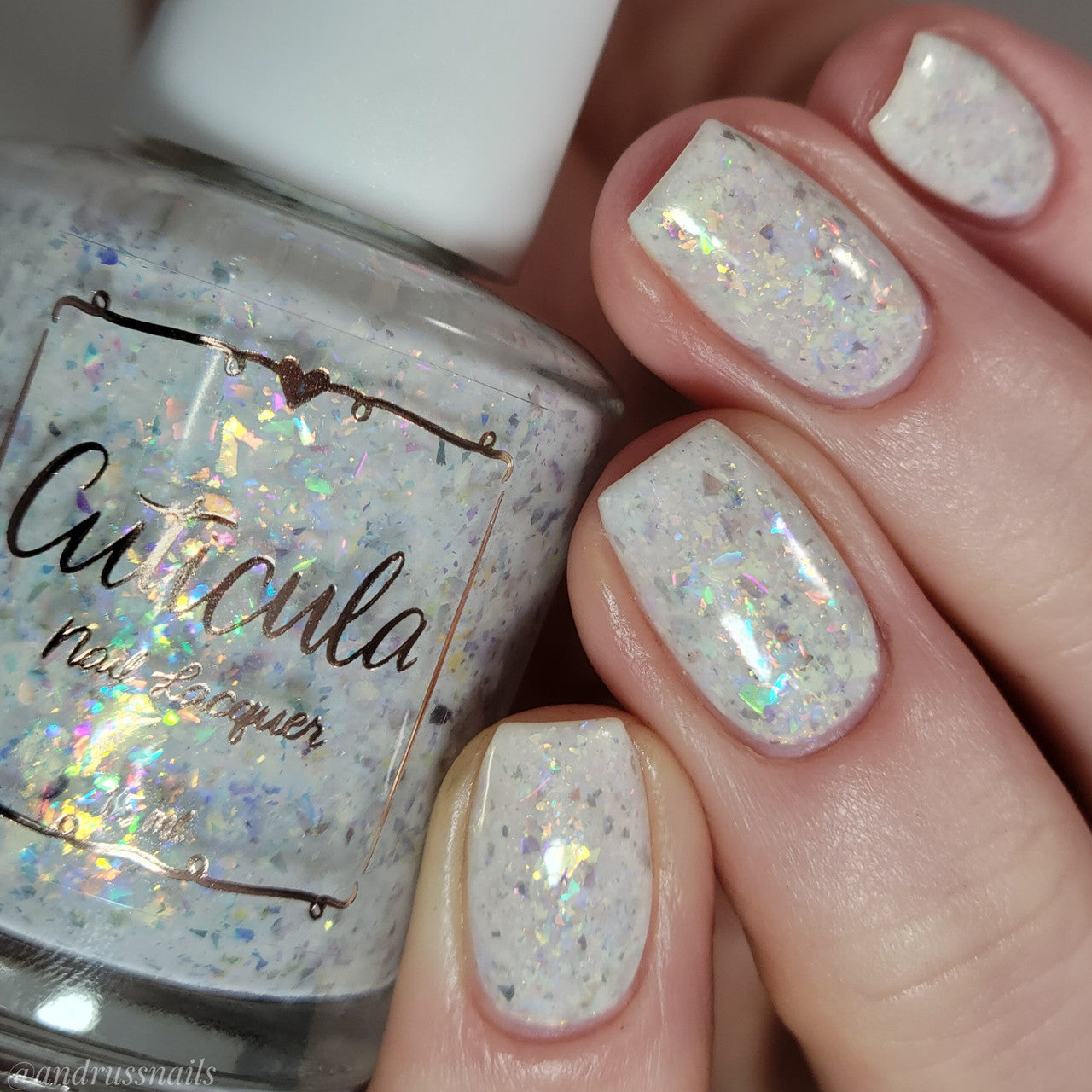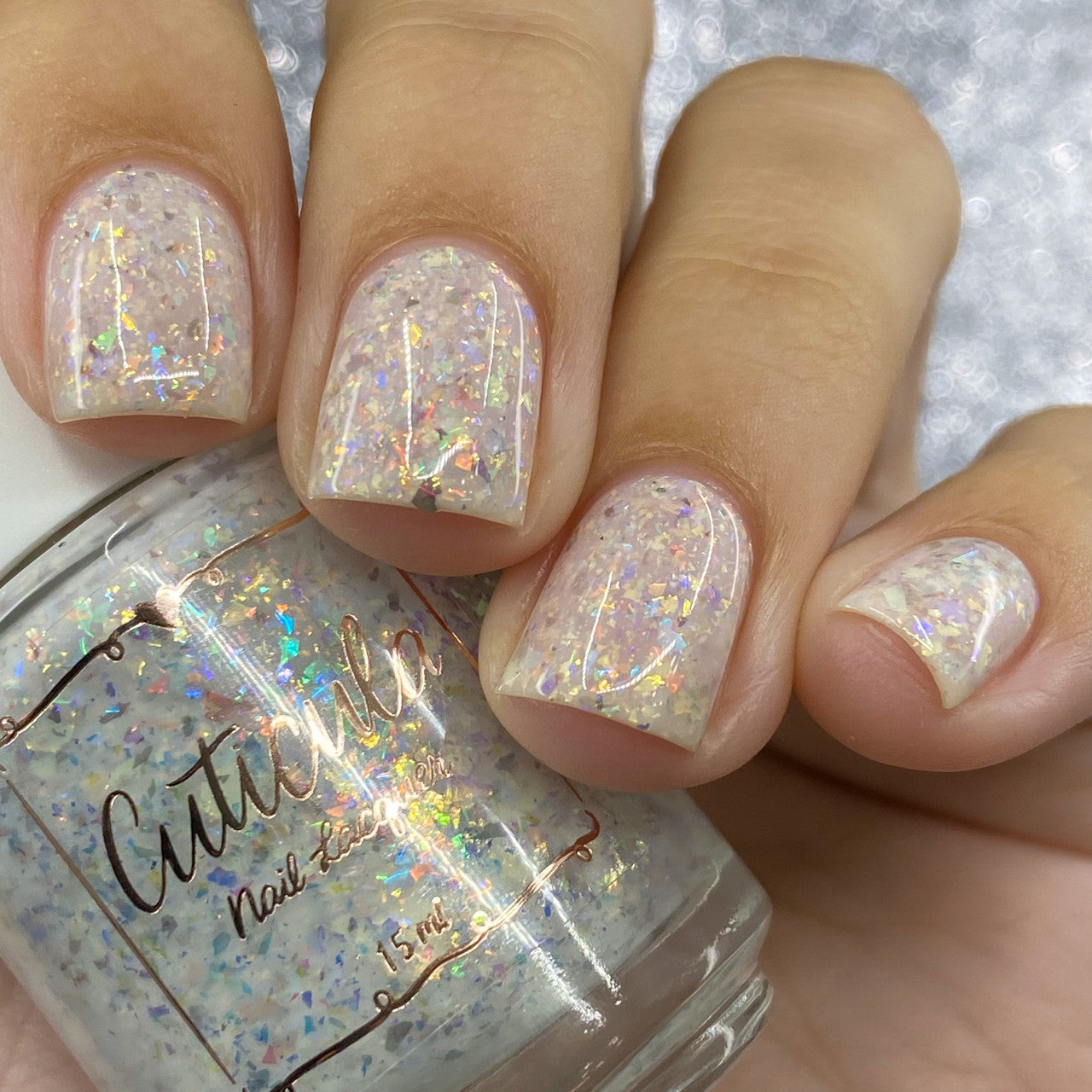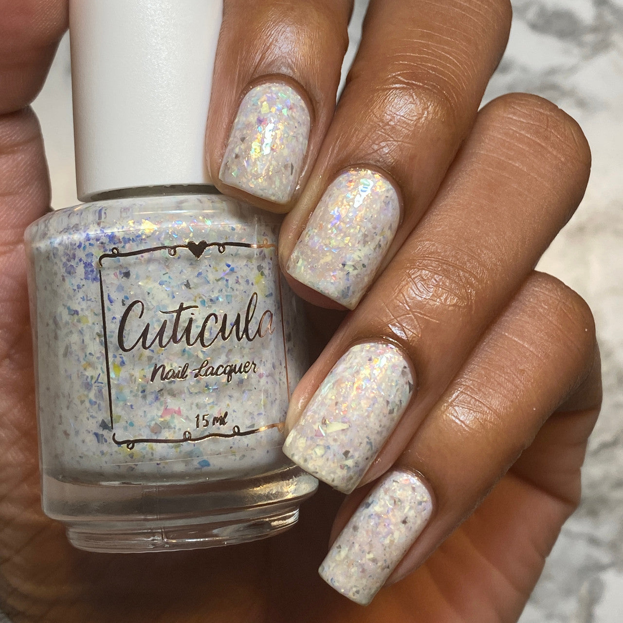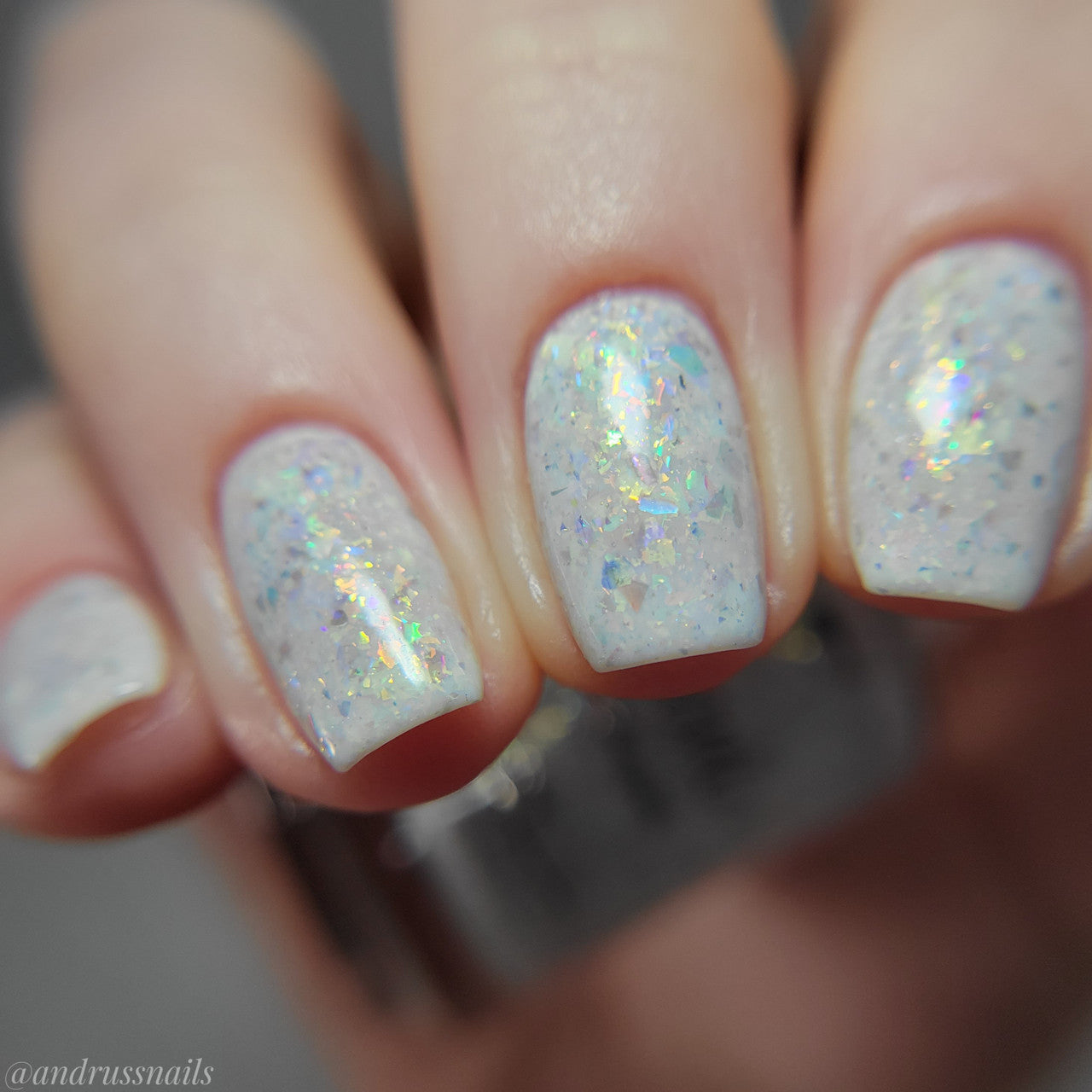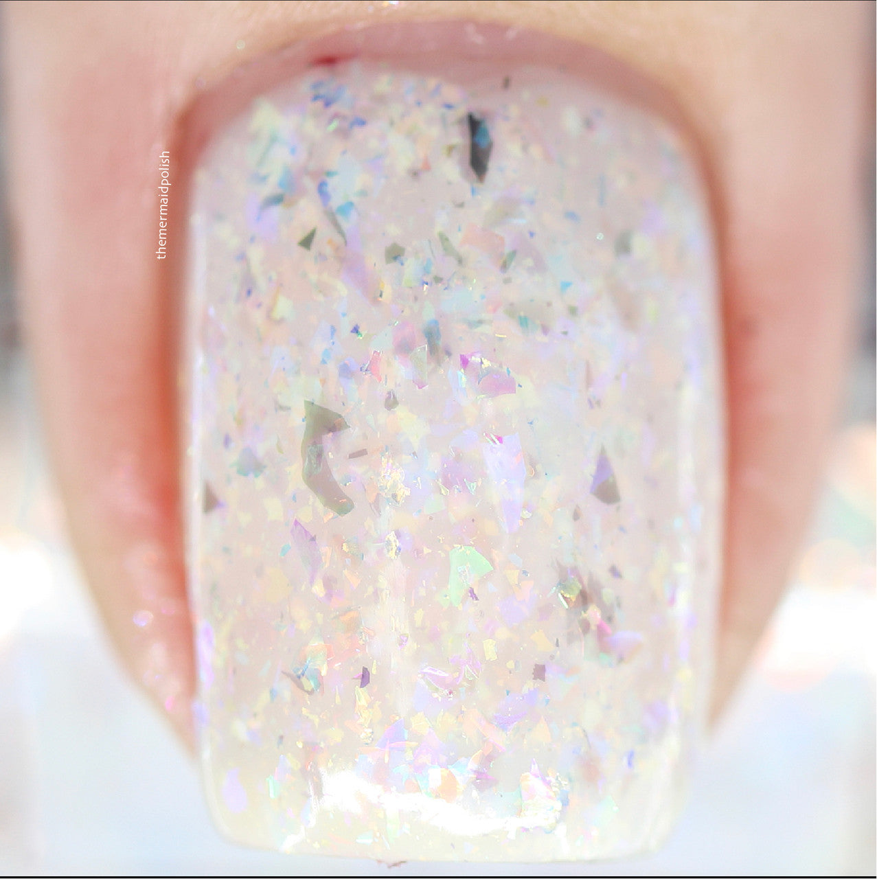 Pegasus Wings: Shattered Fantasy Collection 'Pegasus Wings' a white crelly base with yellow gold, orange/gold, purple/red, blue/purple, green/blue, and blue/purple/green shifting glass like flakes. Please note that all 5 polishes (except the topper) were created to be worn in 3 coats. The third final coat really gives you the best color depth and flake payoff. For best results, start with any of our available base coats and finish off your mani with any of our available top coats. This nail polish is 5 Free Ingredients: Nitrocellulose, Ethyl Acetate, Butyl Acetate, Isopropyl Alcohol, Ethyl Alcohol, Triphenyl Phosphate, Propyl Acetate, n-Butyl Alcohol, Colorants. Swatches @happily_polished @andrussnails @lovelylacquerist @kreativelykoated @_always_polished_ @brown_beautycentral @polishwithrae @themermaidpolish