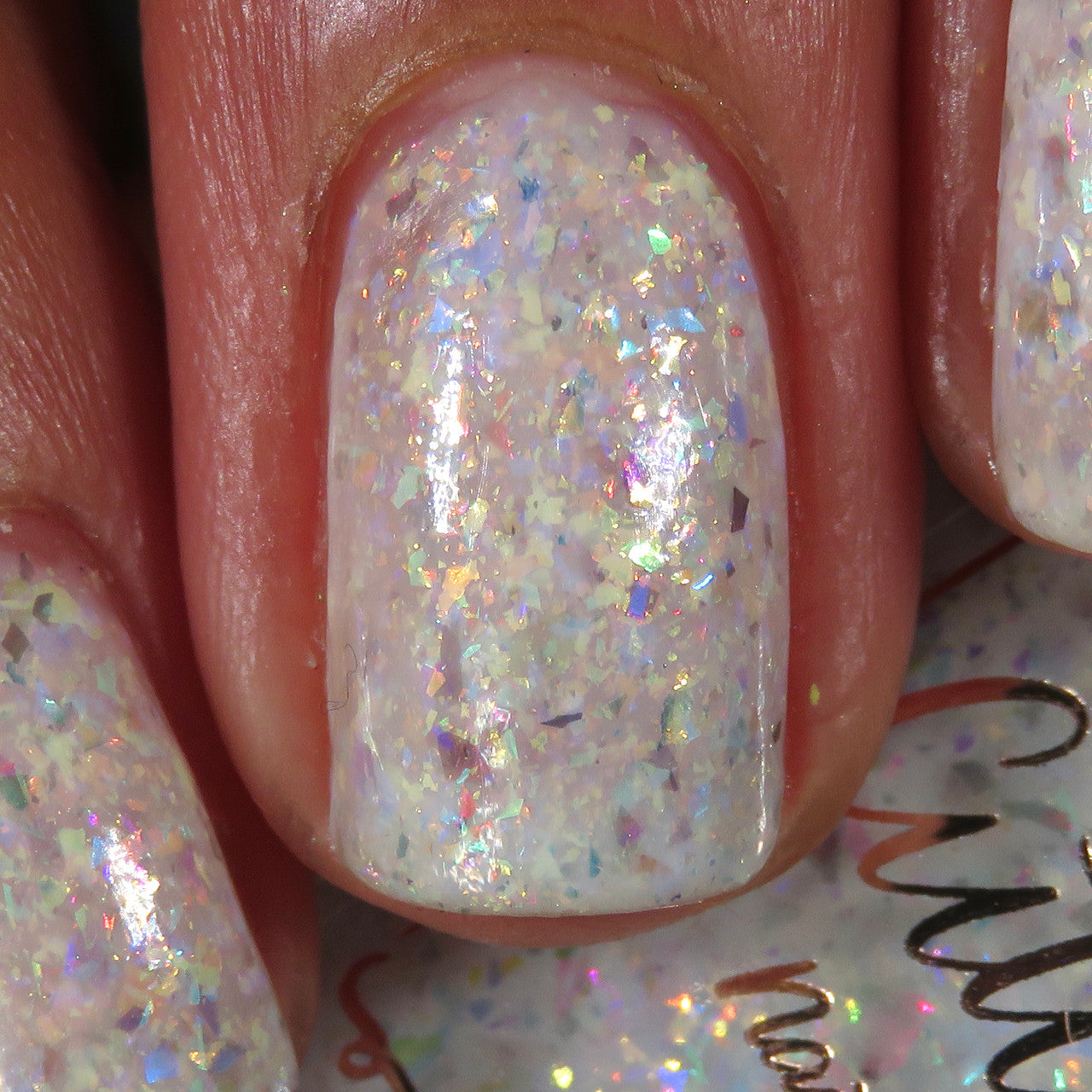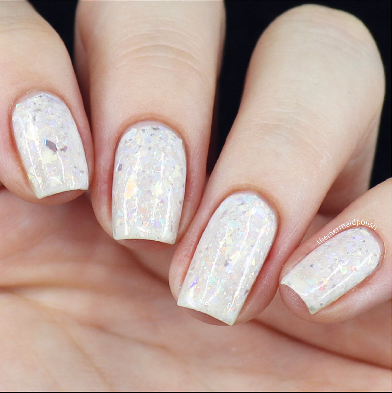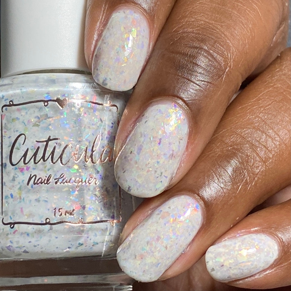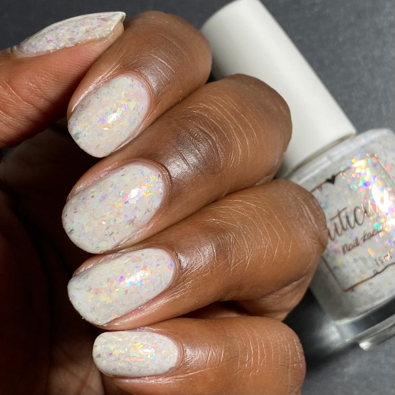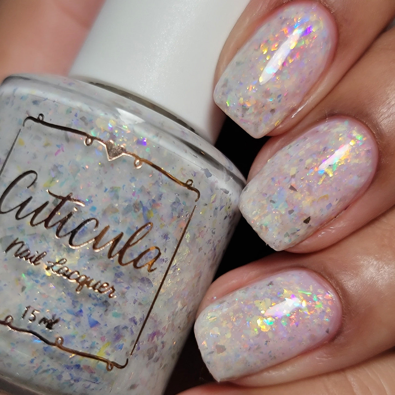 Pegasus Wings: Shattered Fantasy Collection 'Pegasus Wings' a white crelly base with yellow gold, orange/gold, purple/red, blue/purple, green/blue, and blue/purple/green shifting glass like flakes. Please note that all 5 polishes (except the topper) were created to be worn in 3 coats. The third final coat really gives you the best color depth and flake payoff. For best results, start with any of our available base coats and finish off your mani with any of our available top coats. This nail polish is 5 Free Ingredients: Nitrocellulose, Ethyl Acetate, Butyl Acetate, Isopropyl Alcohol, Ethyl Alcohol, Triphenyl Phosphate, Propyl Acetate, n-Butyl Alcohol, Colorants. Swatches @happily_polished @andrussnails @lovelylacquerist @kreativelykoated @_always_polished_ @brown_beautycentral @polishwithrae @themermaidpolish