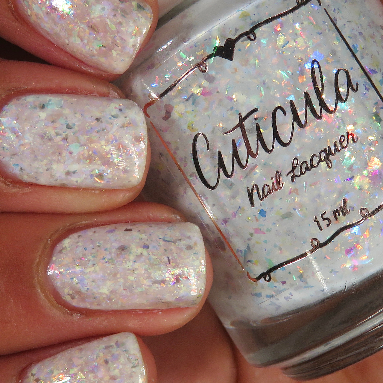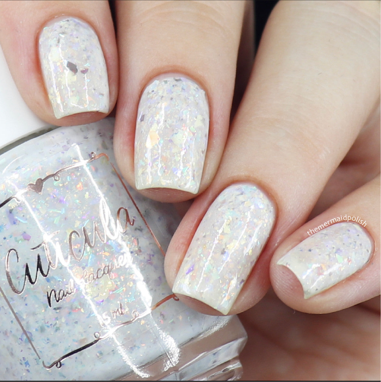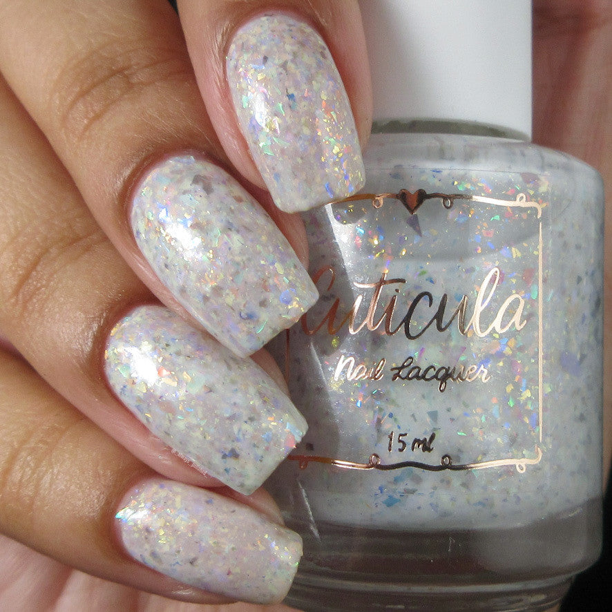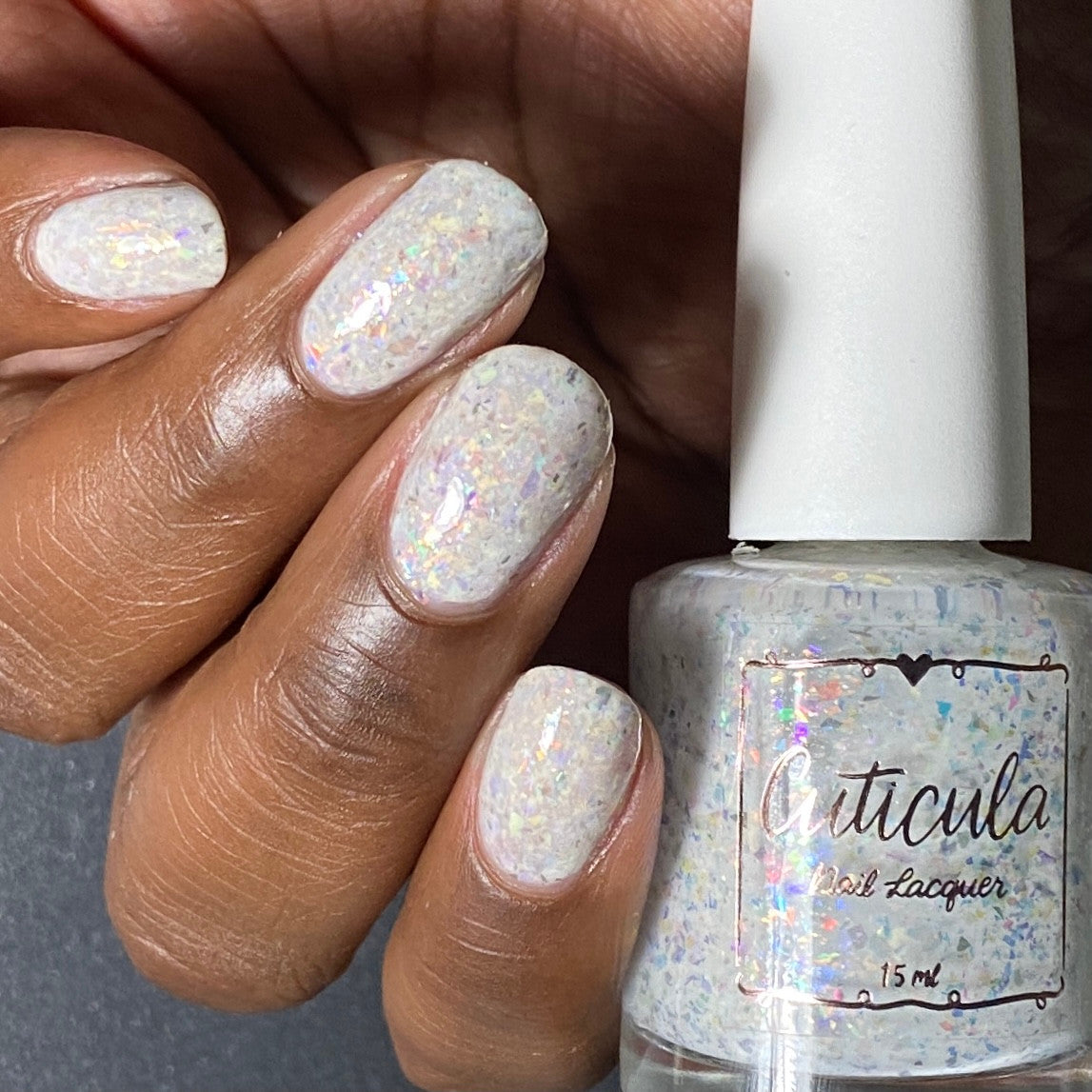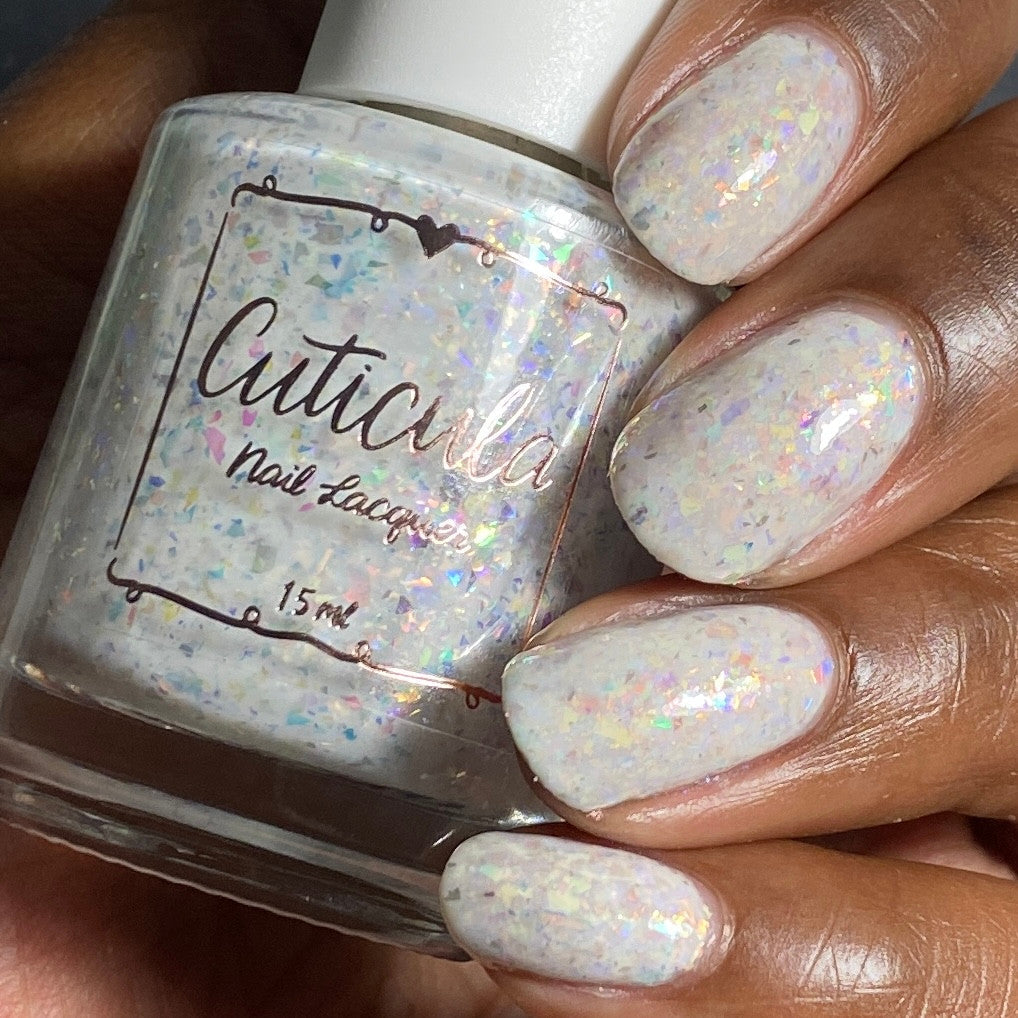 Pegasus Wings: Shattered Fantasy Collection 'Pegasus Wings' a white crelly base with yellow gold, orange/gold, purple/red, blue/purple, green/blue, and blue/purple/green shifting glass like flakes. Please note that all 5 polishes (except the topper) were created to be worn in 3 coats. The third final coat really gives you the best color depth and flake payoff. For best results, start with any of our available base coats and finish off your mani with any of our available top coats. This nail polish is 5 Free Ingredients: Nitrocellulose, Ethyl Acetate, Butyl Acetate, Isopropyl Alcohol, Ethyl Alcohol, Triphenyl Phosphate, Propyl Acetate, n-Butyl Alcohol, Colorants. Swatches @happily_polished @andrussnails @lovelylacquerist @kreativelykoated @_always_polished_ @brown_beautycentral @polishwithrae @themermaidpolish