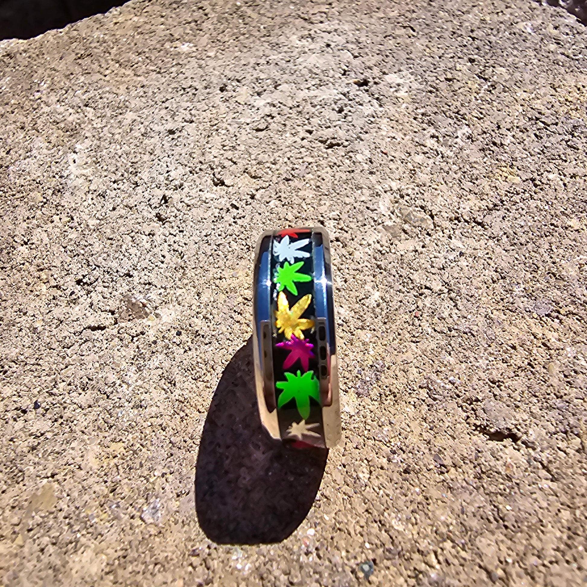 8mm stainless steel, black inlayed with multi color pot leaves, size 11.5