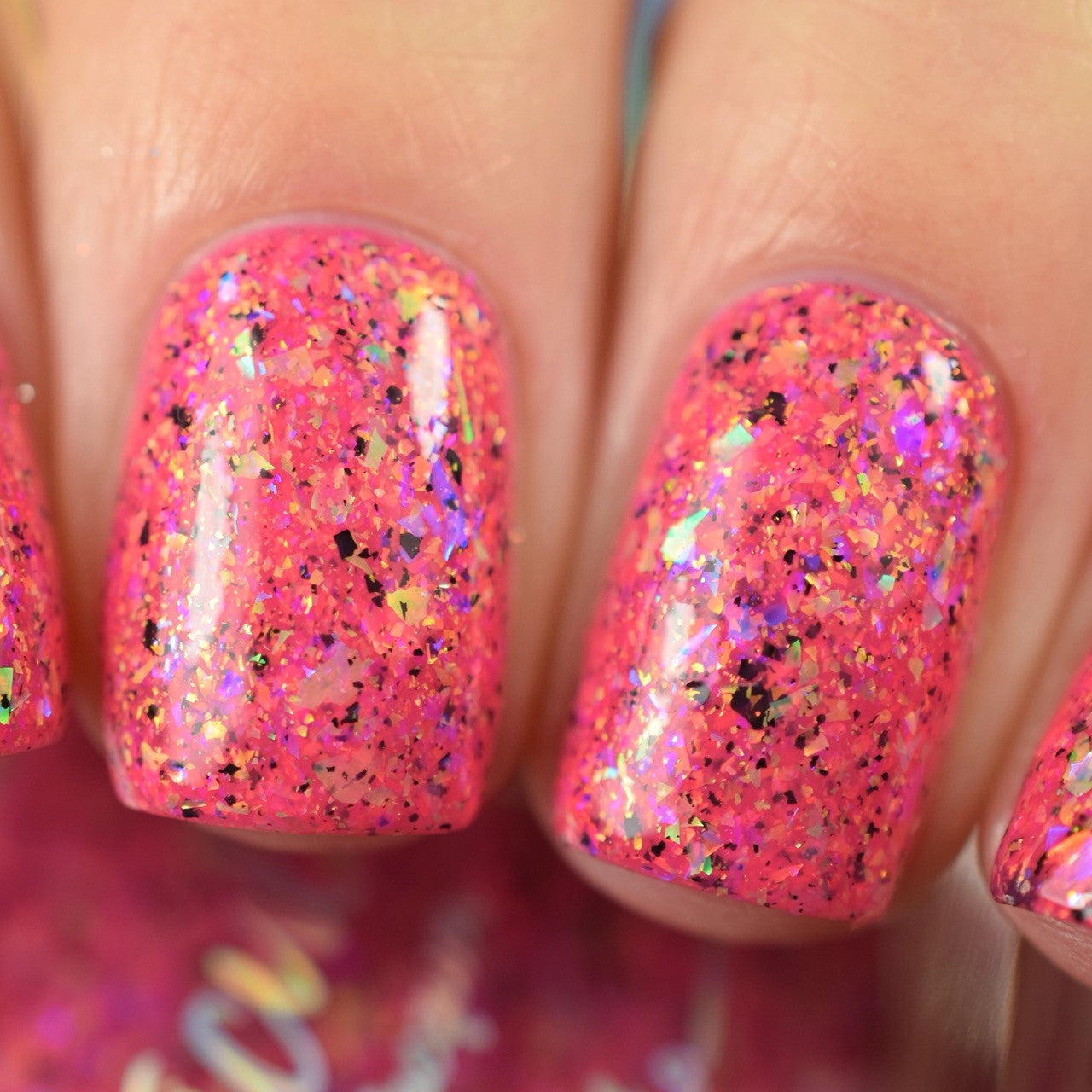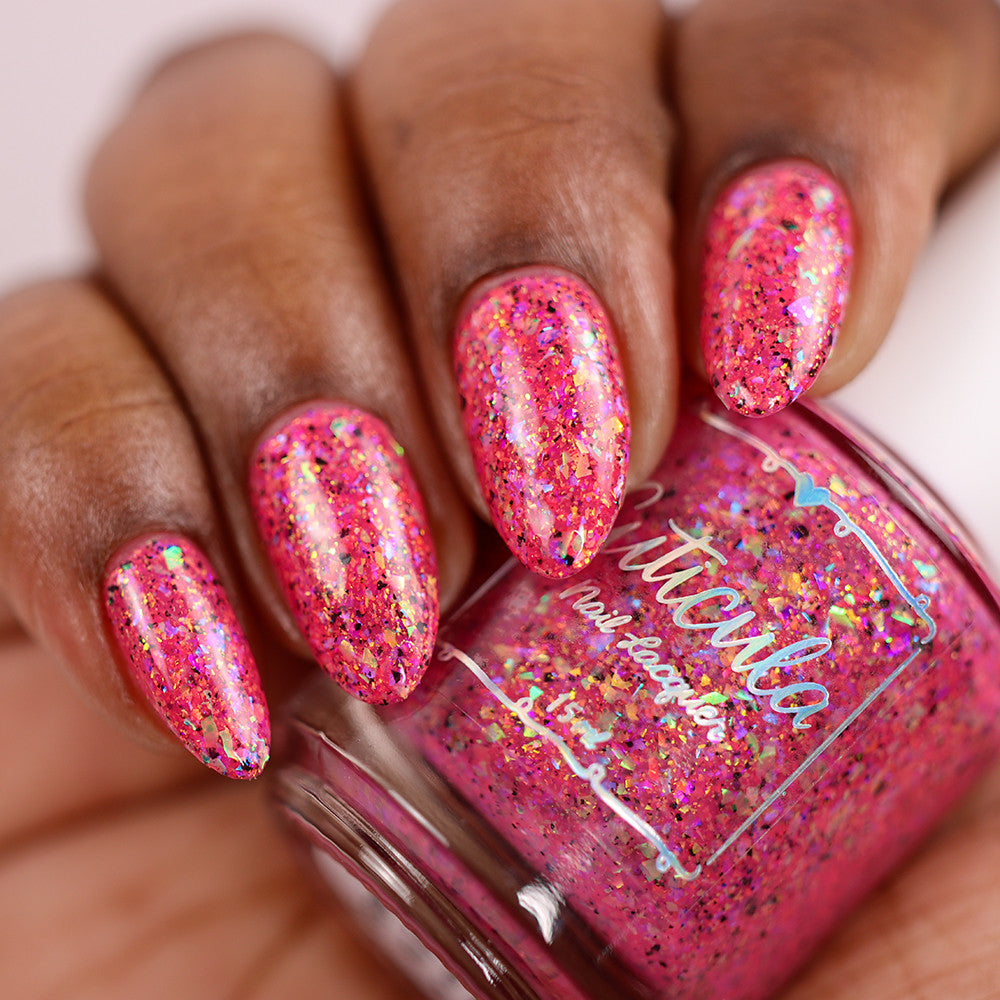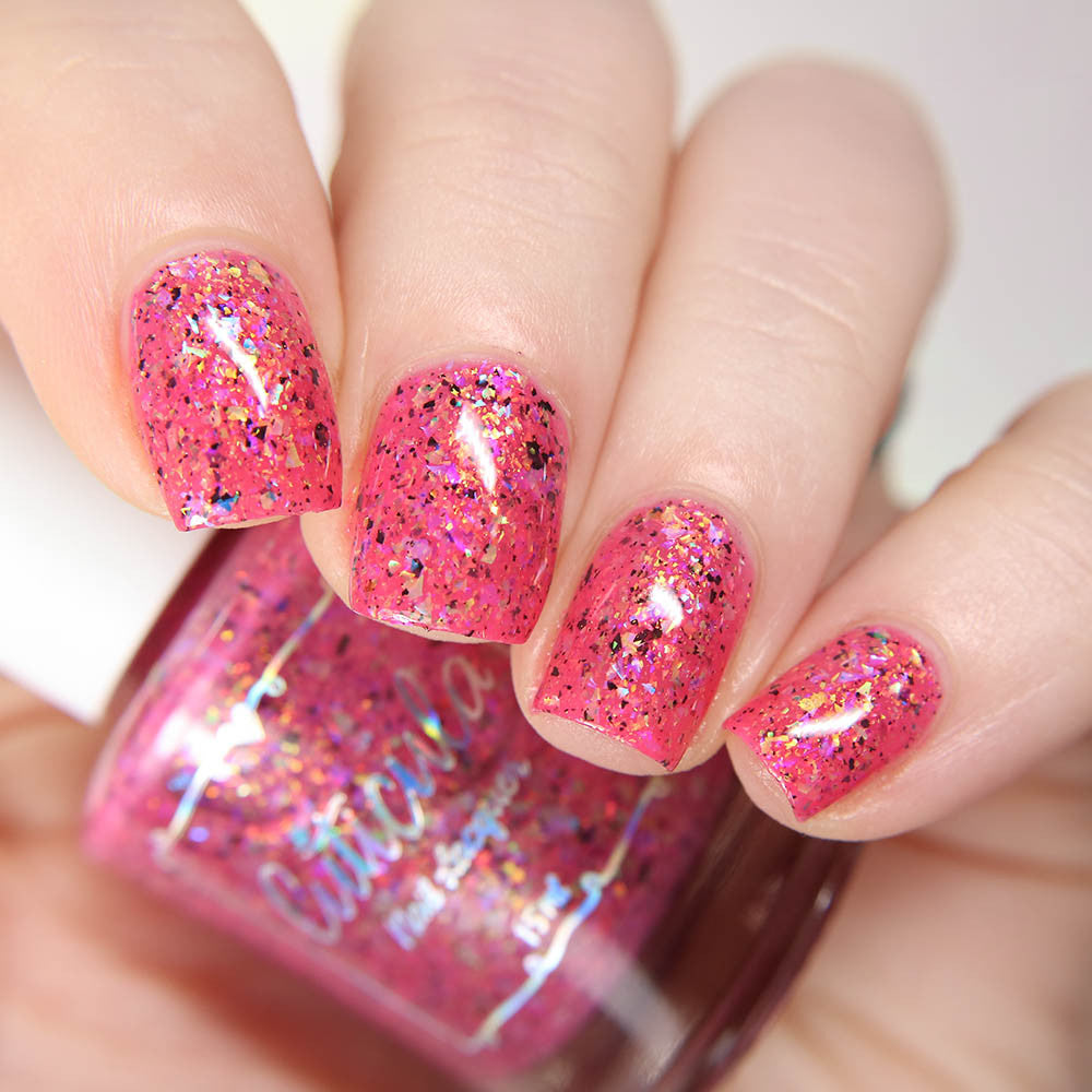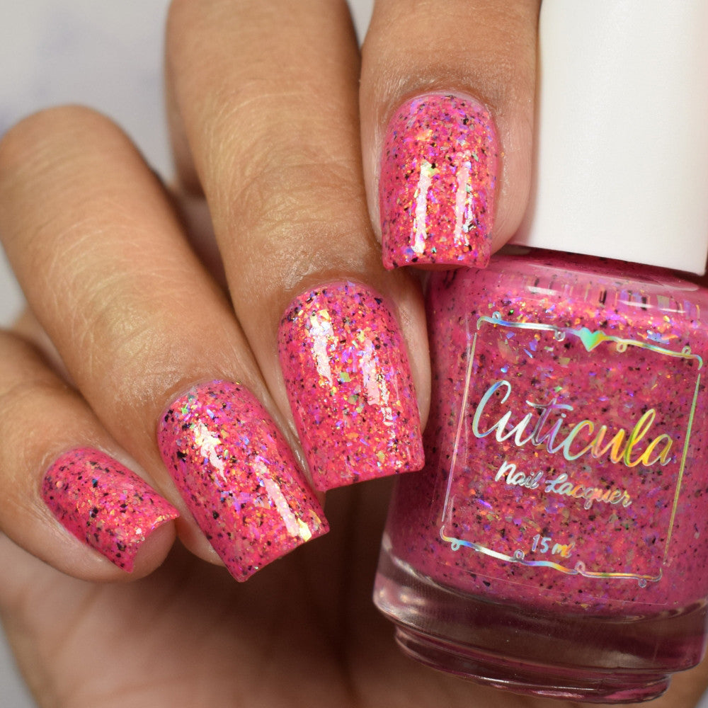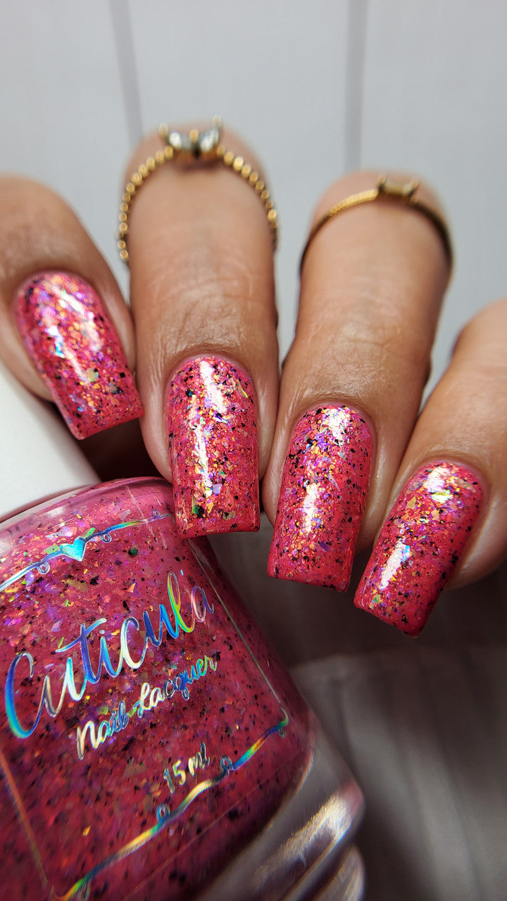 Raspberry Milk Tea *Reimagined* is a raspberry crelly base full of rainbow shifting glass flakes, and black flakes.