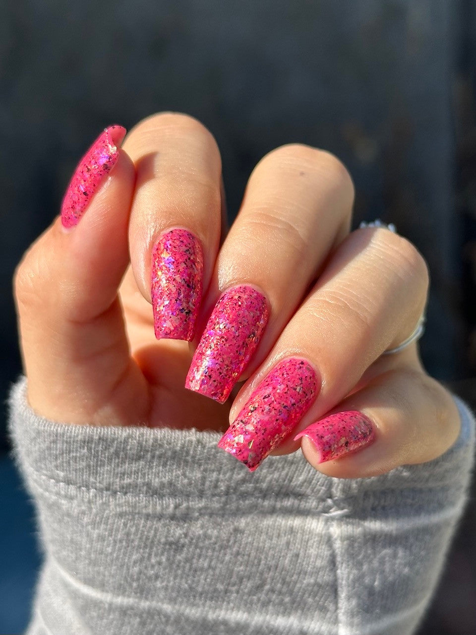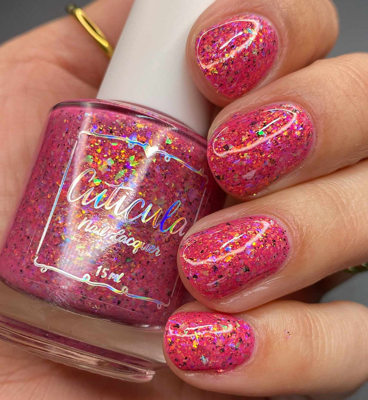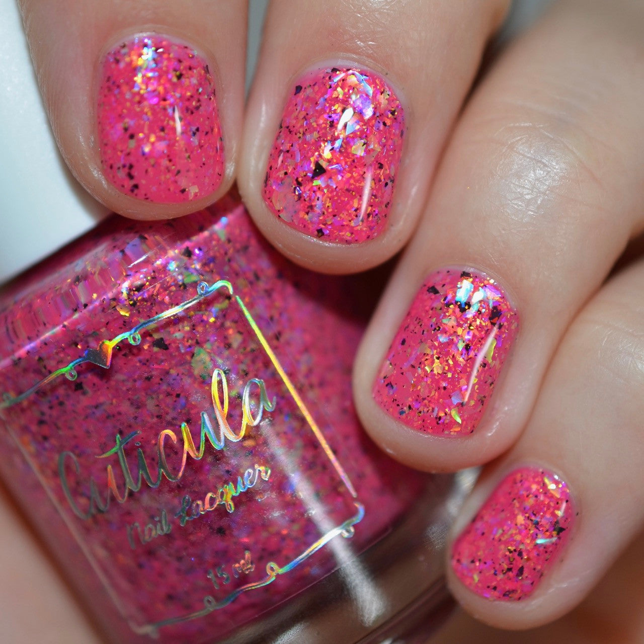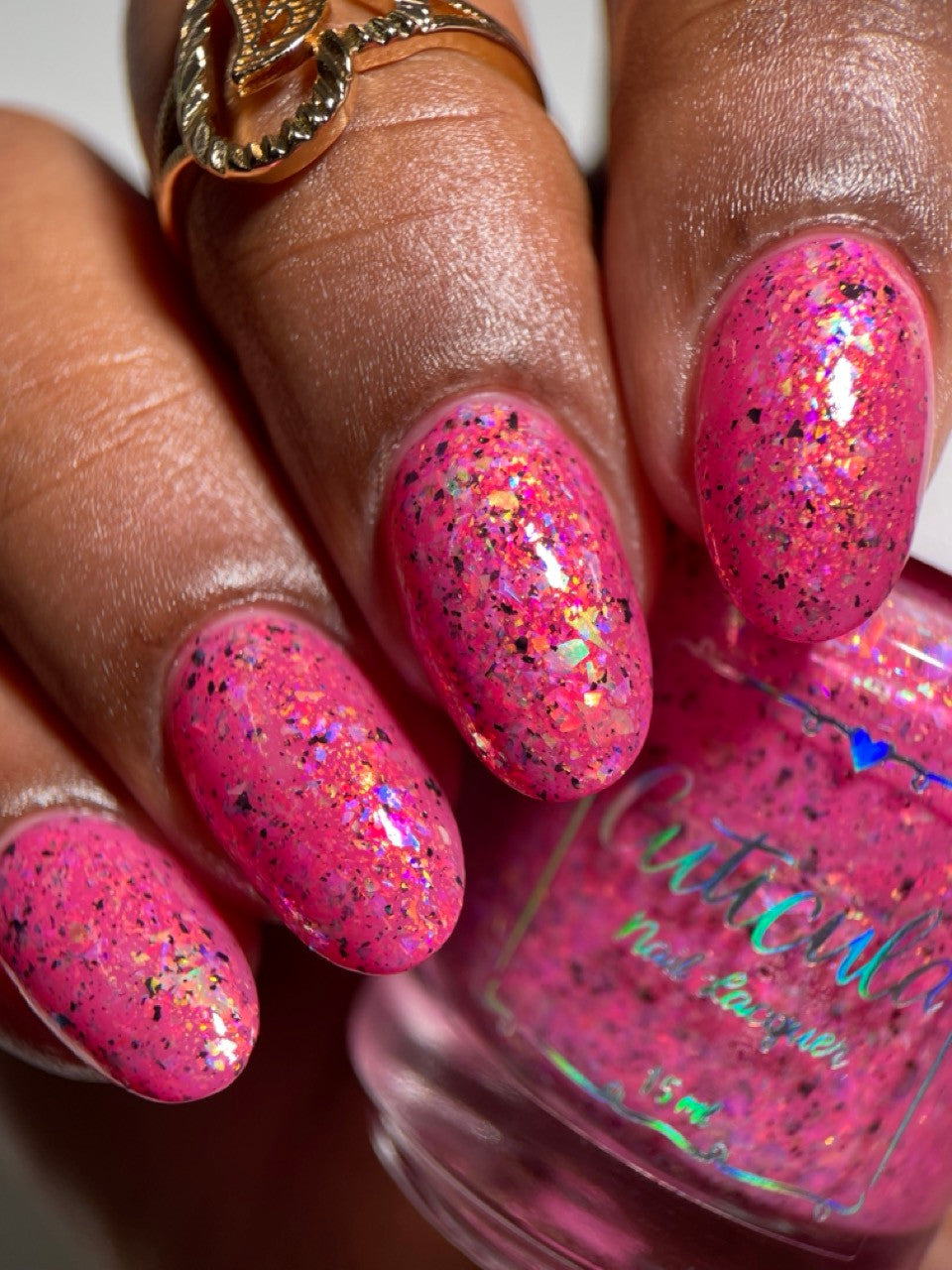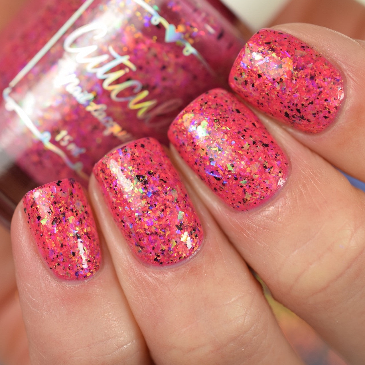 Raspberry Milk Tea *Reimagined* is a raspberry crelly base full of rainbow shifting glass flakes, and black flakes.