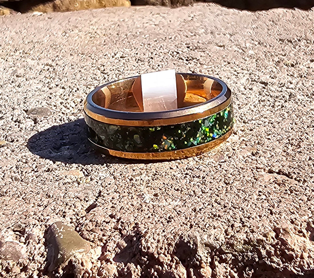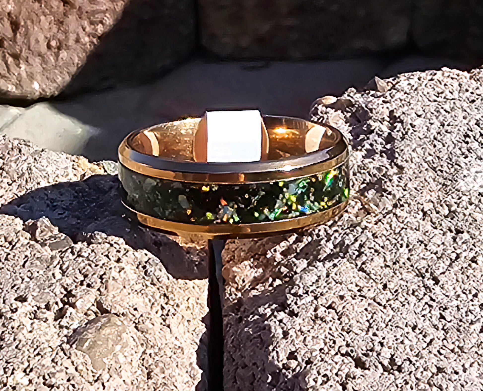 8mm rose gold finished steel, inlayed with white and black opals, size 11.5