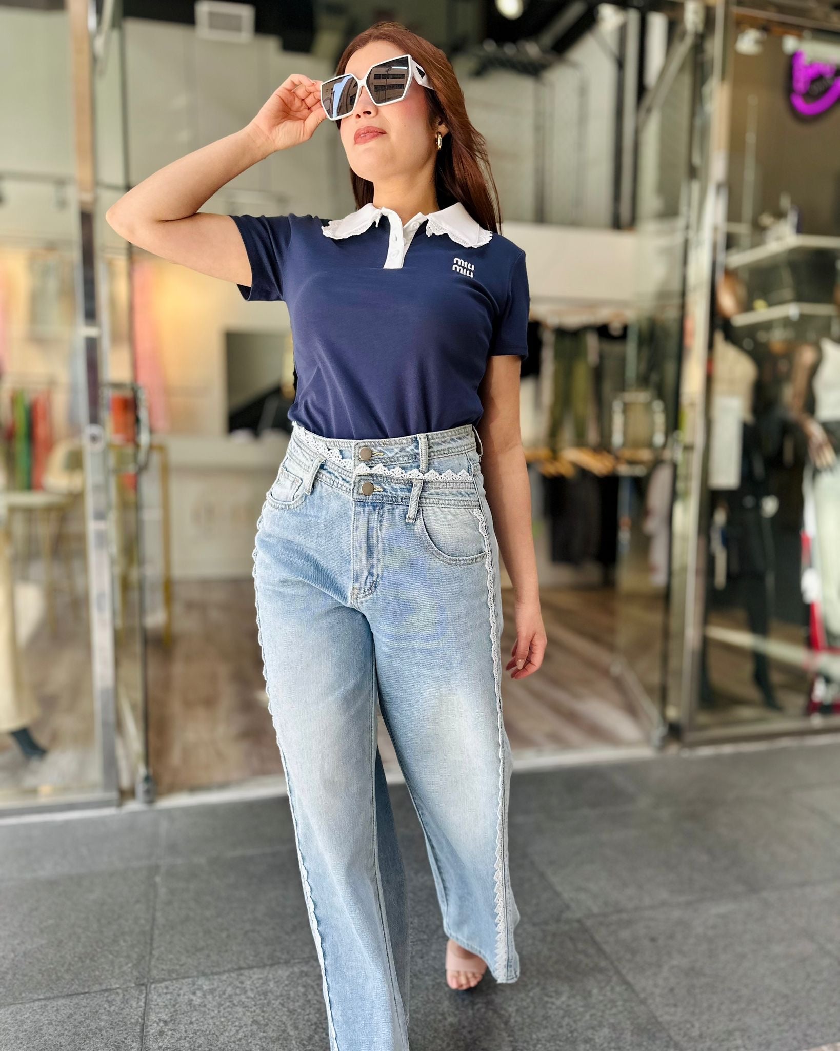 Step into elegance with these light-wash wide-leg jeans, designed with a dreamy feminine touch. Featuring a flattering high-rise waist with double button detailing, they cinch the waist beautifully while elongating the legs. The standout details lies along the sides, delicate white lace trim adds a romantic, girly charm to the relaxed wide-leg silhouette, balancing soft femininity with casual denim ease.