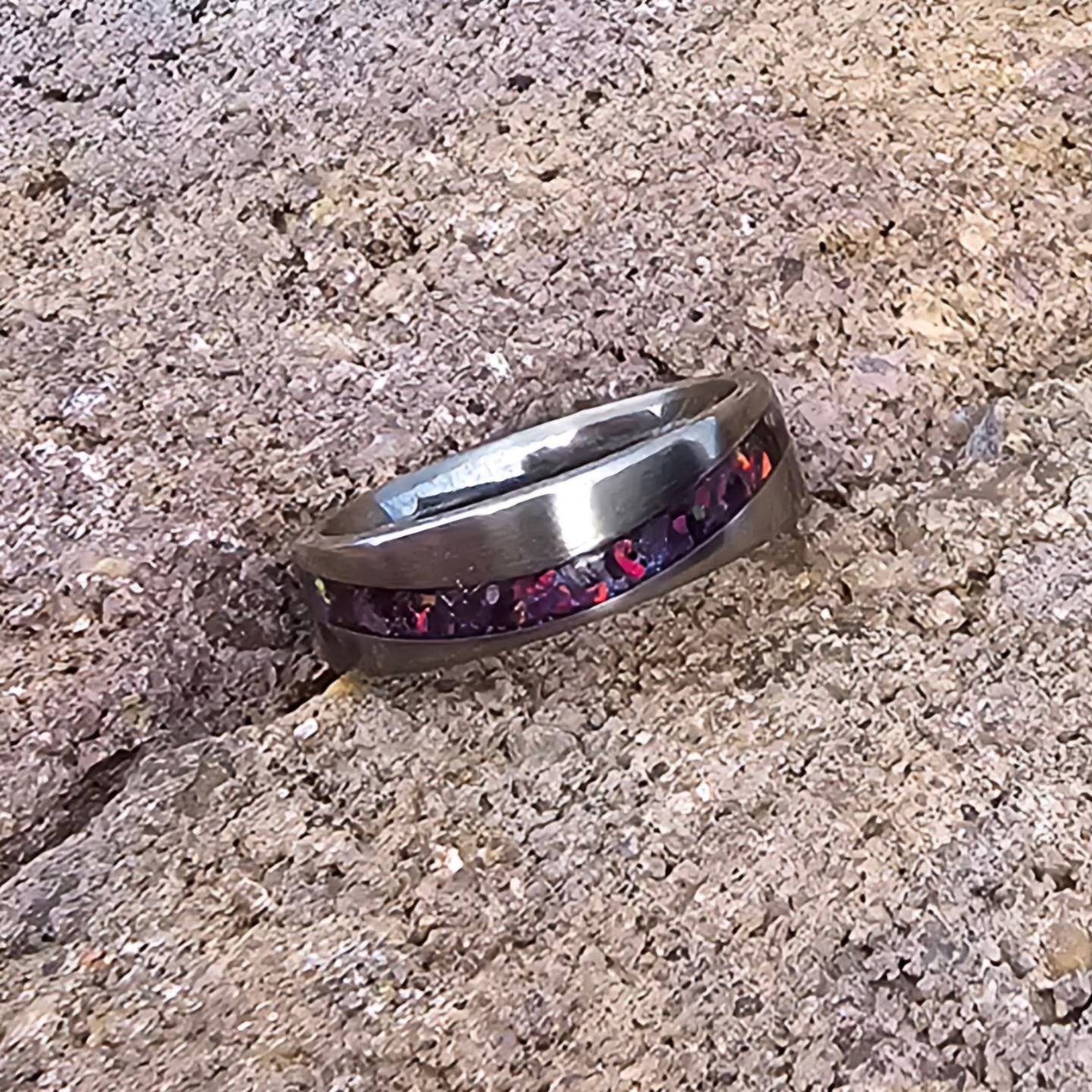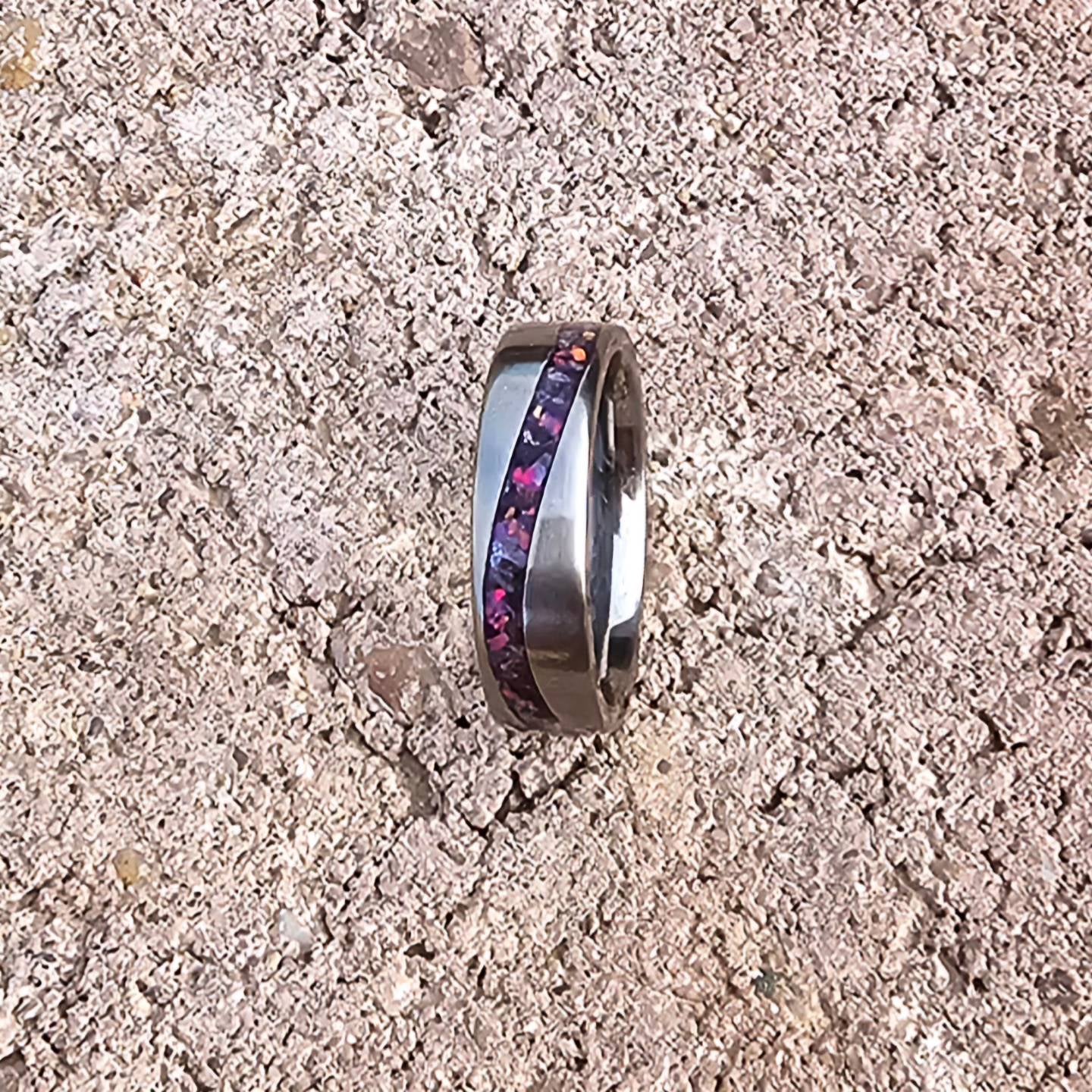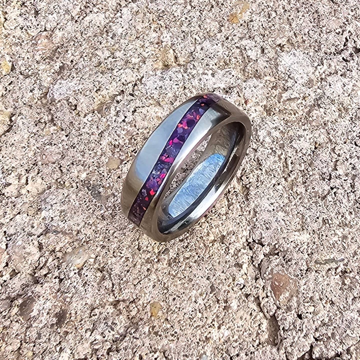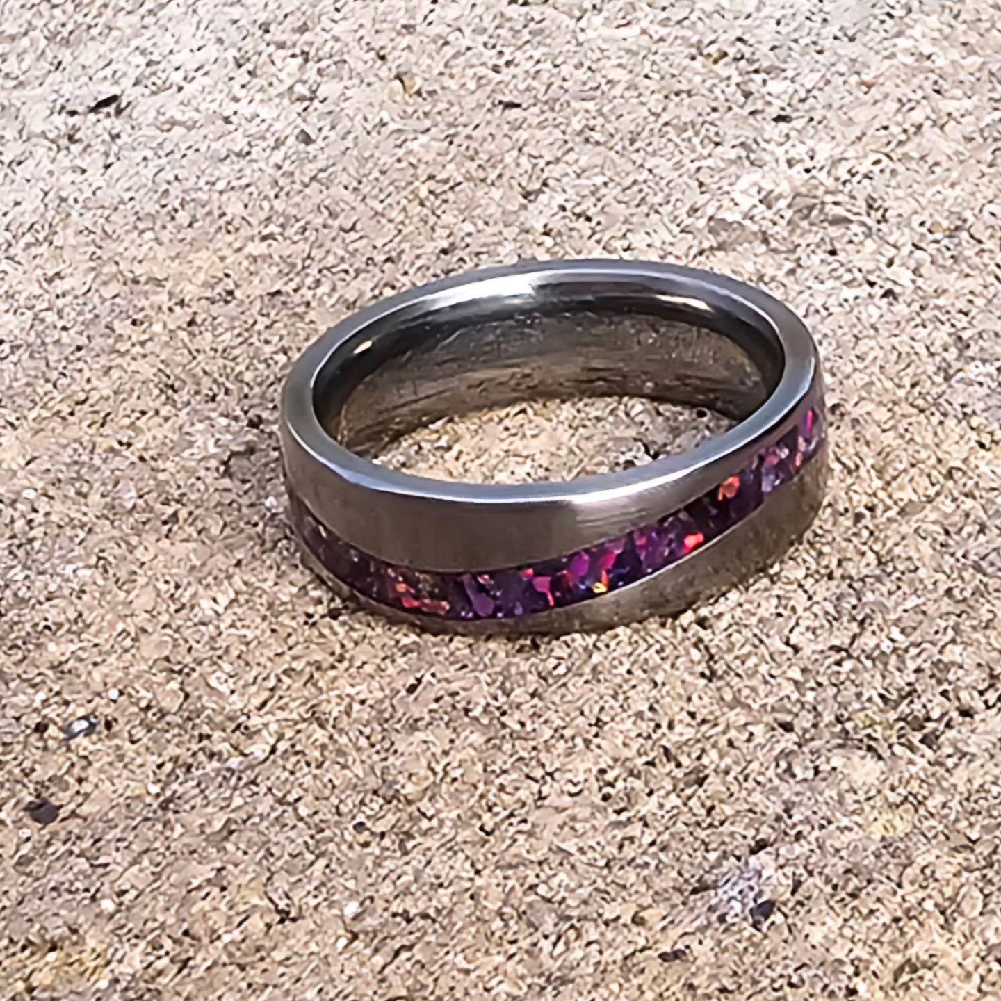Titanium single wave design, inlayed with amethyst and purple opals, size 8