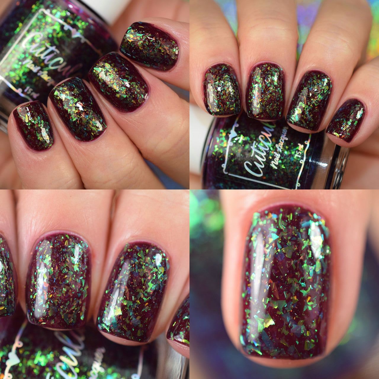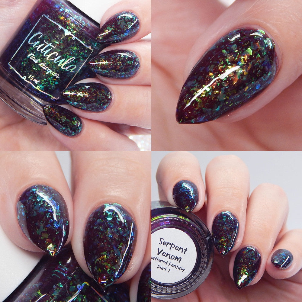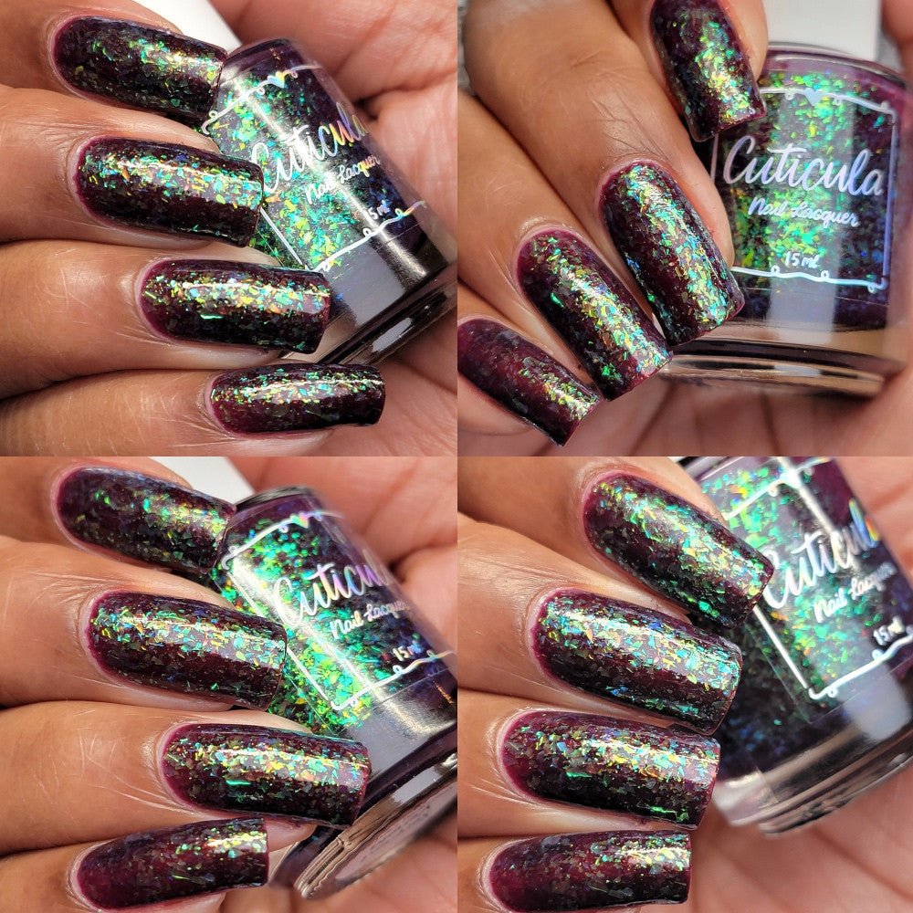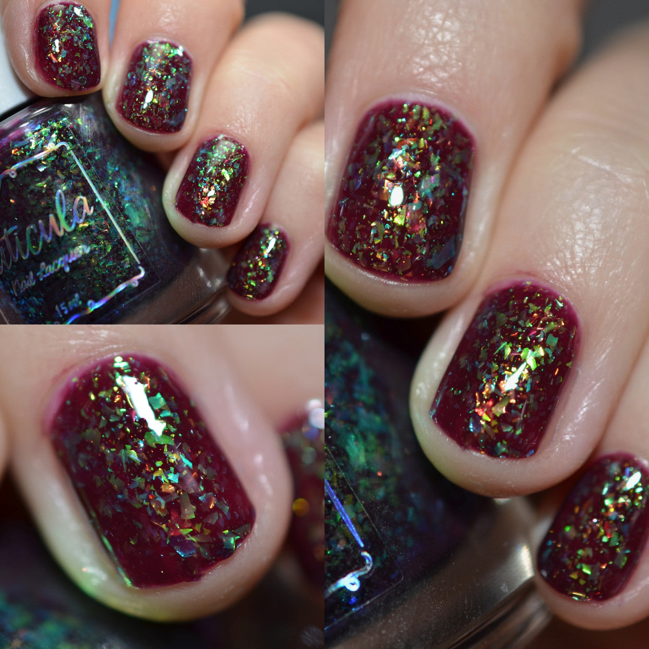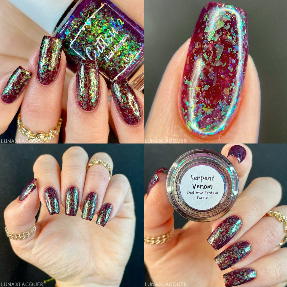 'Serpent Venom' a berry jelly base with green/blue shifting glass flakes. Perfectly opaque in 3 coats.