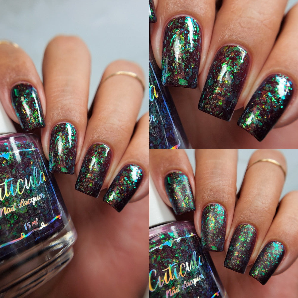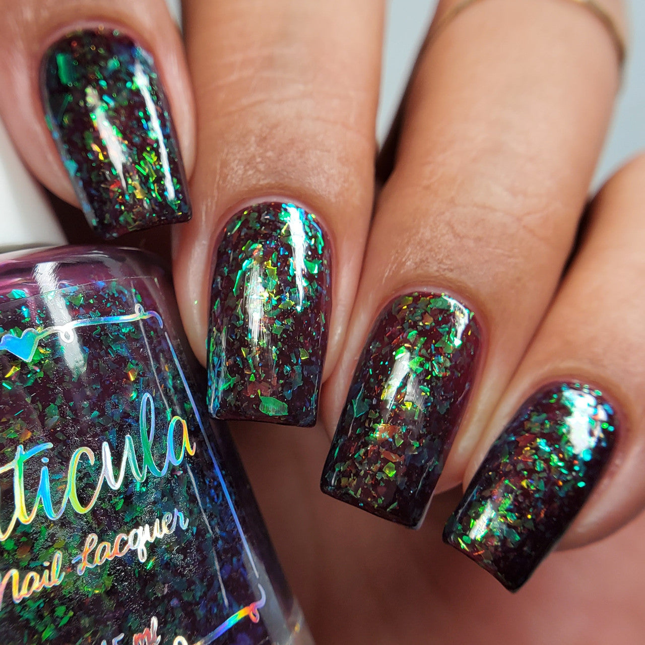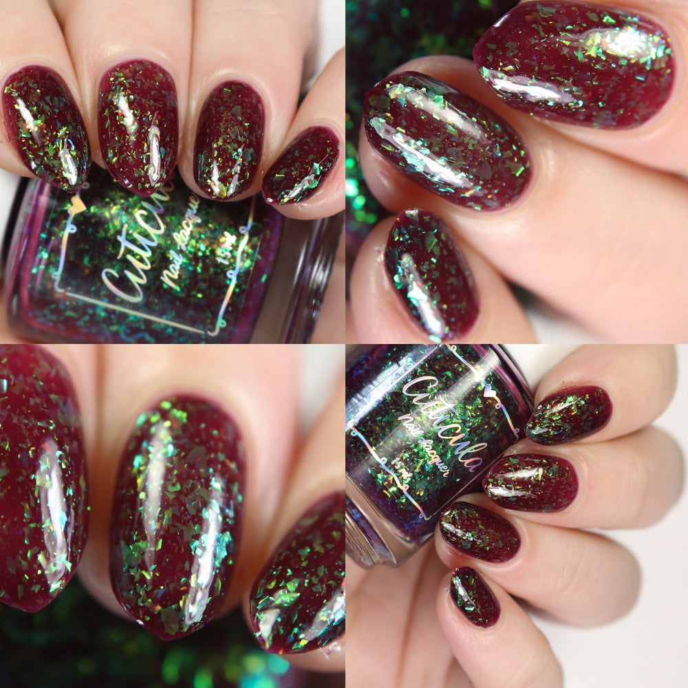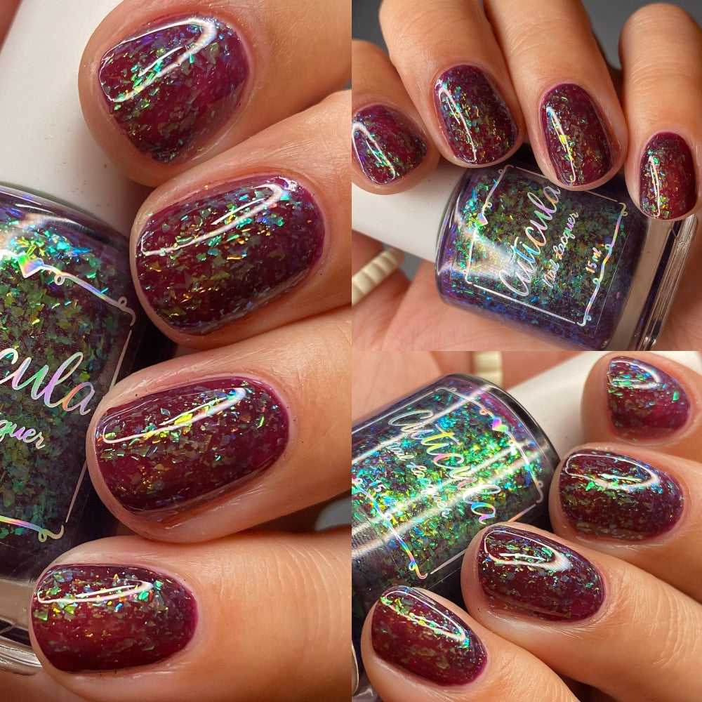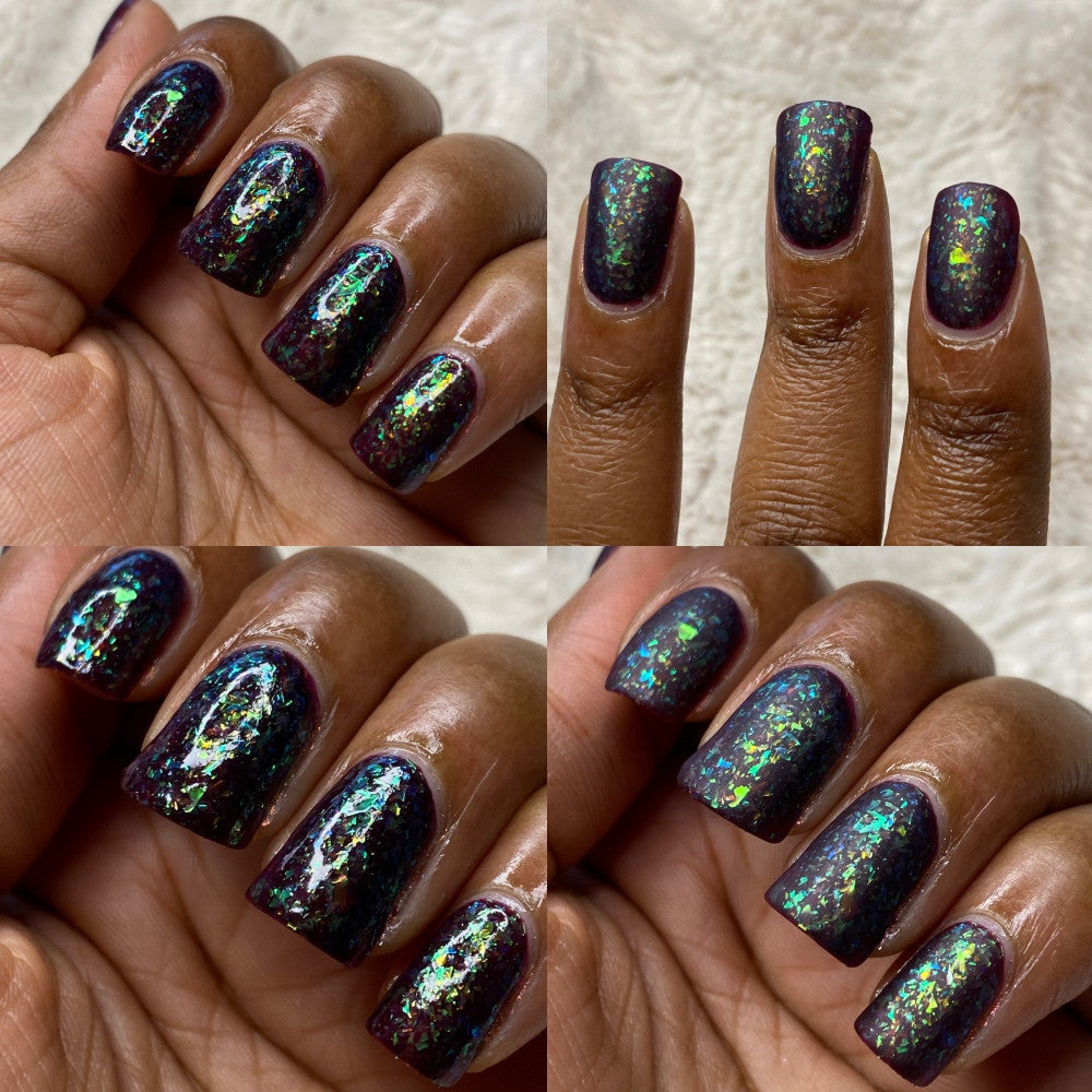 'Serpent Venom' a berry jelly base with green/blue shifting glass flakes. Perfectly opaque in 3 coats.