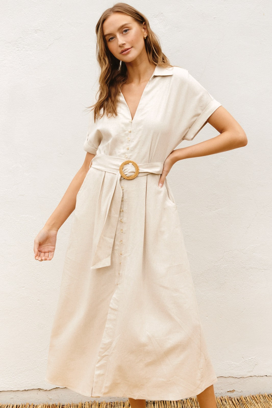 Effortless elegance meets summer sophistication in the Soleil Linen Belted Midi Dress. Crafted from a breathable linen-blend fabric, this dress features a soft collared neckline, button-down front, and short cuffed sleeves for a polished yet relaxed look. The flattering A-line silhouette cinches at the waist with a detachable sash belt, complete with a woven circular buckle for a natural, refined finish. Side pockets add convenience without compromising style, and the midi length with a subtle front slit gives you graceful movement.
