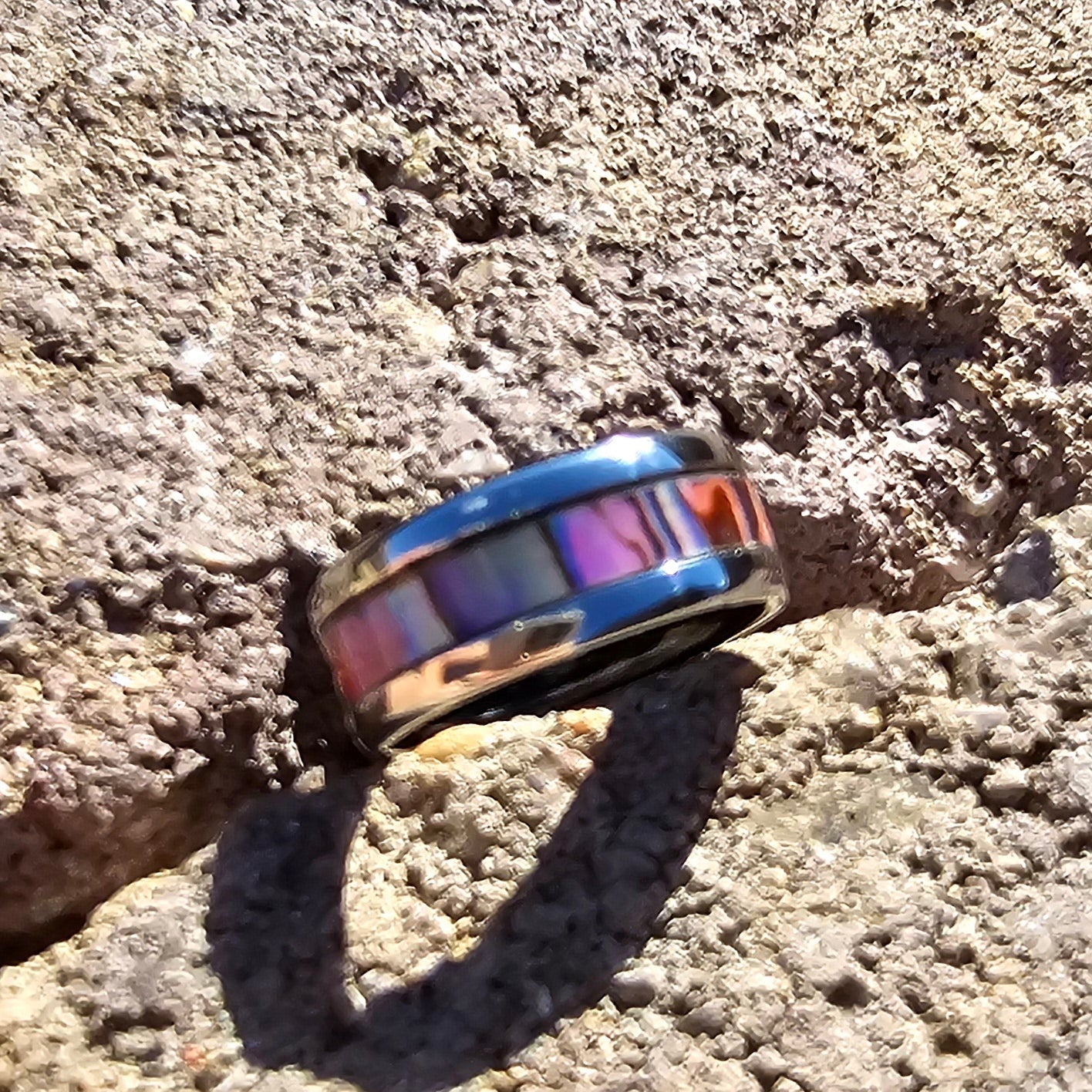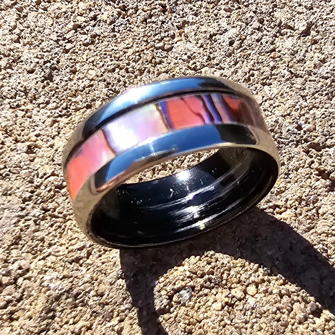 8mm stainless steel, black liner, orange abalone inlay, size 6.5