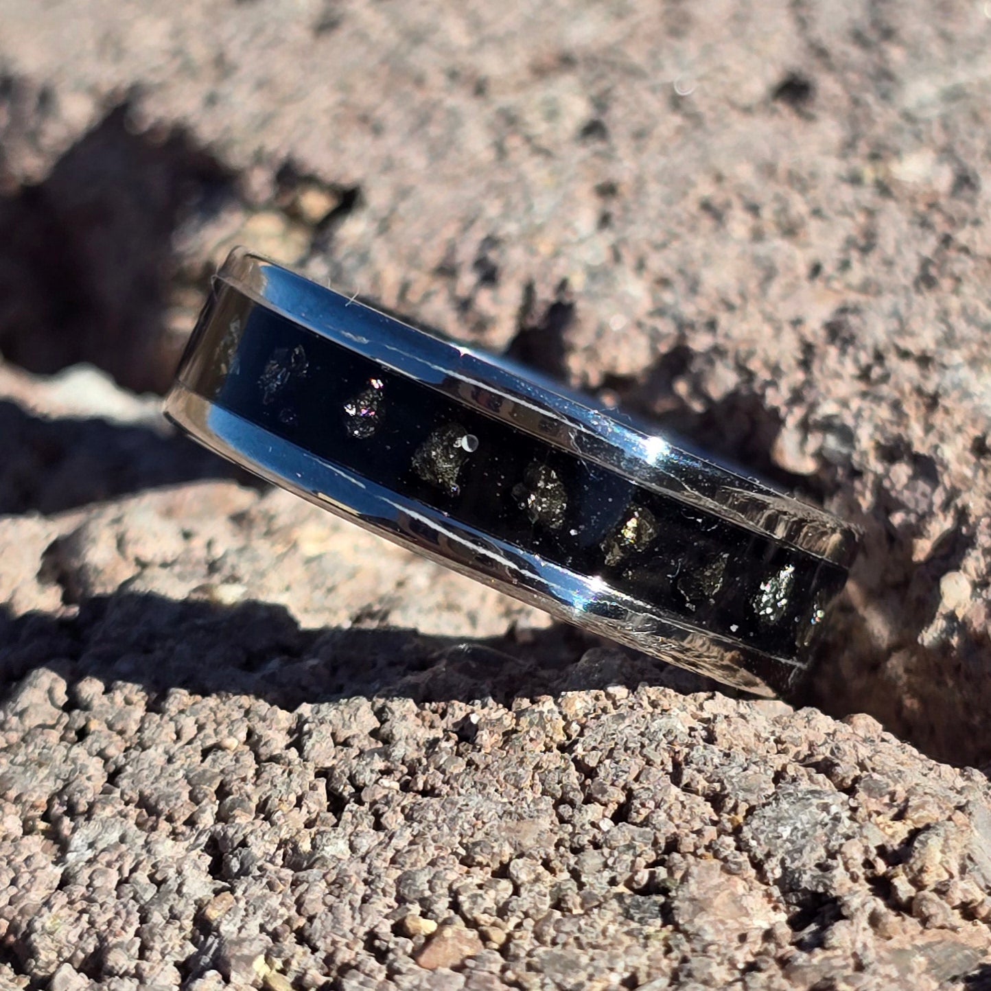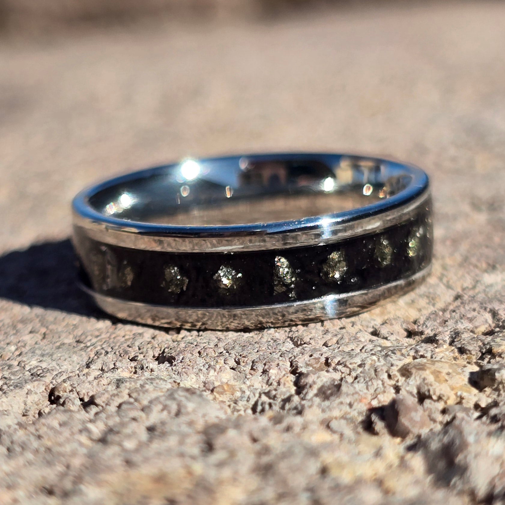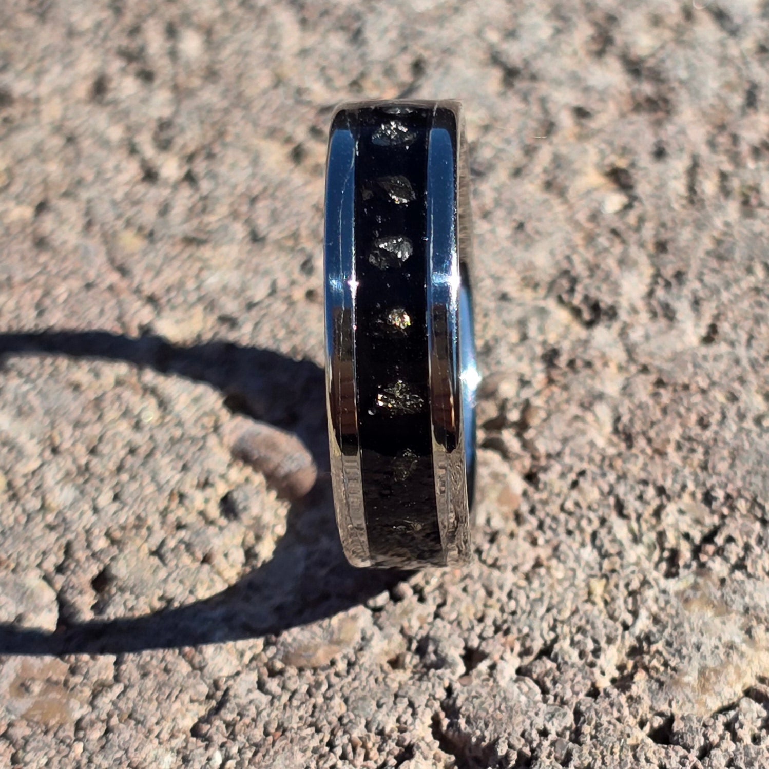 6mm stainless steel, black inlayed with iron pyrite, size 8.5