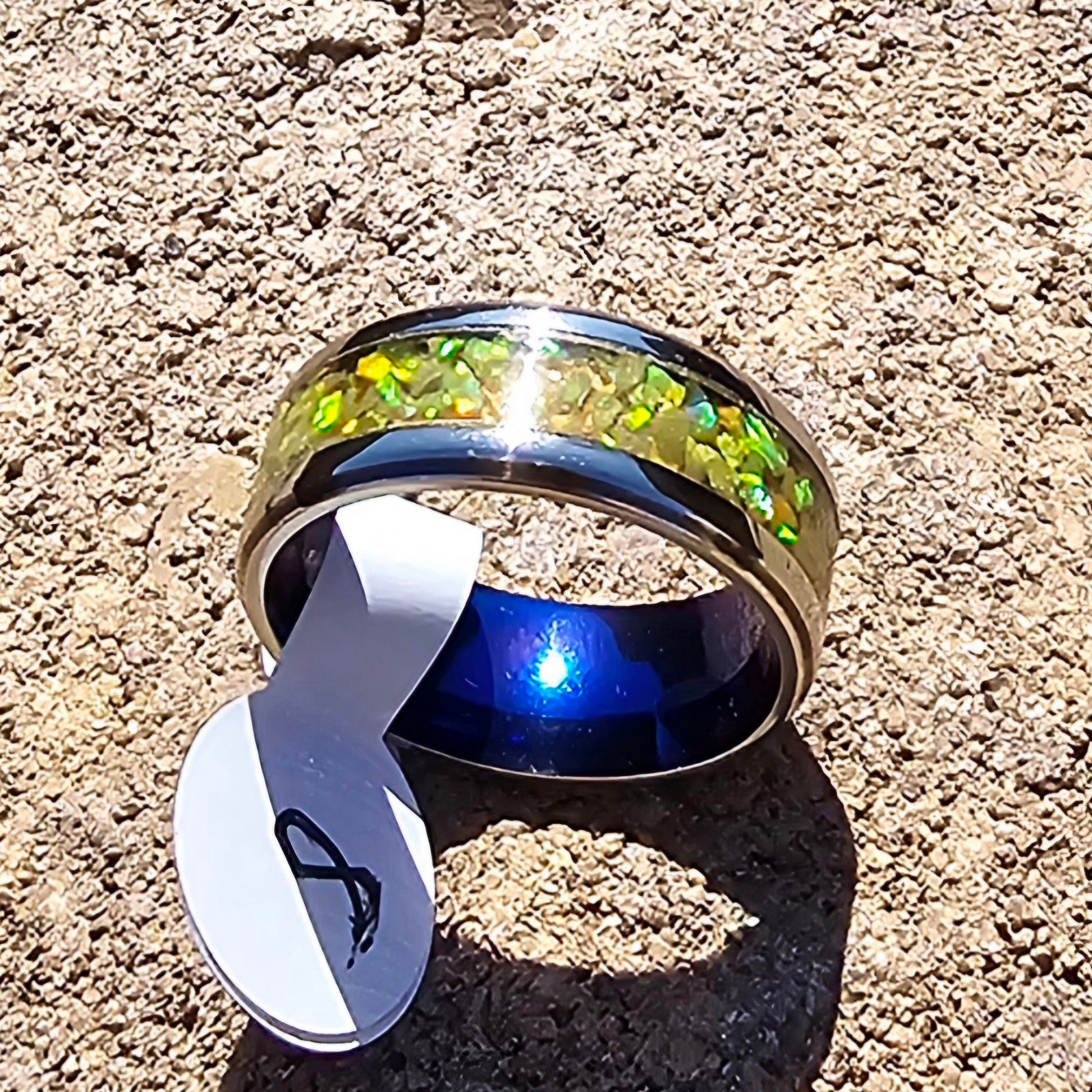 8mm stainless steel, blue liner, inlayed with gold opals, size 8