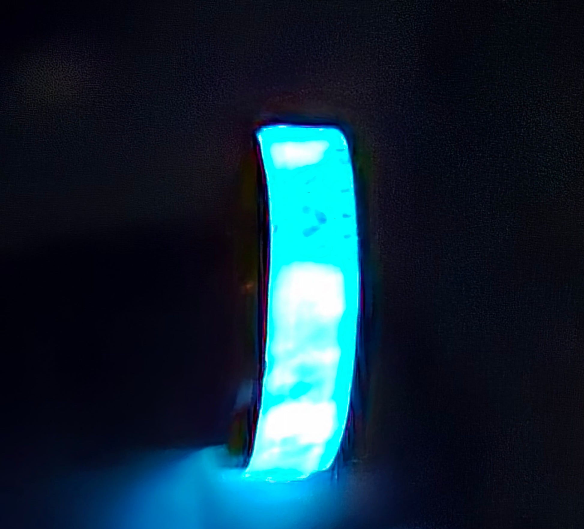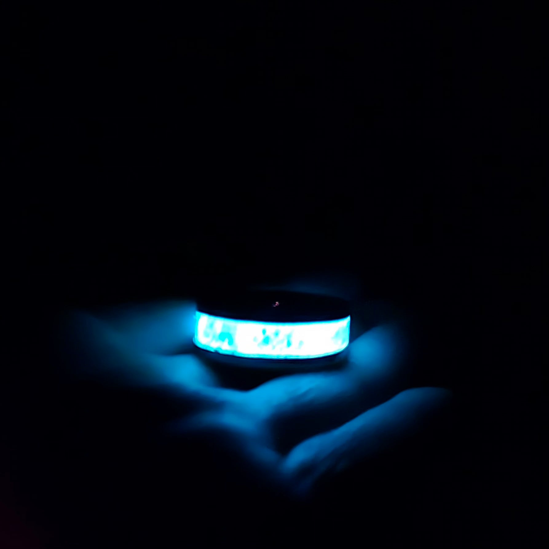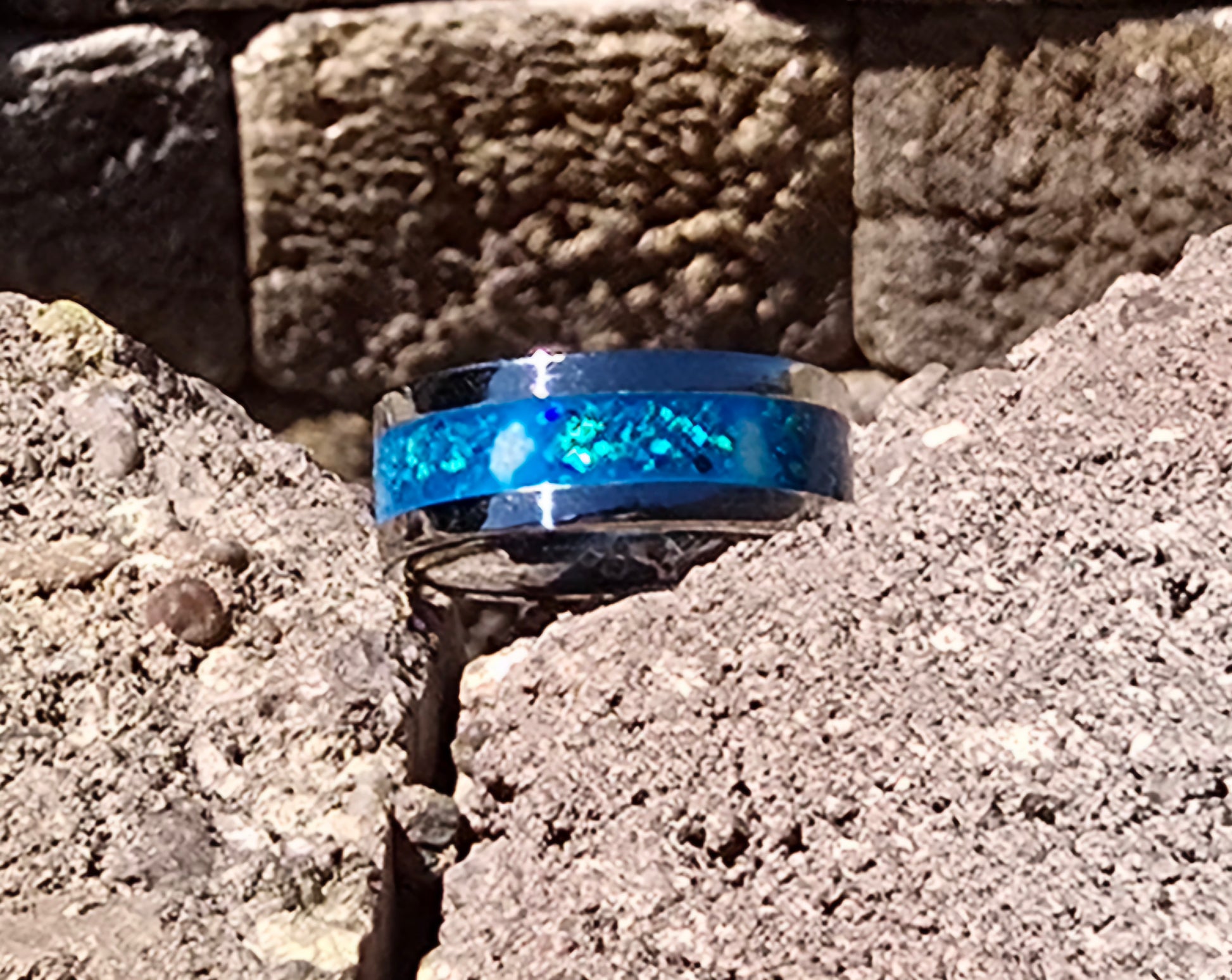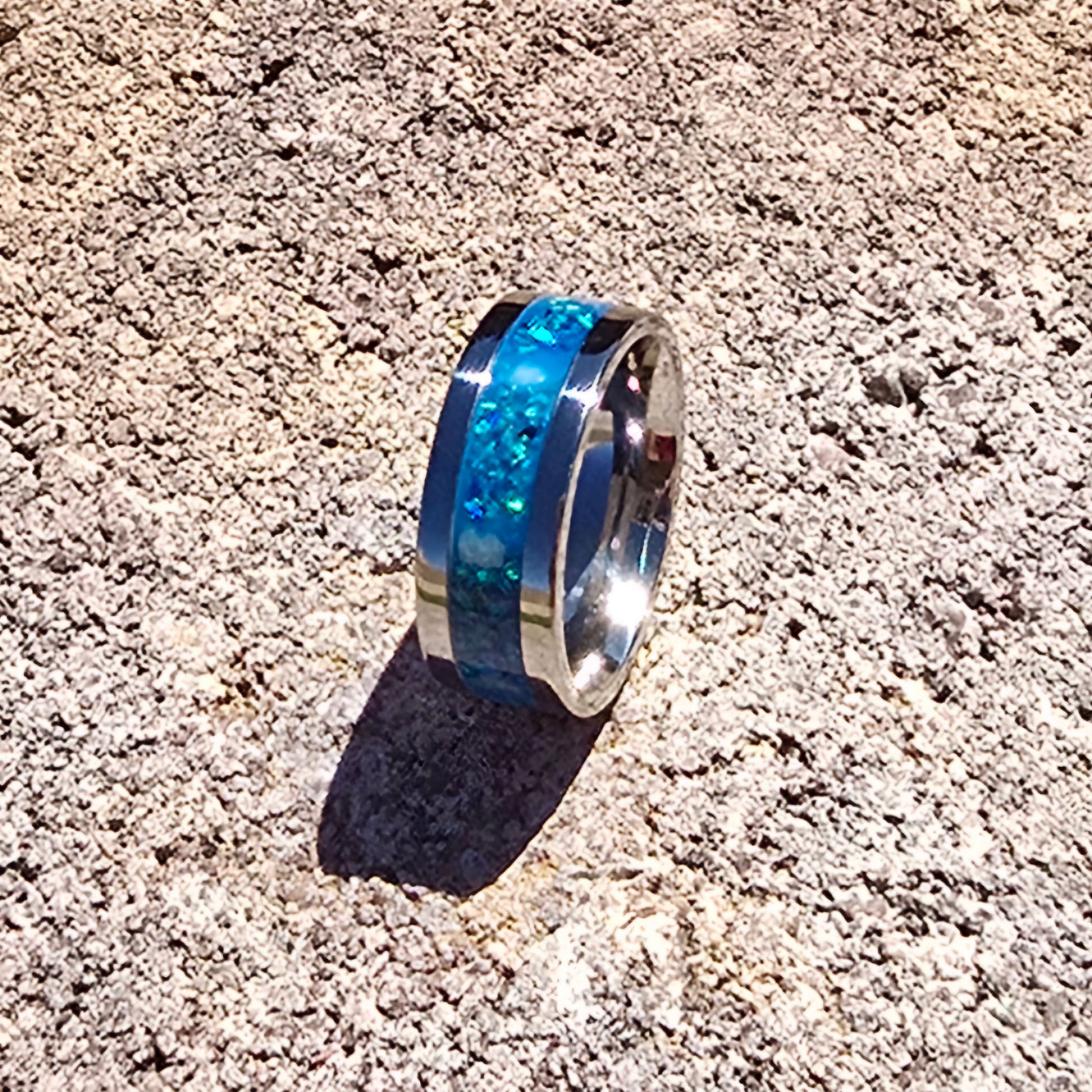 8mm stainless steel, inlayed with blue glow powder, blue opals and Aqua glow stones, size 8.5