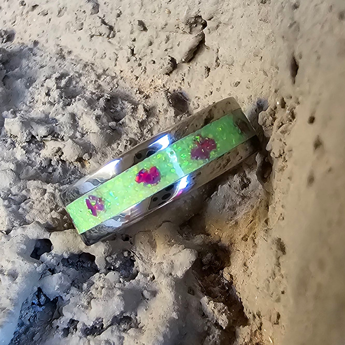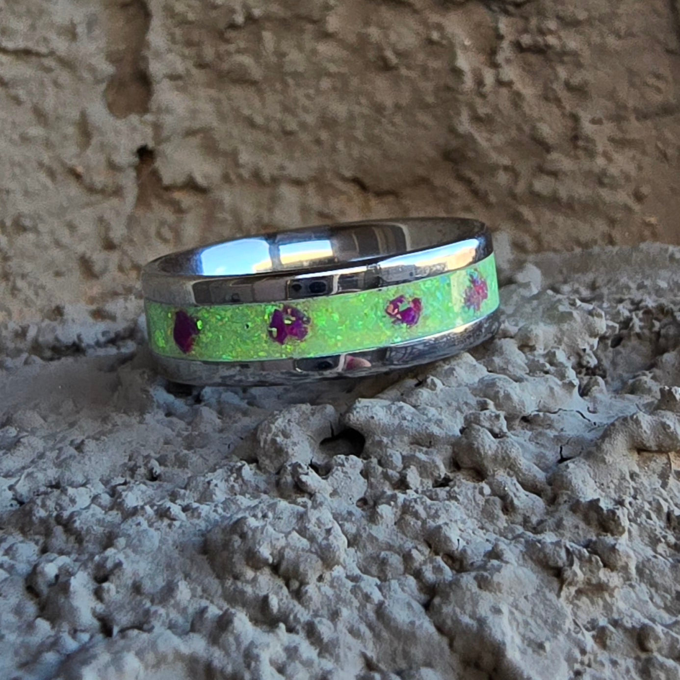 6mm stainless steel inlayed with lime green and purple opals, size 6.5