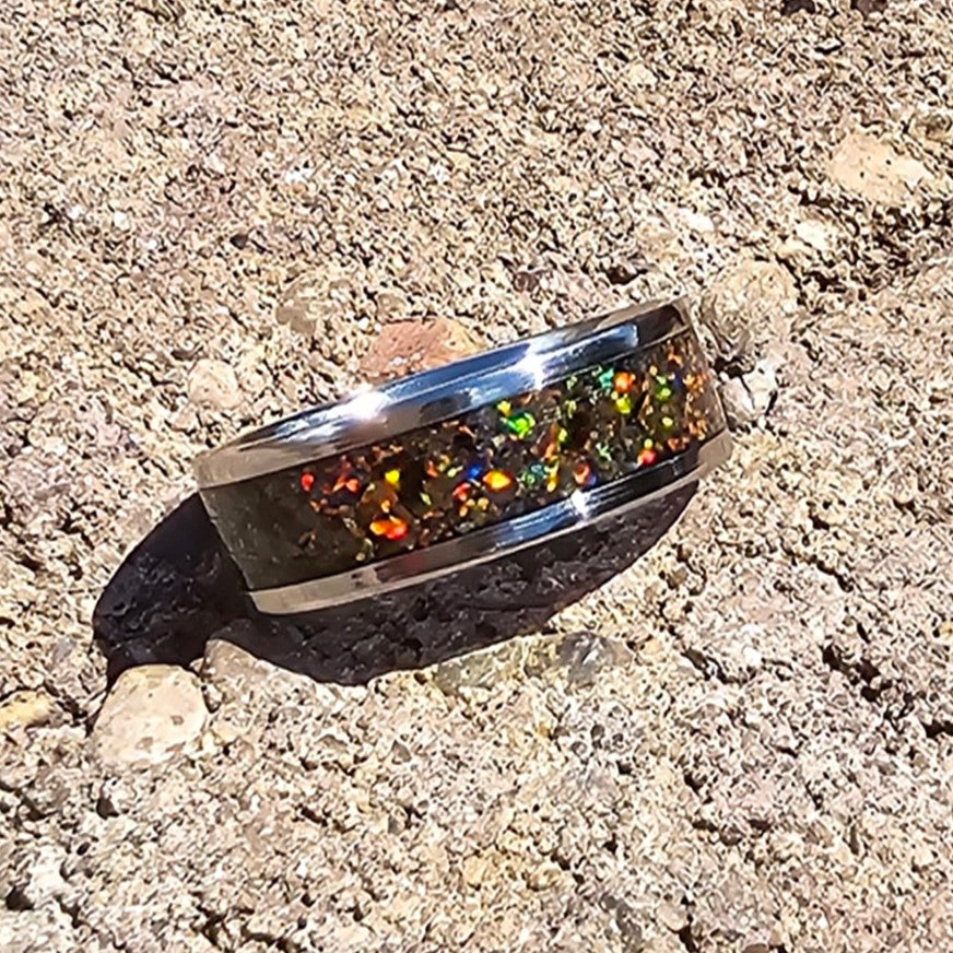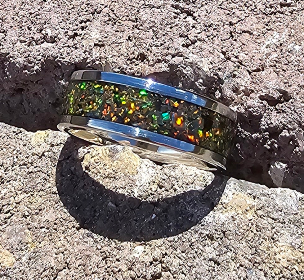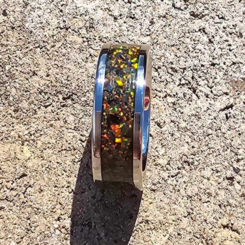 8mm stainless steel inlayed with multicolor opal, size 11.5
