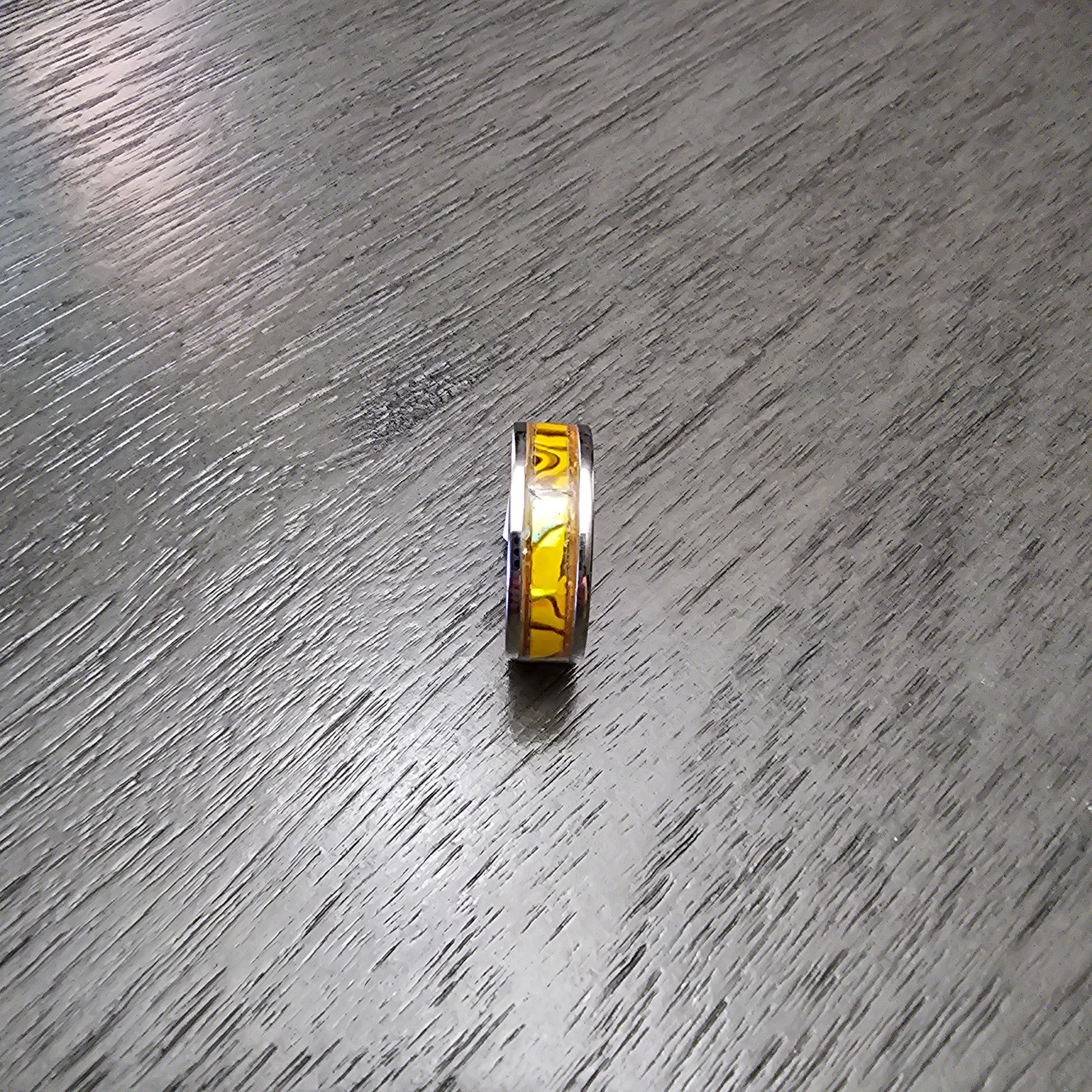 8mm stainless steel, yellow abalone inlay, size 11.5