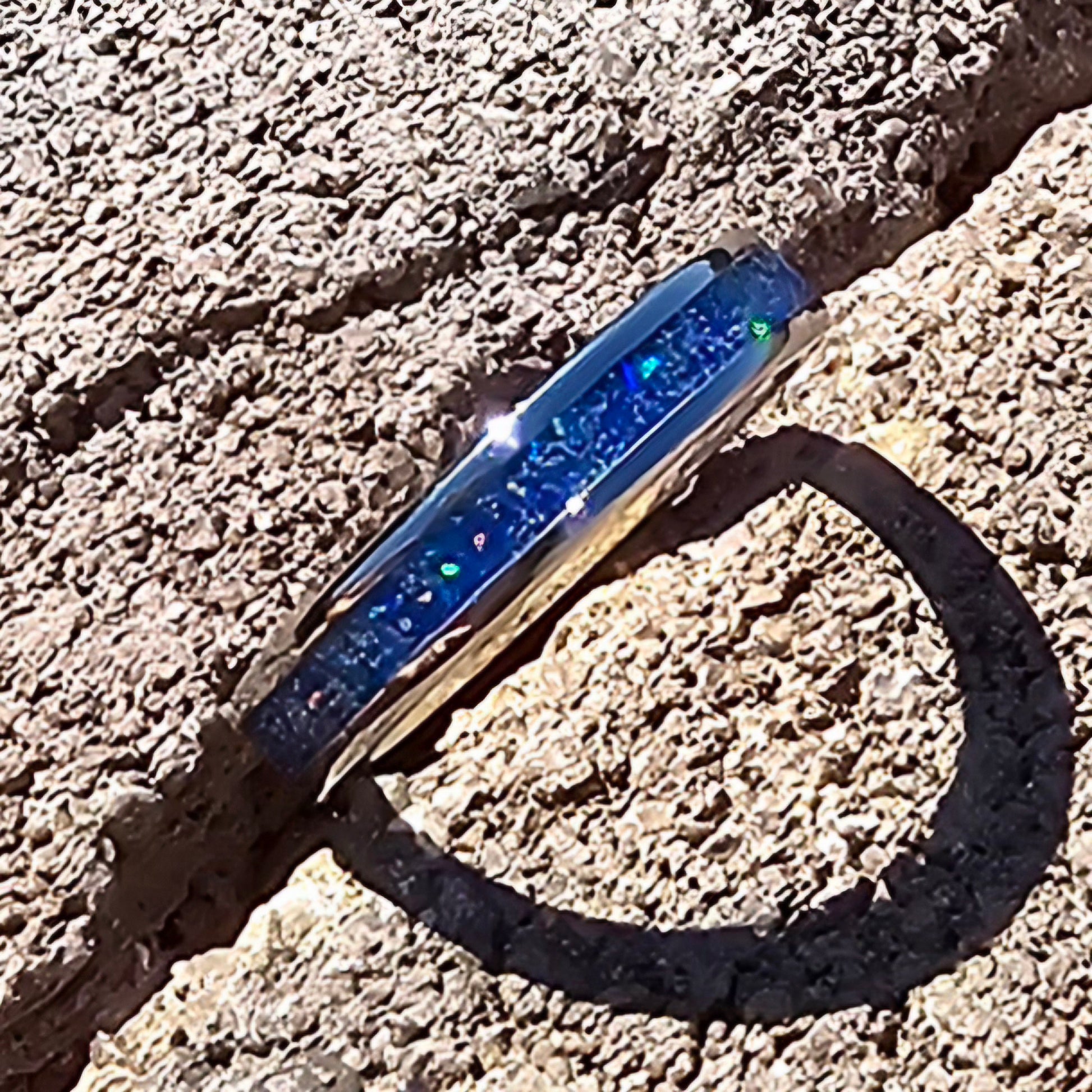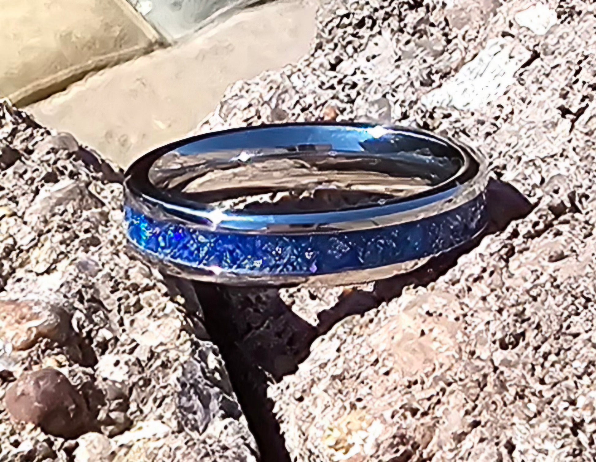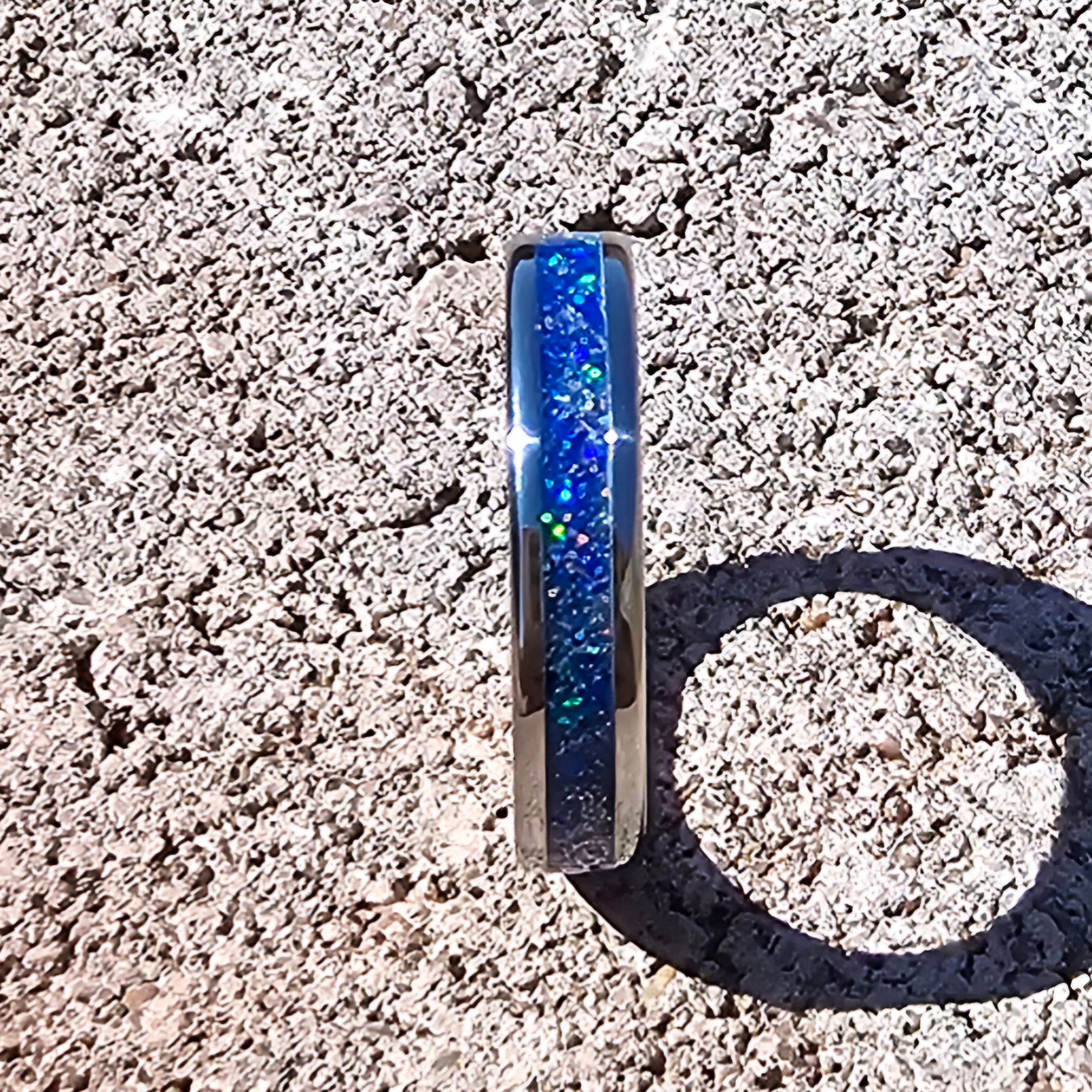 4mm stainless steel, inlayed with blue opals and diamond dust, size 6