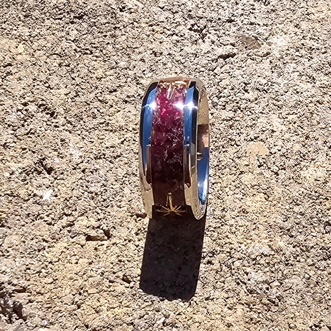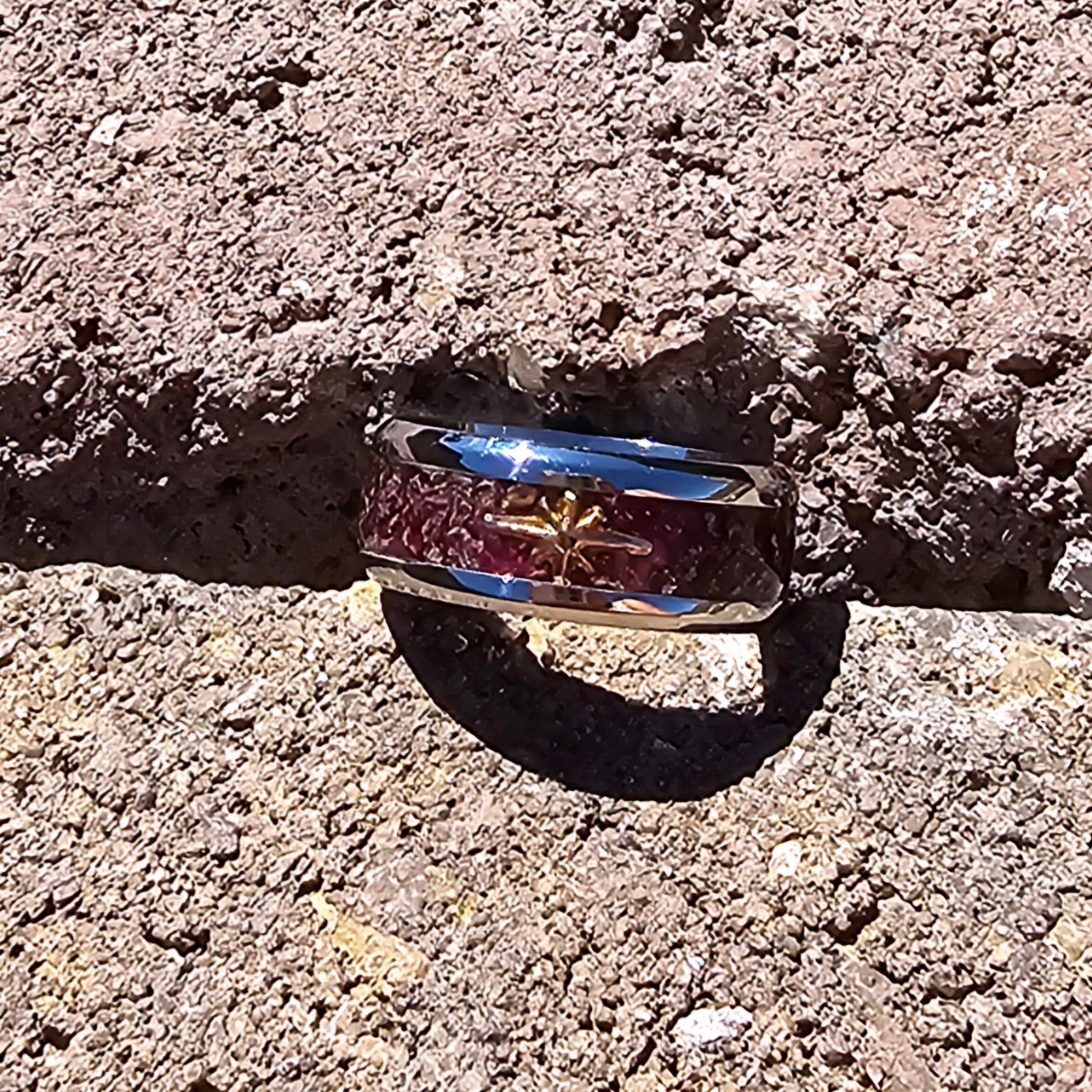 8mm stainless steel inlayed with texas sage blooms and stars, size 7
