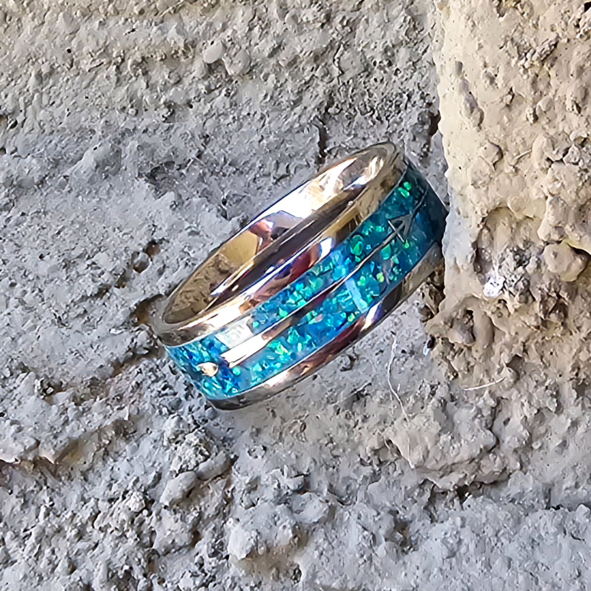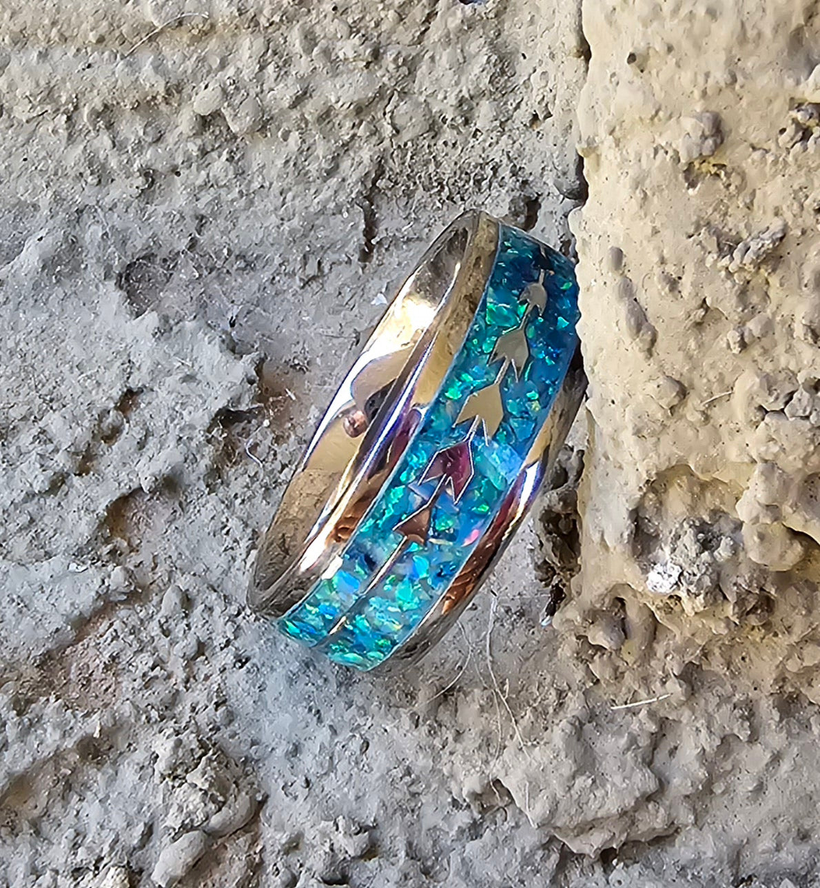 Stainless steel, inlayed with blue- green opals and metal arrow band, size 10.5