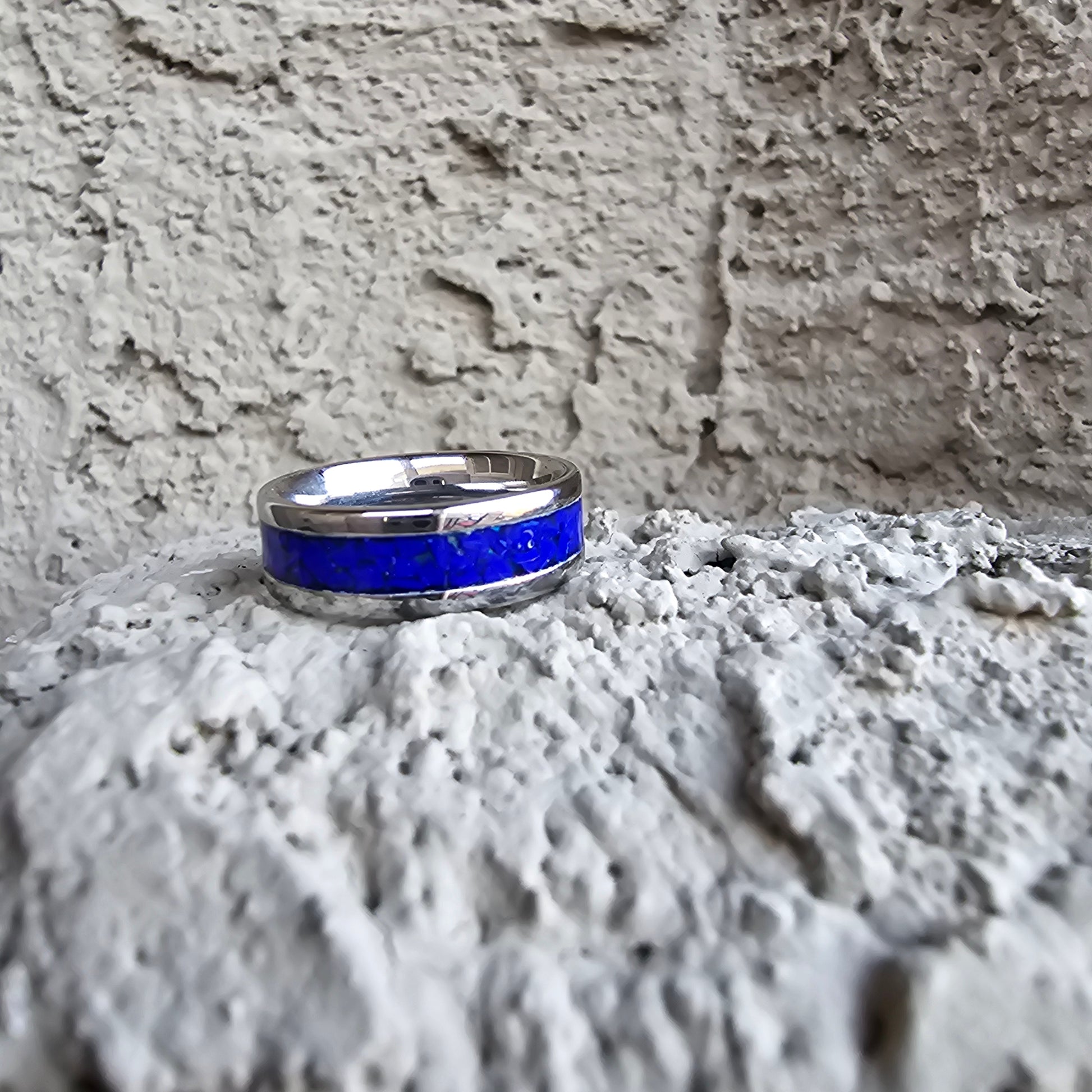 6mm stainless steel inlayed with blue goldstone, size 5.5
