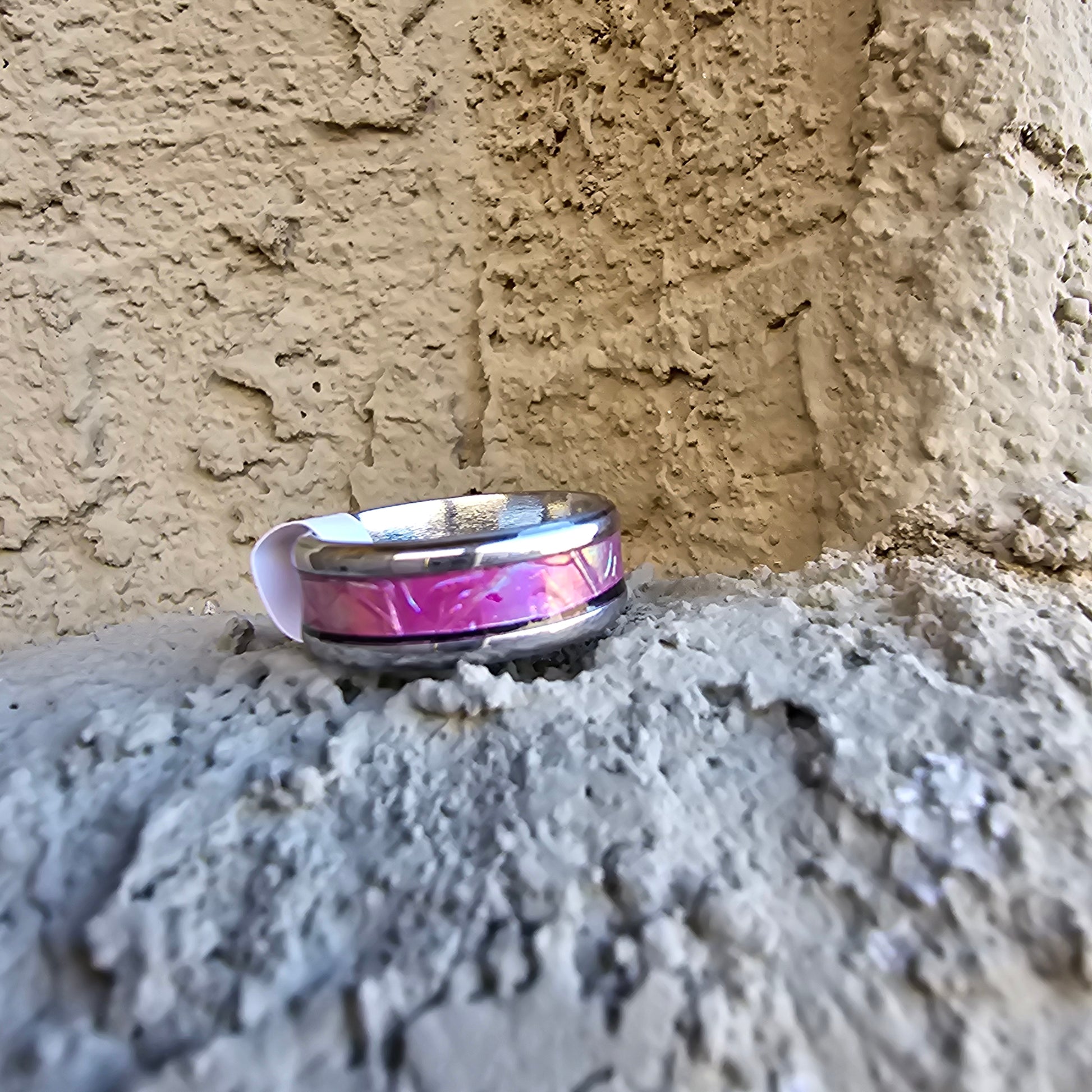 8mm stainless steel, inlayed with pink dycrolom, SZ 9