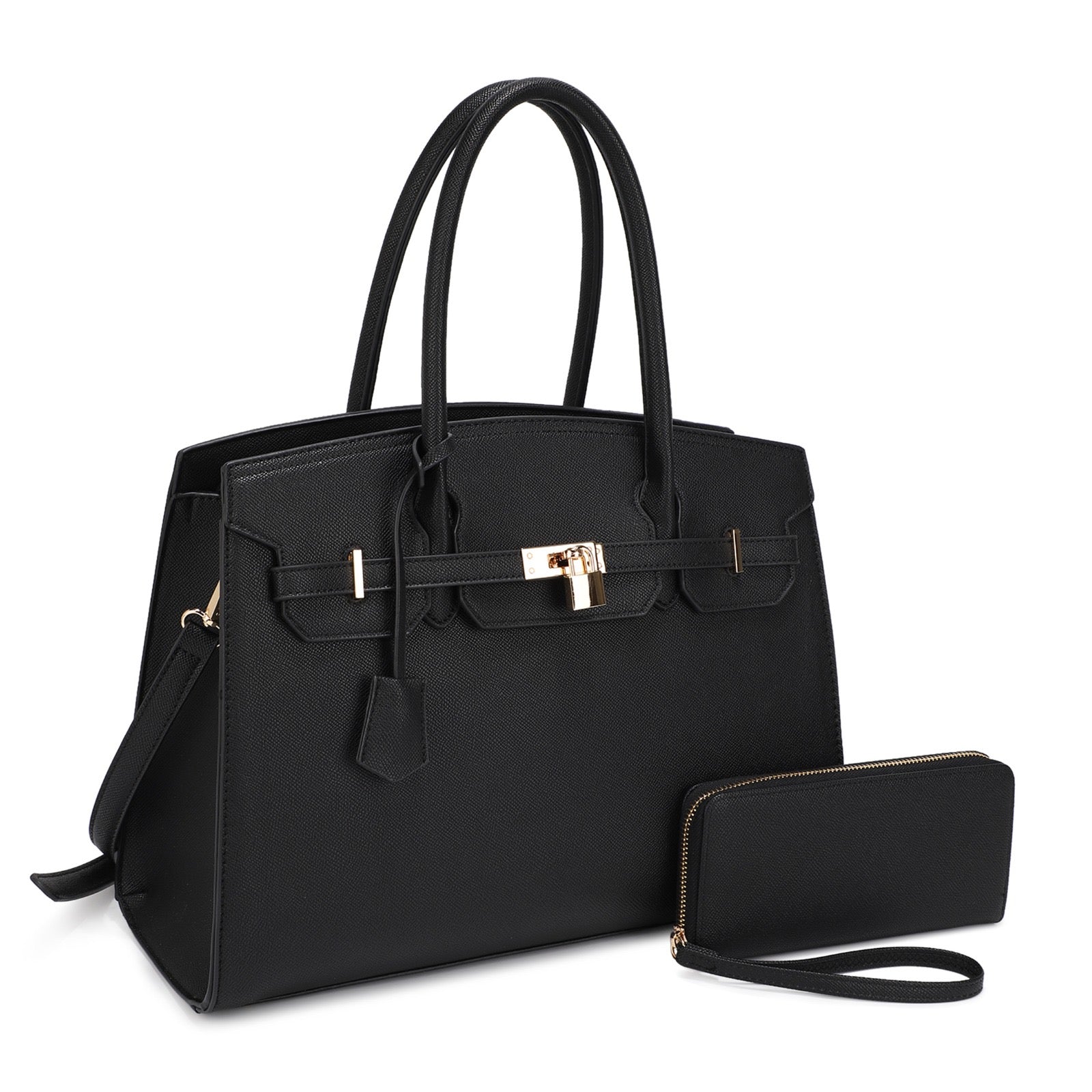 Polished sophistication with this structured tote in textured vegan leather. Featuring double top handles, a detachable shoulder strap, and a gold padlock accent, it's a refined take on a timeless design. The matching wallet makes it the ultimate carryall for workdays, meetings, or travel.