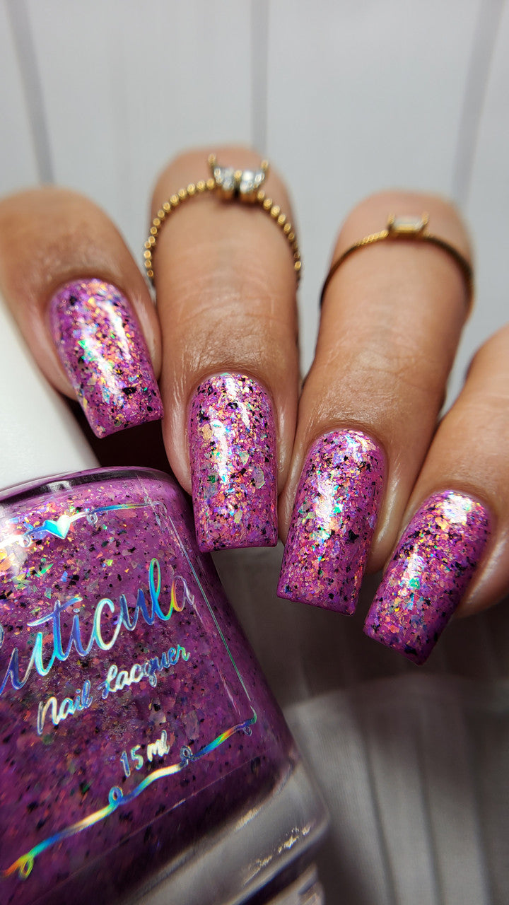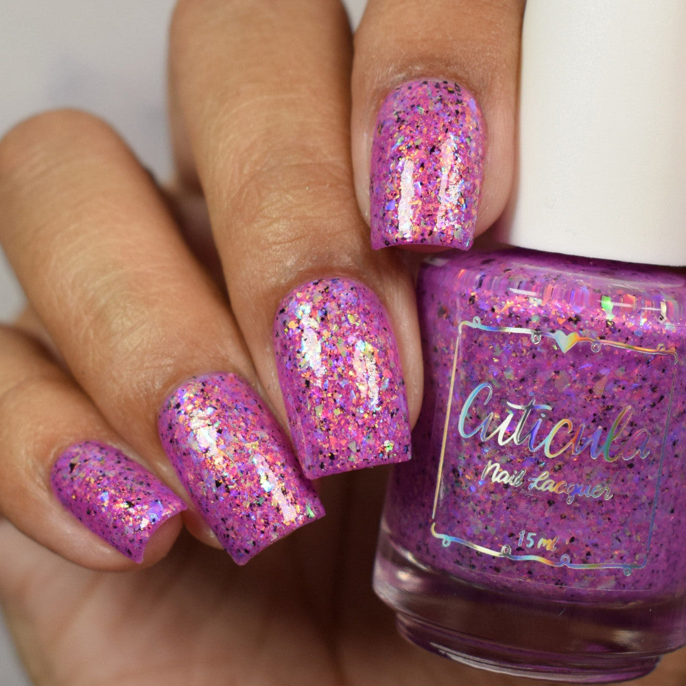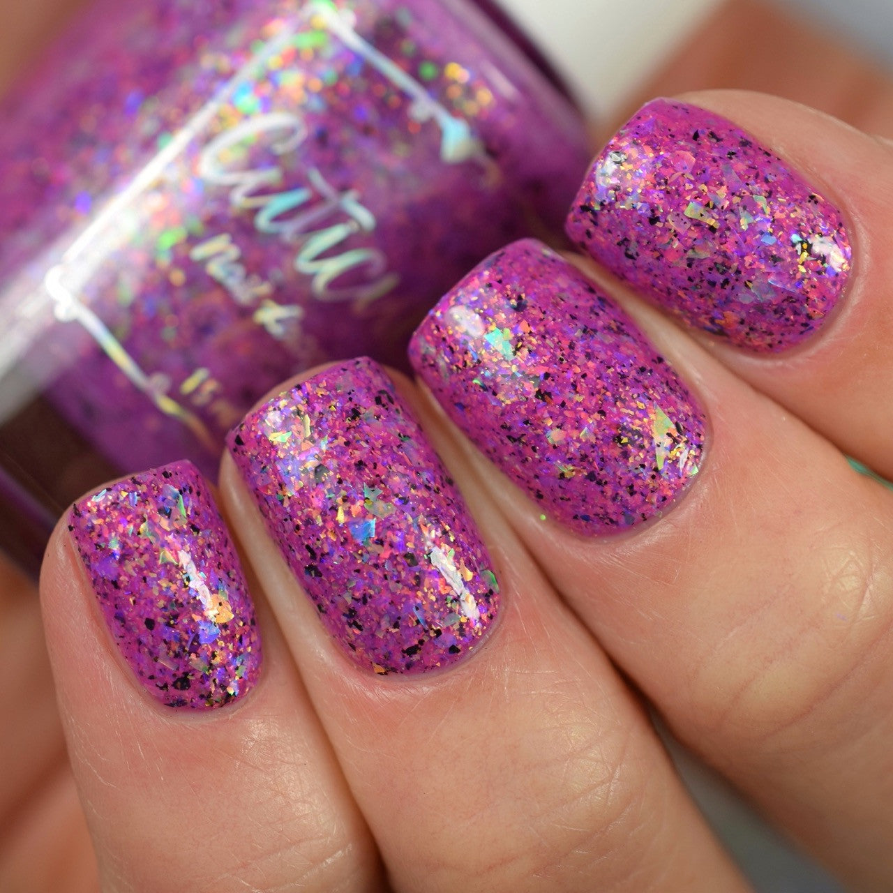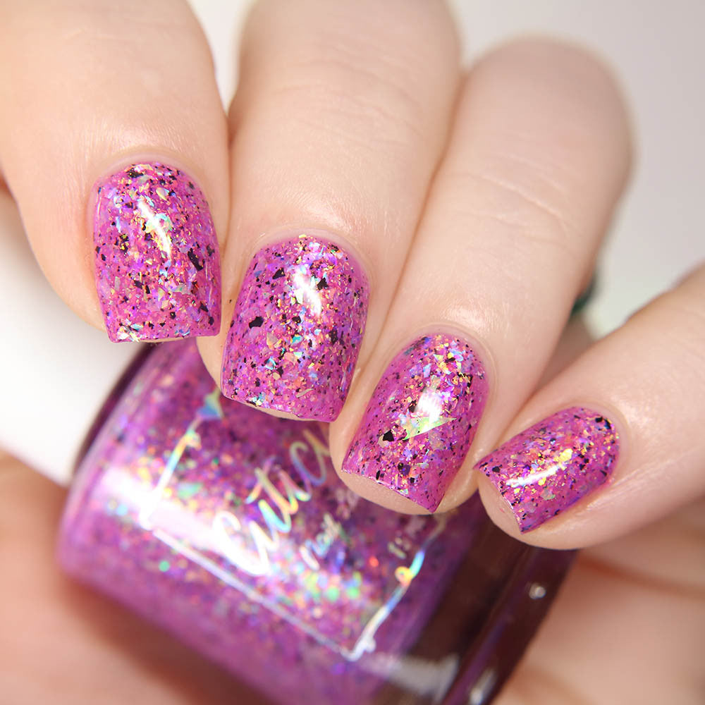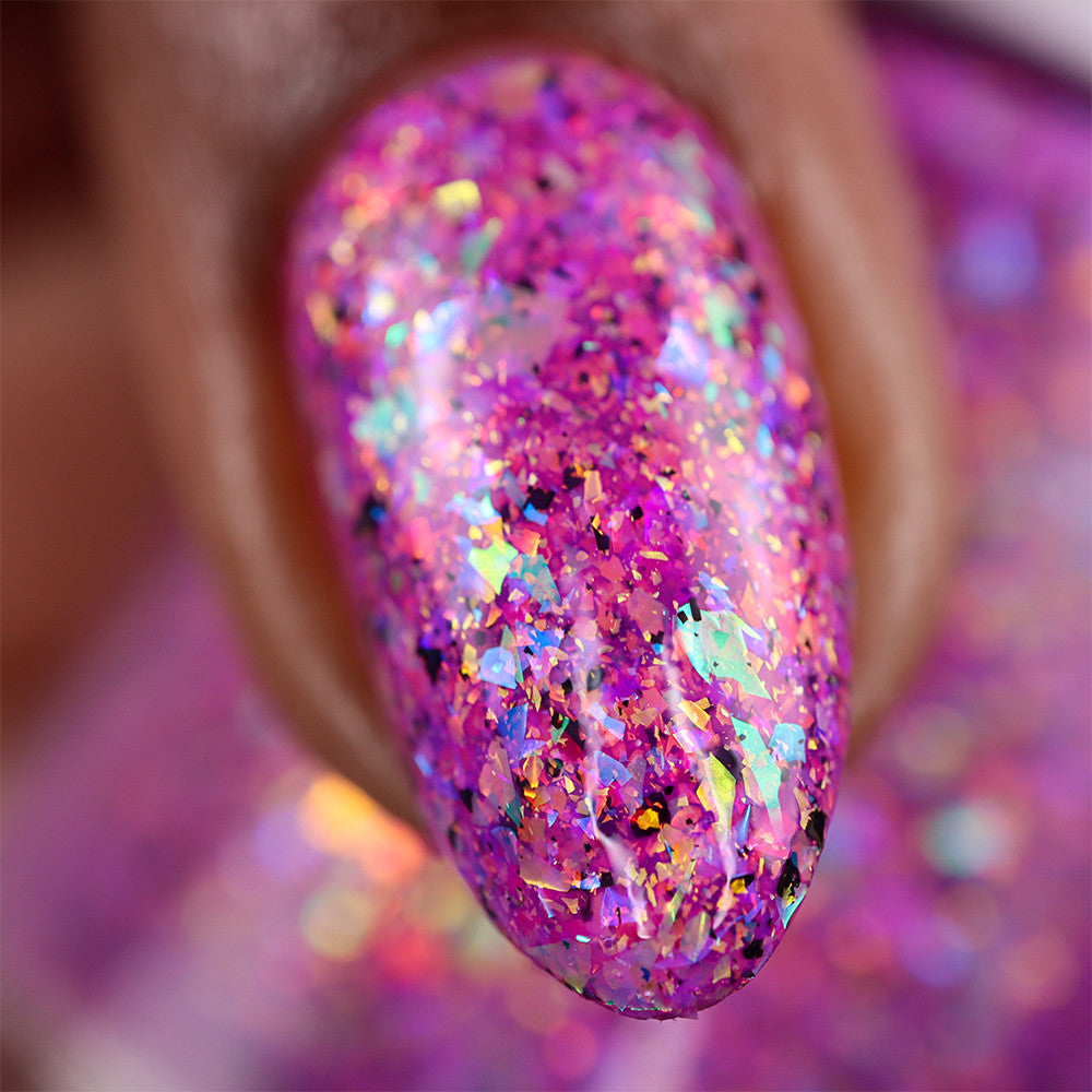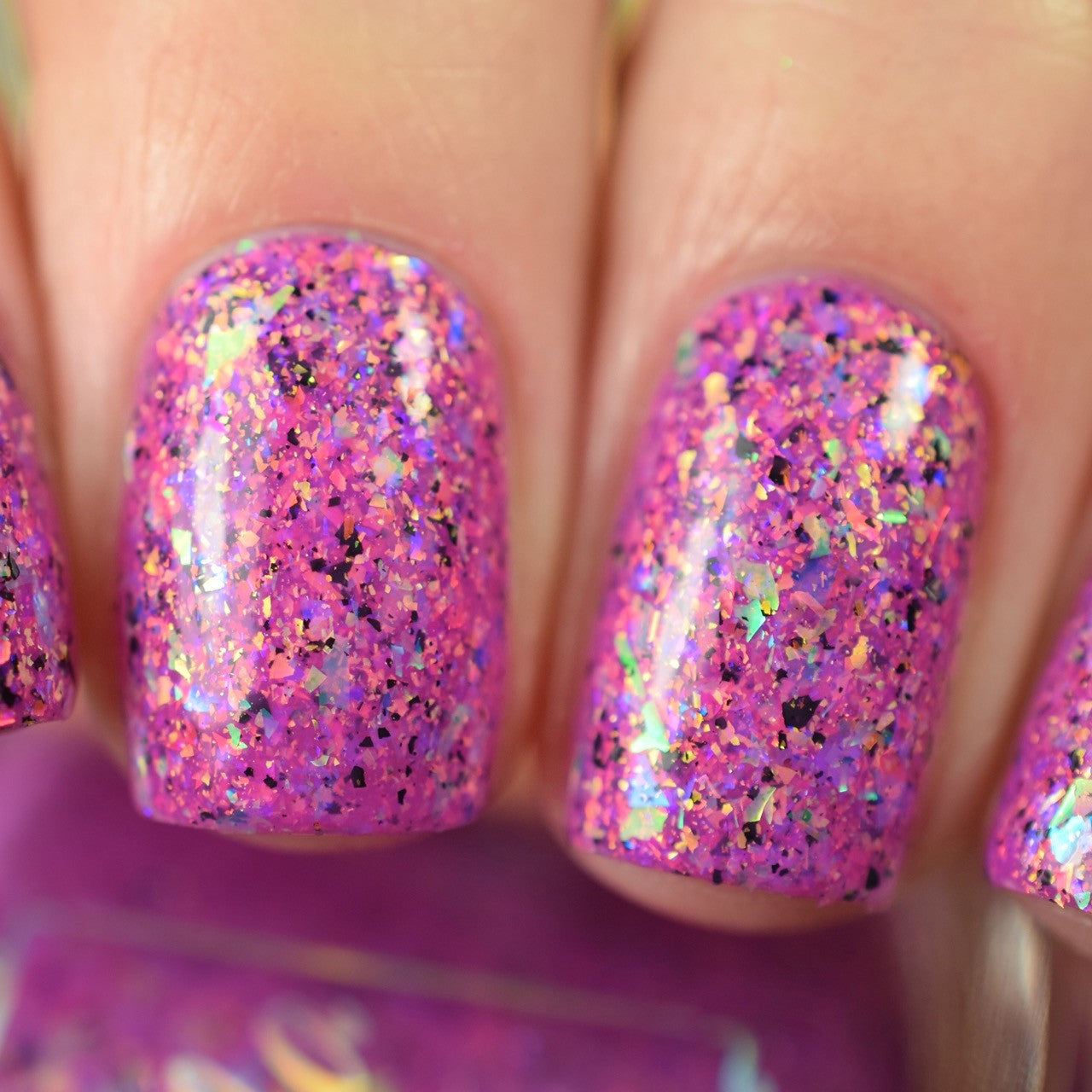 Taro Milk Tea *Reimagined* is a magenta crelly base full of rainbow shifting glass flakes, and black flakes.
