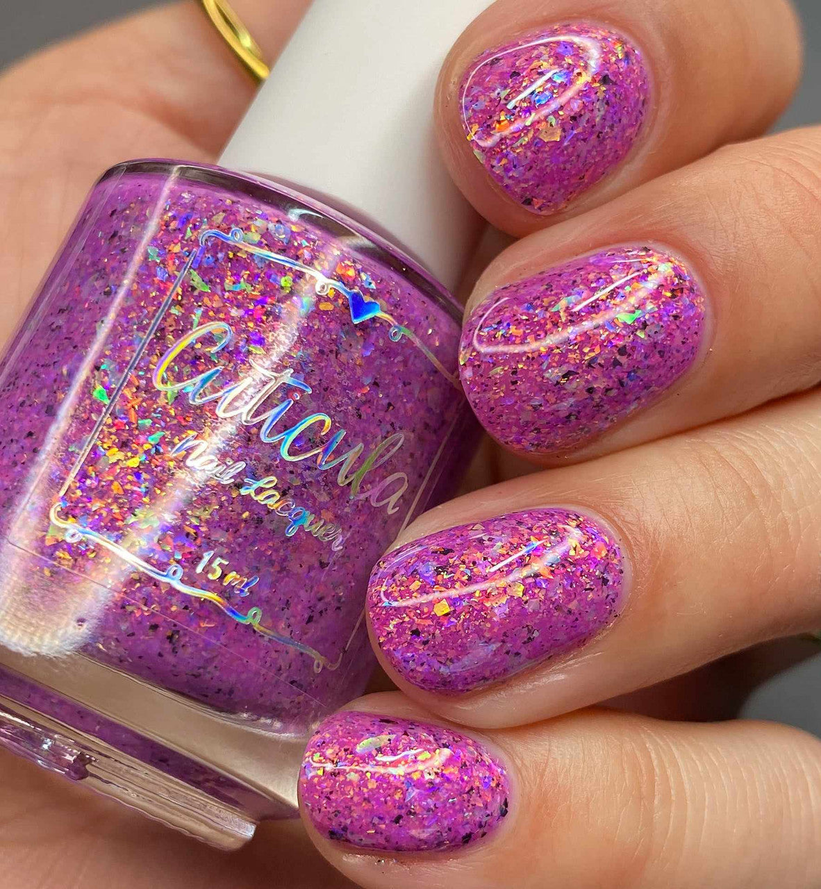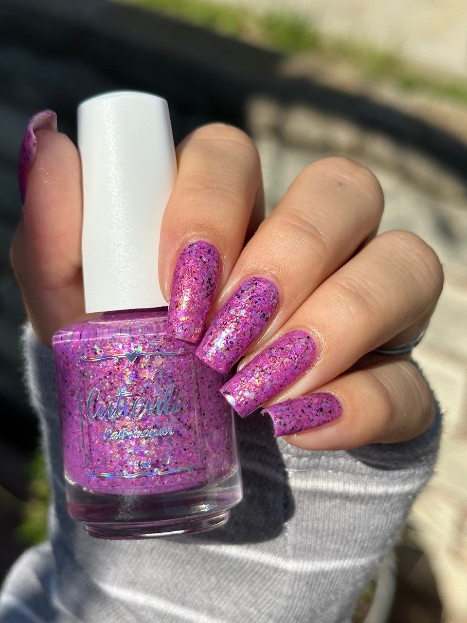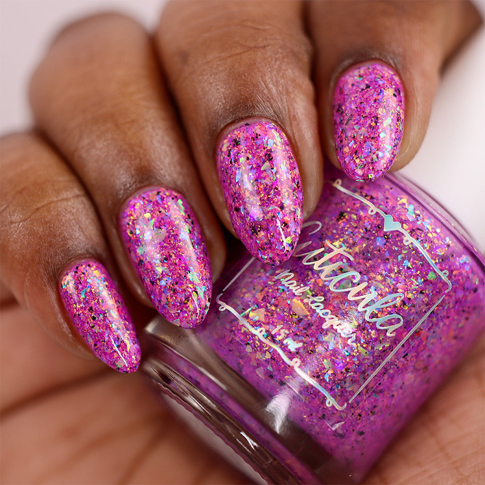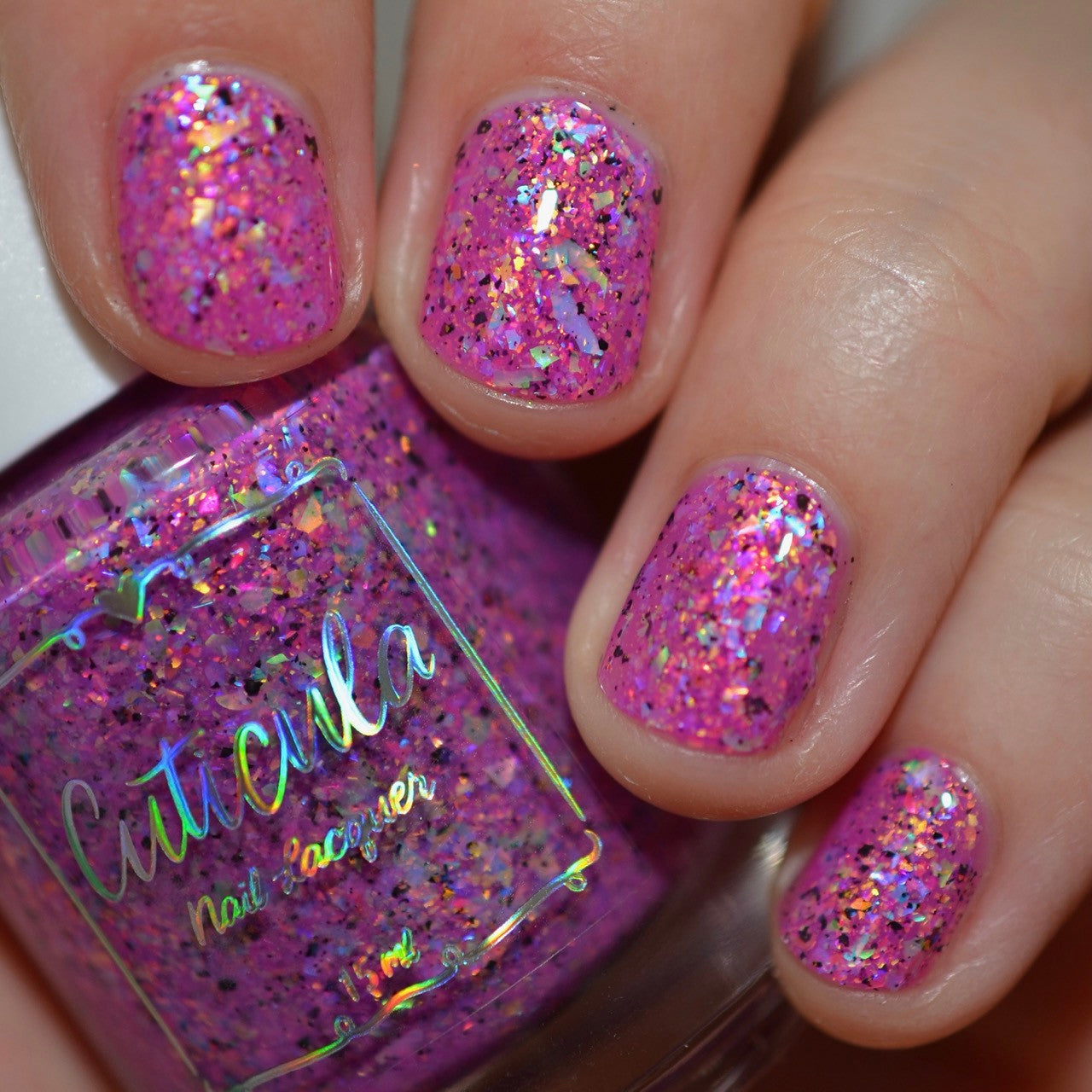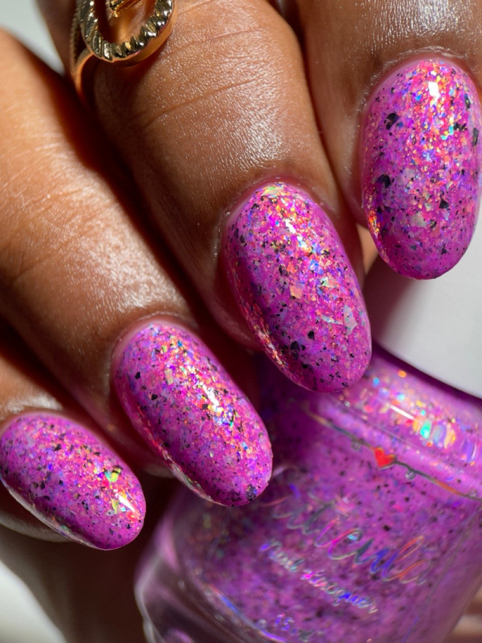 Taro Milk Tea *Reimagined* is a magenta crelly base full of rainbow shifting glass flakes, and black flakes.