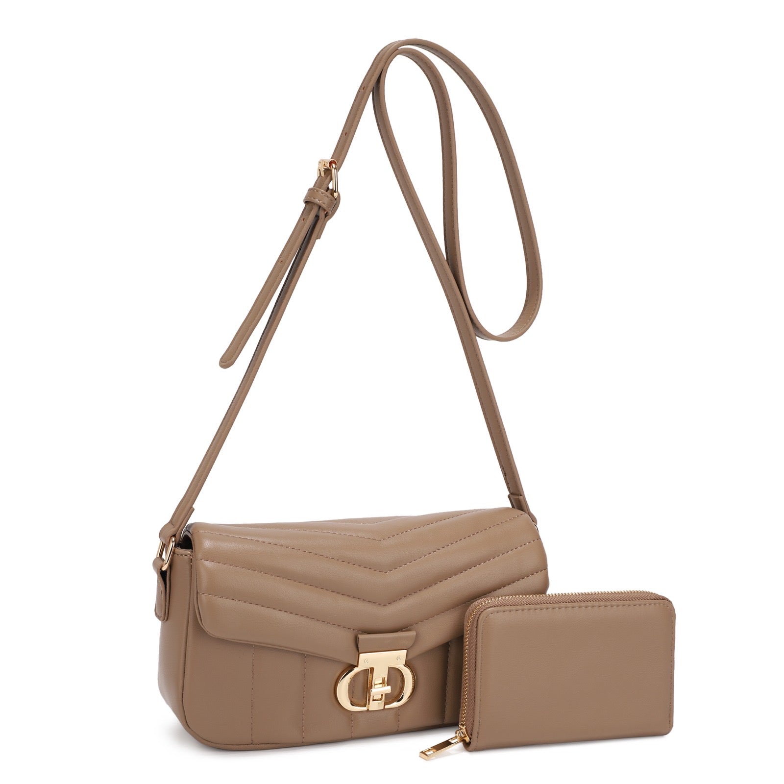 Chic and functional, this quilted taupe shoulder bag is made from soft vegan leather with beautiful stitching and gold tone hardware. Comes with a matching wallet for a polished and coordinated look.