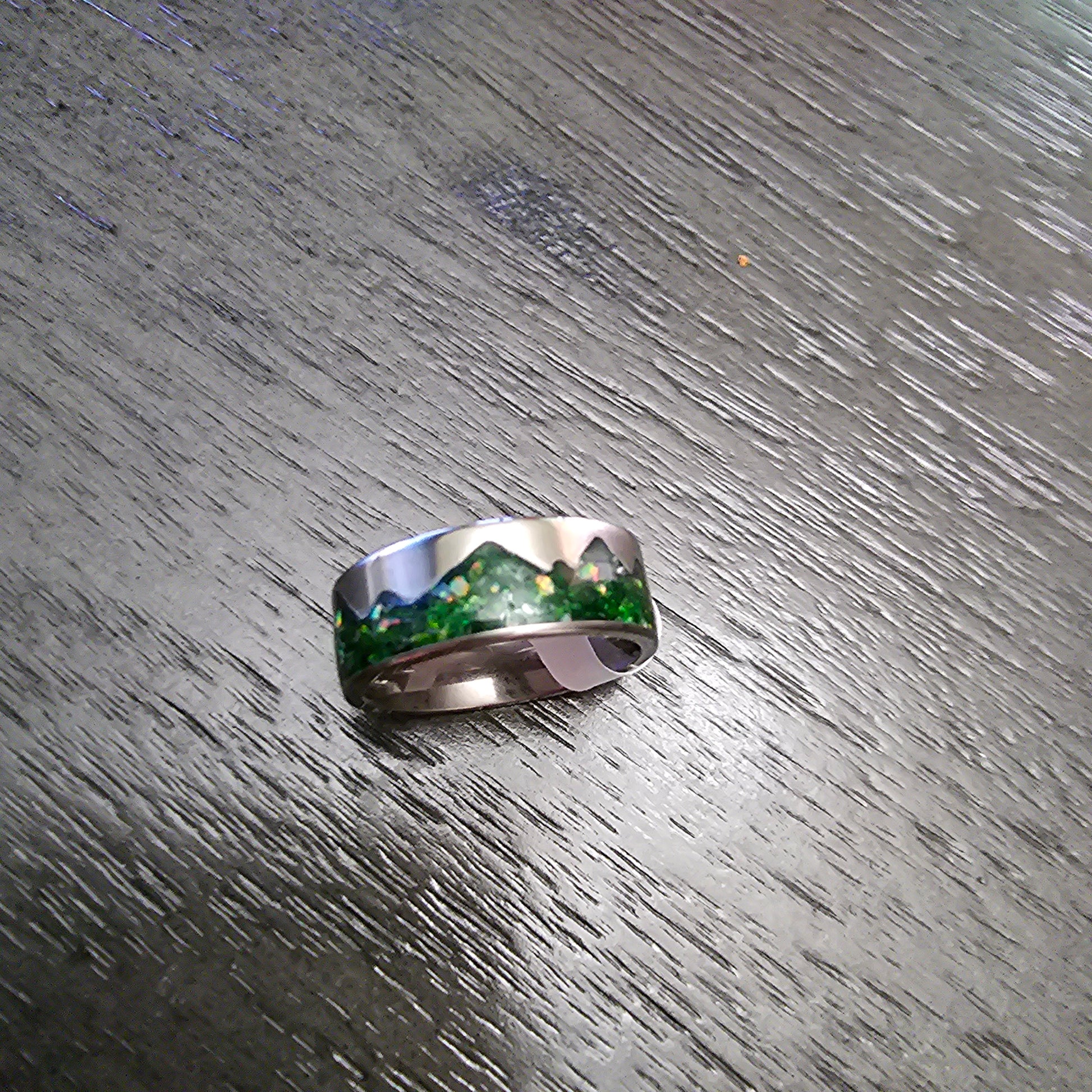 Titanium mountain ring design, inlayed with green goldstone & white opals, size 9