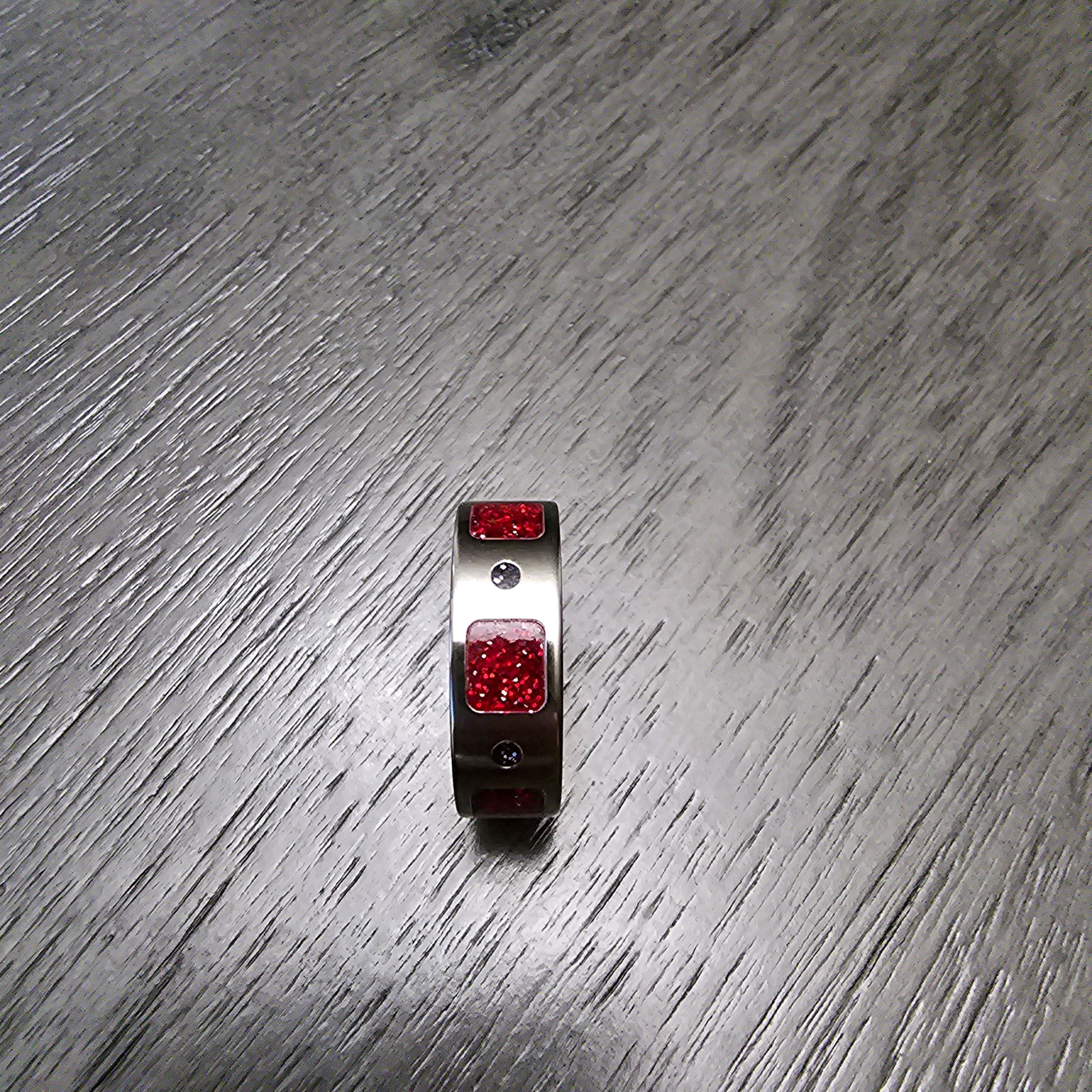 Titanium Square & Dot design, inlayed with red opals and black diamond dust, size 10.5