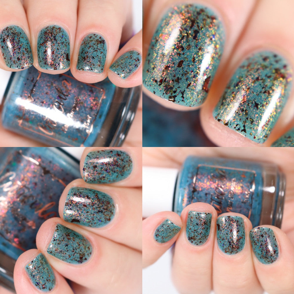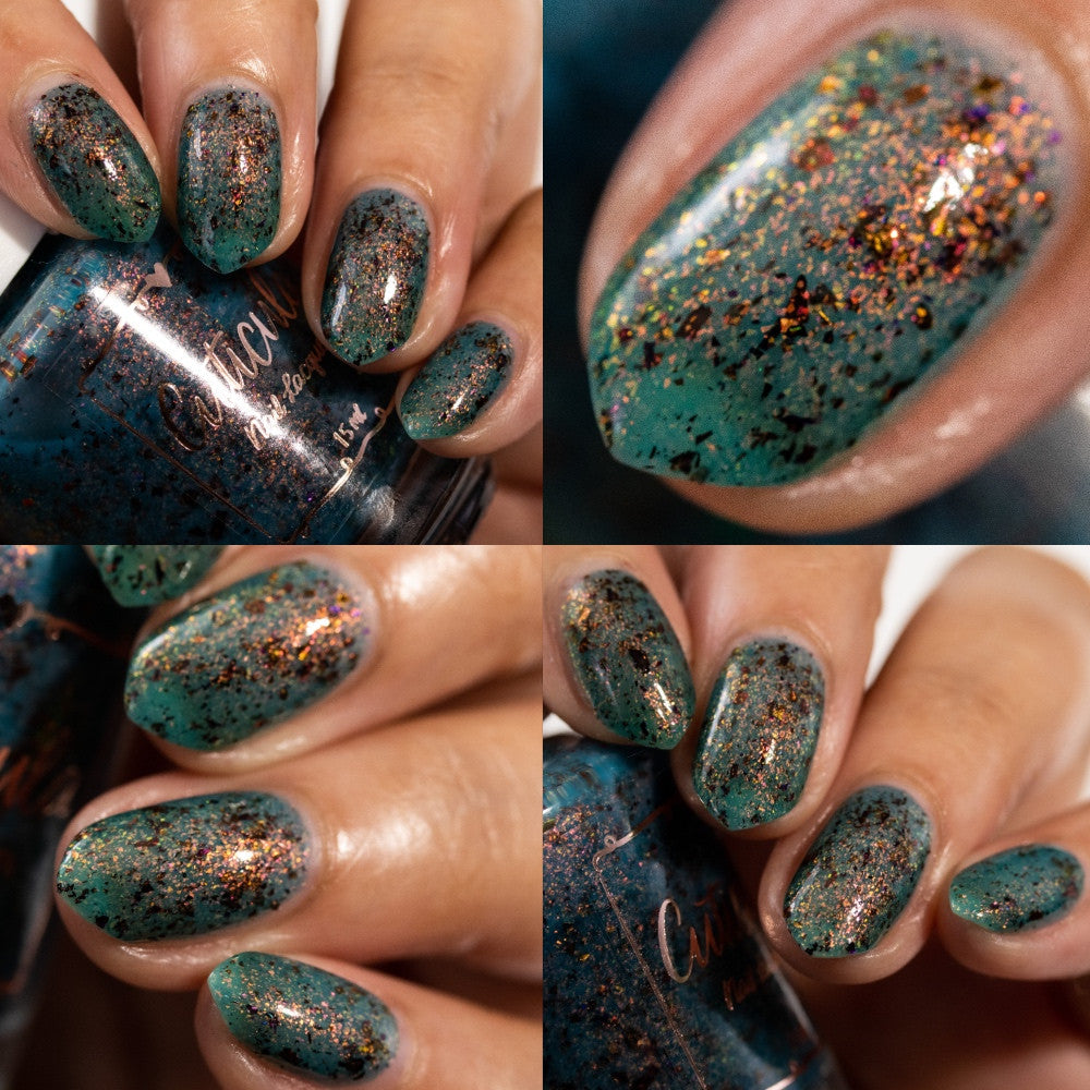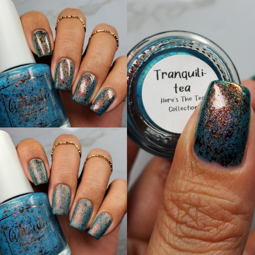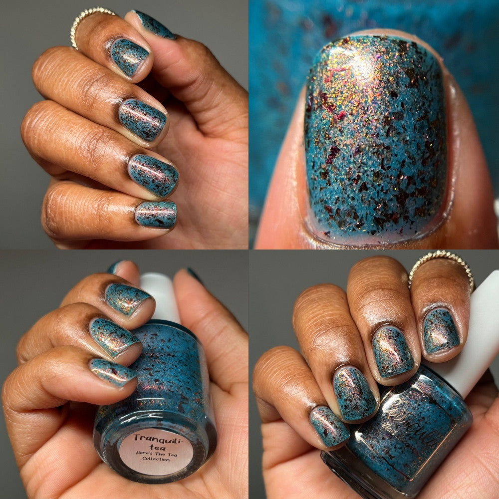 'Tranquili-tea' a turquoise base with large orange/gold/green shifting shimmer and black/red/green/gold ultra chrome shifting flakes. For best results, start with any of our available base coats and finish off your mani with any of our available top coats. Swatches by: @caitlinswatches @a_painted_queen @llaurenails @mikkelz_nails @captivated_by_grace @gotnail @yyulia_m @lovelylacquerist @lacquer_enthusiast33 @polishedjunesong This nail polish is 5 Free Ingredients: Nitrocellulose, Ethyl Acetate, Butyl Acetate, Isopropyl Alcohol, Ethyl Alcohol, Triphenyl Phosphate, Propyl Acetate, n-Butyl Alcohol, Colorants.