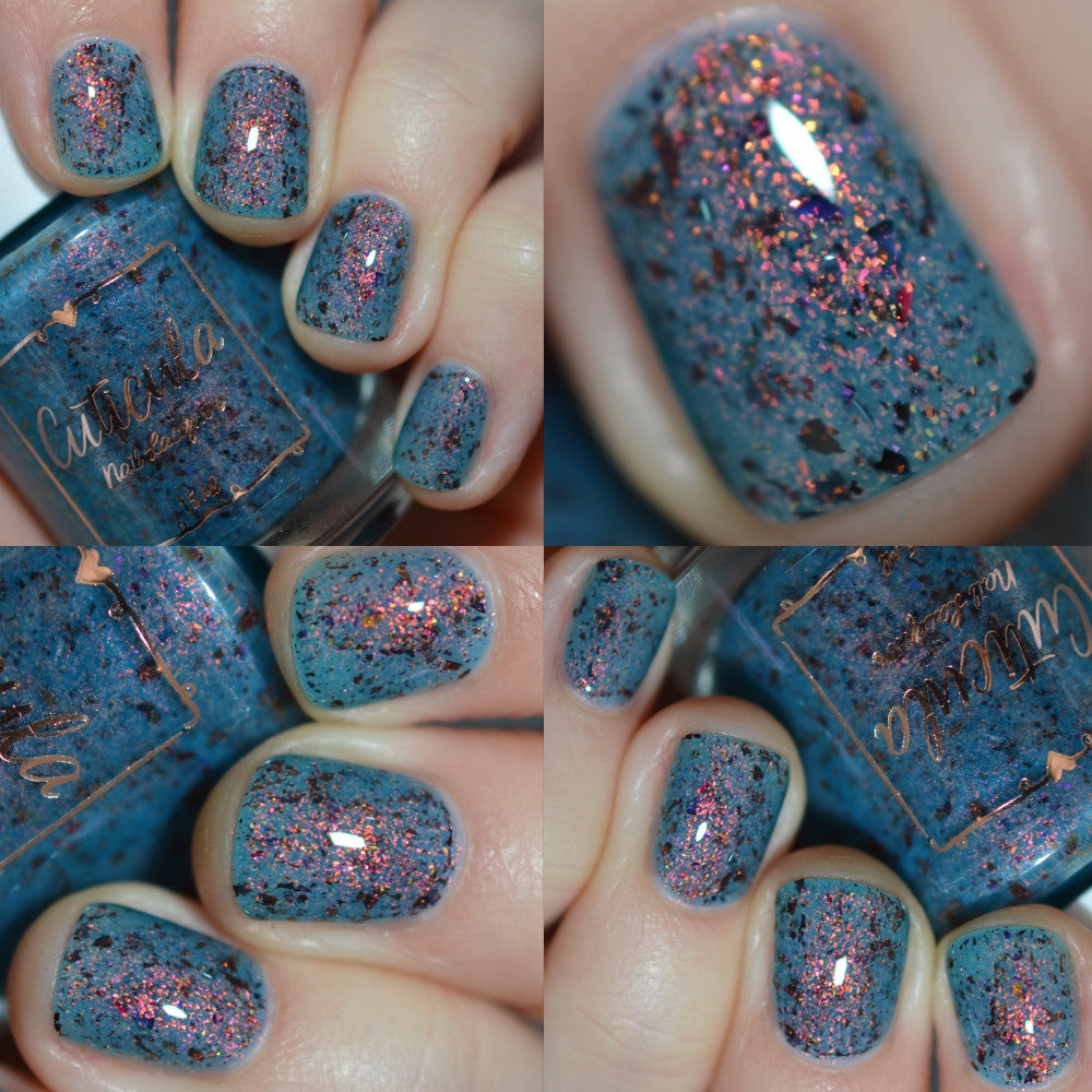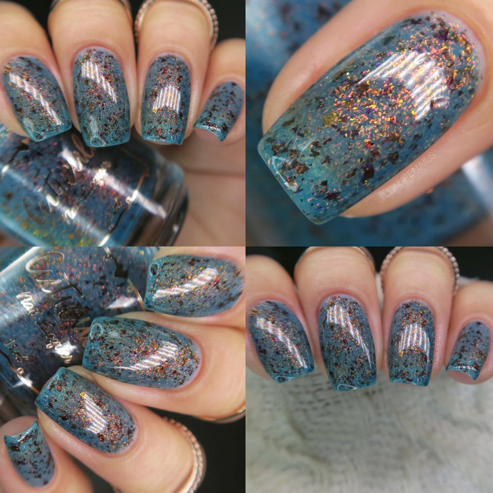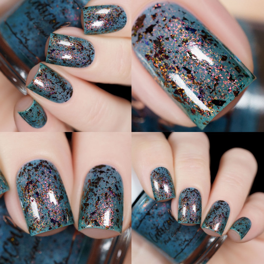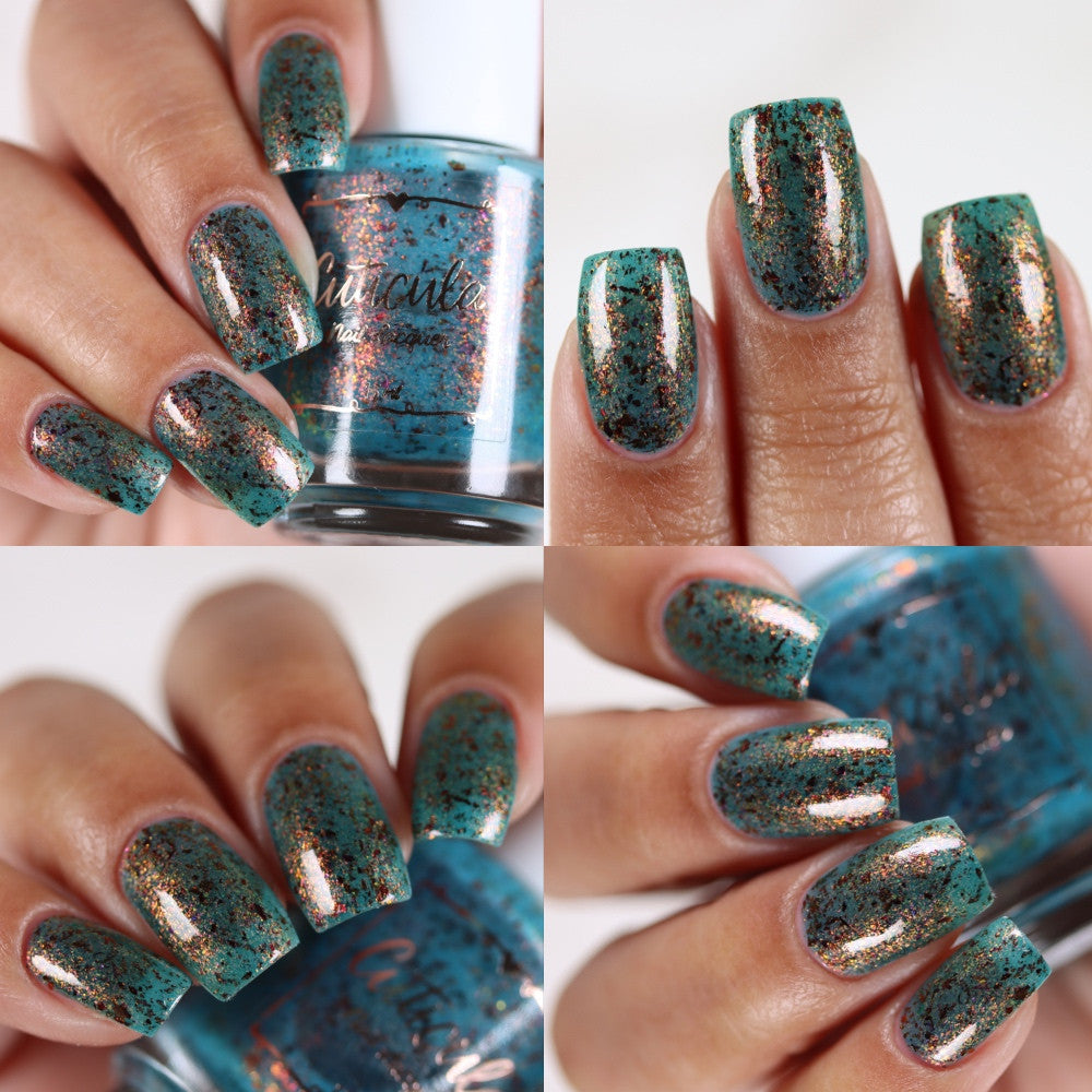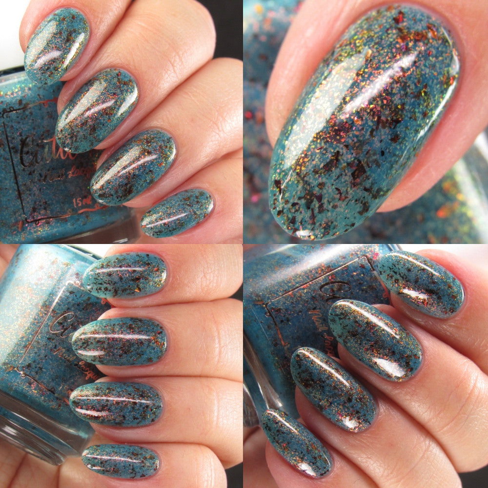 'Tranquili-tea' a turquoise base with large orange/gold/green shifting shimmer and black/red/green/gold ultra chrome shifting flakes. For best results, start with any of our available base coats and finish off your mani with any of our available top coats. Swatches by: @caitlinswatches @a_painted_queen @llaurenails @mikkelz_nails @captivated_by_grace @gotnail @yyulia_m @lovelylacquerist @lacquer_enthusiast33 @polishedjunesong This nail polish is 5 Free Ingredients: Nitrocellulose, Ethyl Acetate, Butyl Acetate, Isopropyl Alcohol, Ethyl Alcohol, Triphenyl Phosphate, Propyl Acetate, n-Butyl Alcohol, Colorants.