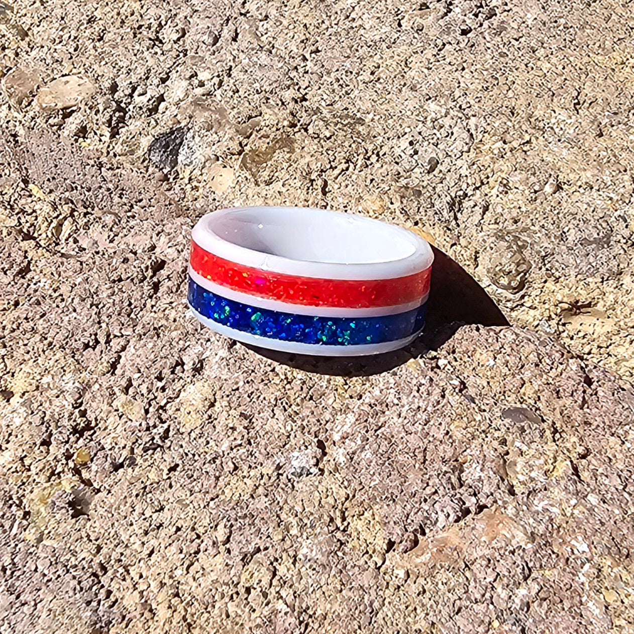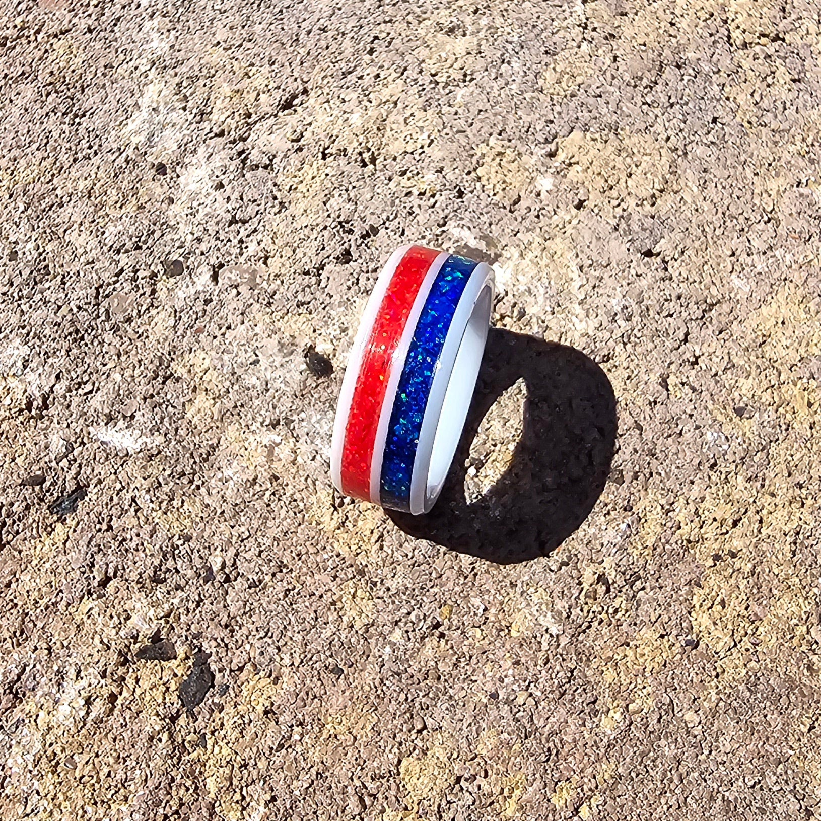 Double channel white ceramic, inlayed with red and blue opals, red and blue diamond dust, size 7.5