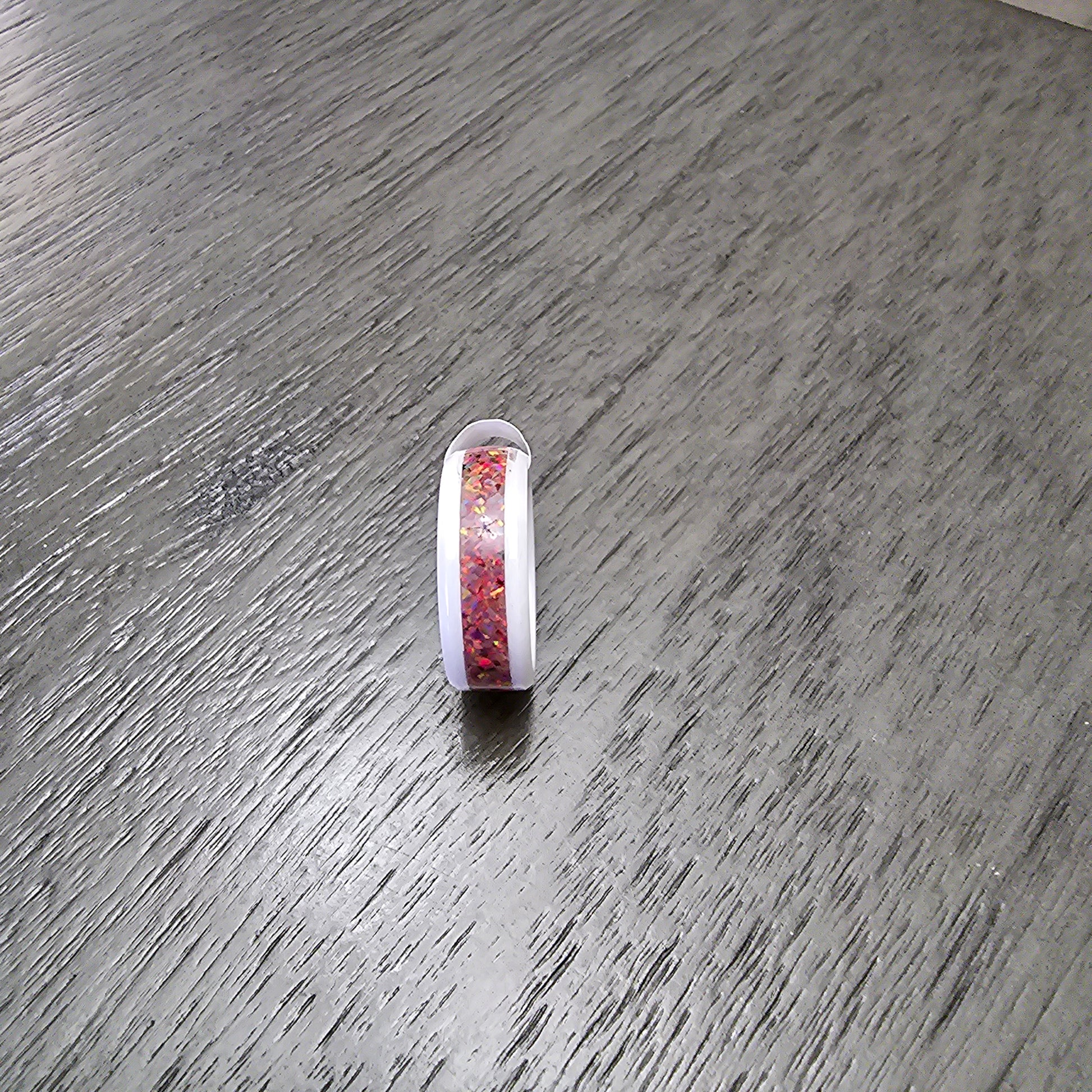 8mm white ceramic inlayed with maroon opals, size 9