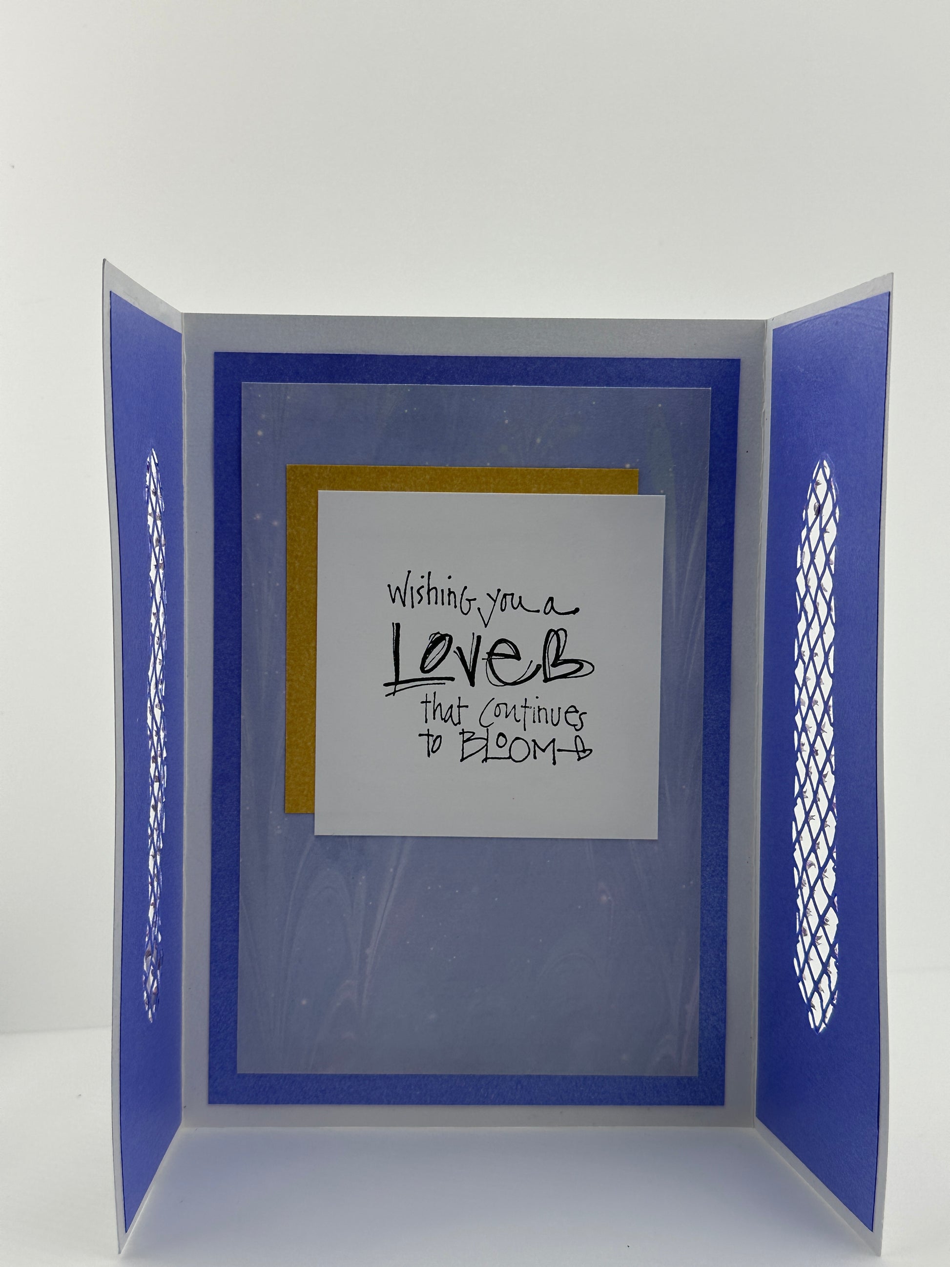 Wedding Card Gates with an envelope. Inside text "Wishing you a Love that continues to Bloom". FRONT COLORS OF CARD WILL VARY. Approximate size of card is 4.5"x6.5".