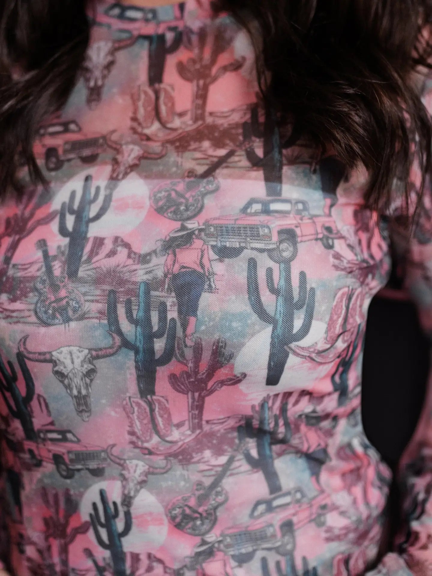 Embrace the sunset vibes with this playful pink mesh long sleeve top. Its lightweight, breathable fabric keeps you cool while adding a touch of western flair to your look. Perfect for layering or wearing solo, it’s a fun way to brighten up any outfit with a hint of sunset-inspired charm.